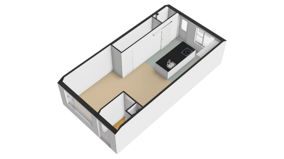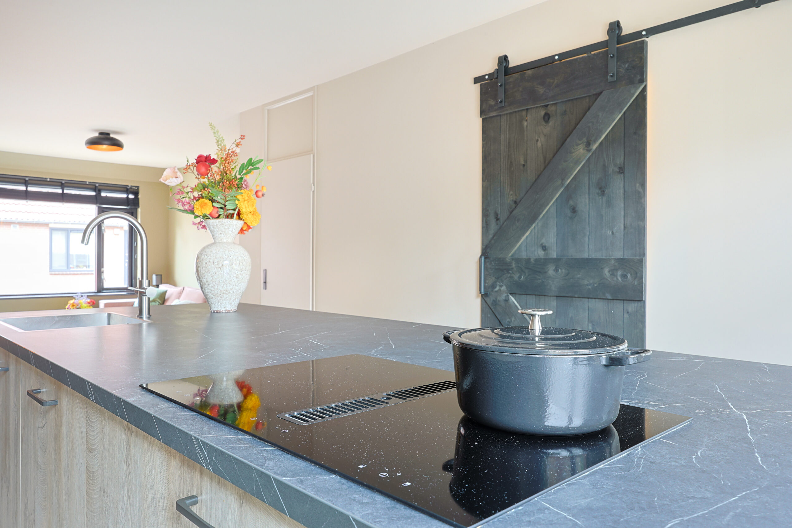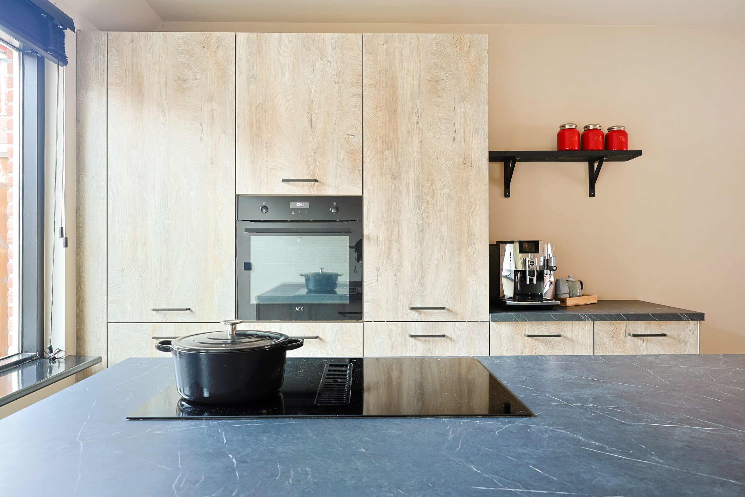 – Vrije moderne inbouwkeuken voorzien van apparaten, wand en kookeiland.