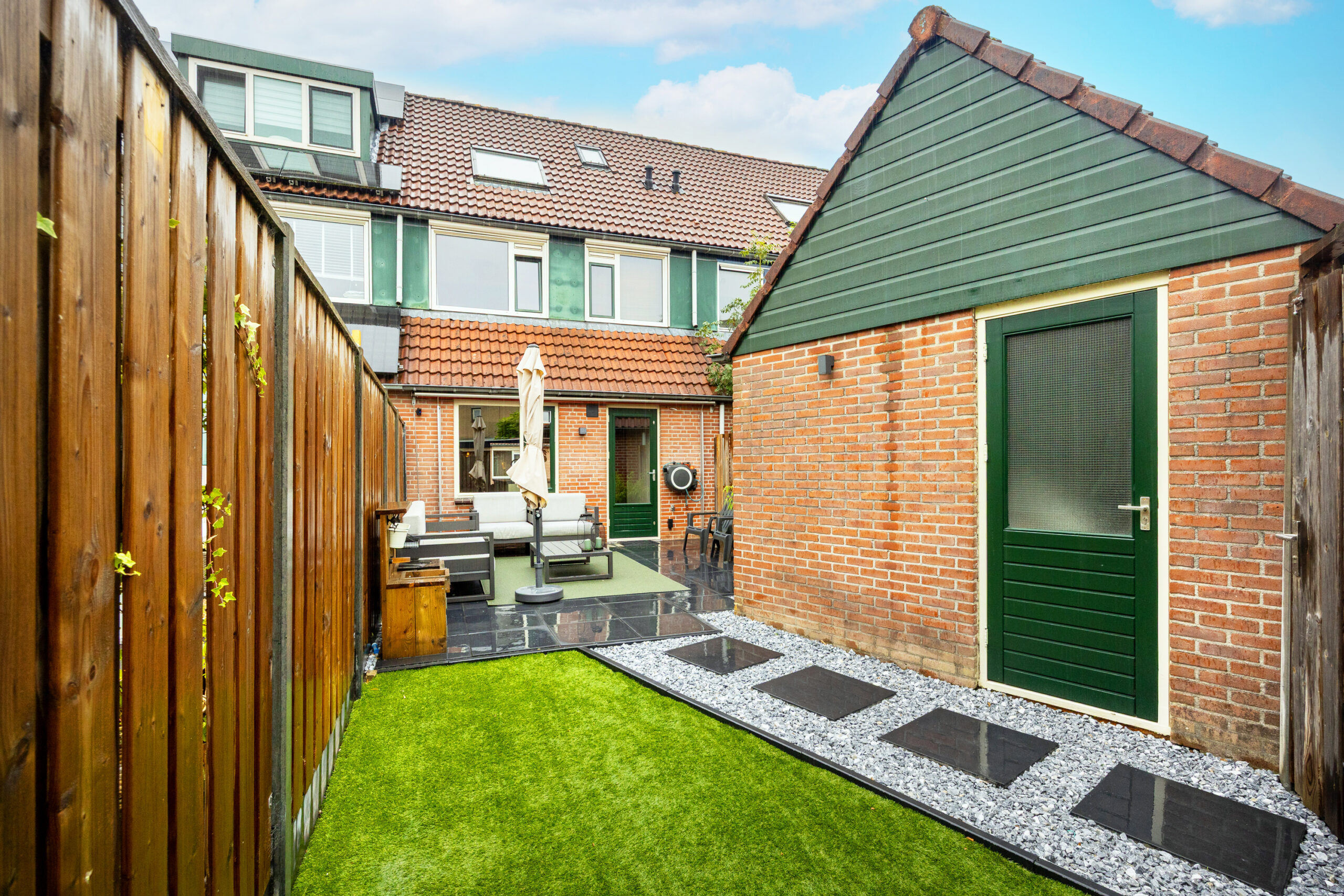 – De achtertuin is voorzien van een achterom en een vrijstaande stenen berging.