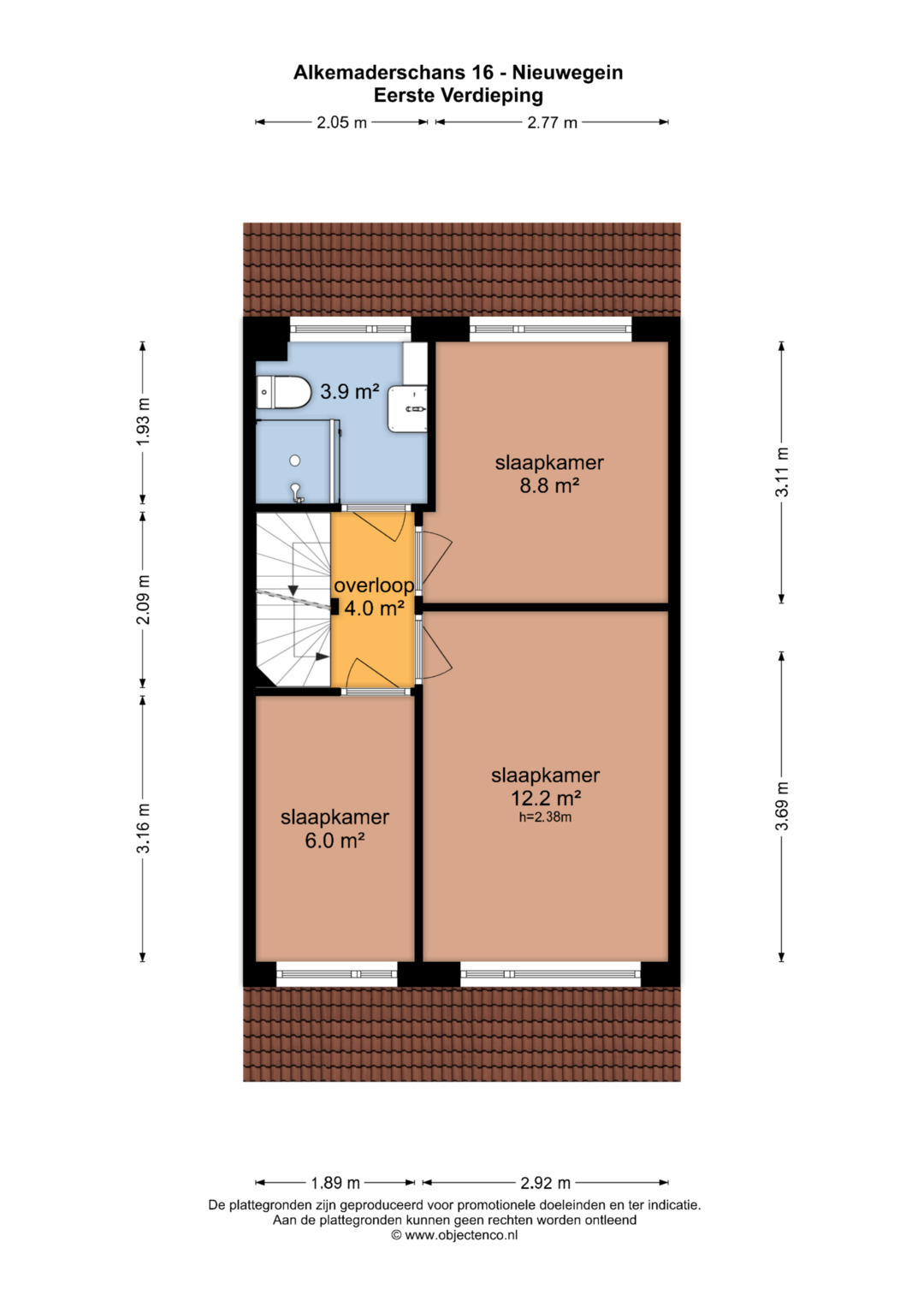 1STE VERDIEPING: Ruime overloop met toegang naar drie mooie slaapkamers van respectievelijk circa 12,2 m2, 8,8 m2 en 6 m2. De keurige badkamer is voorzien van een douchecabine, 2e toilet en een wastafel meubel.