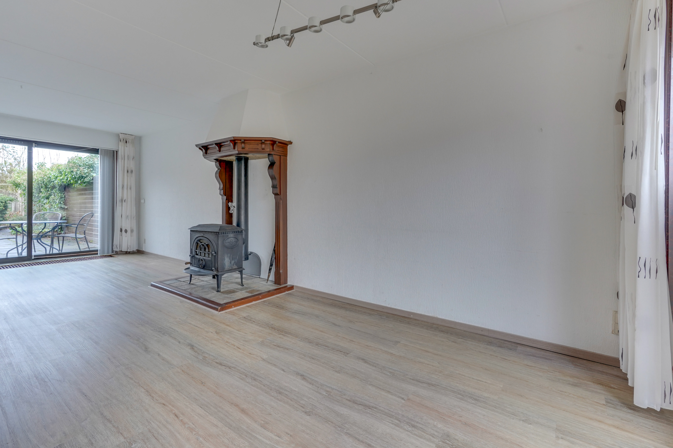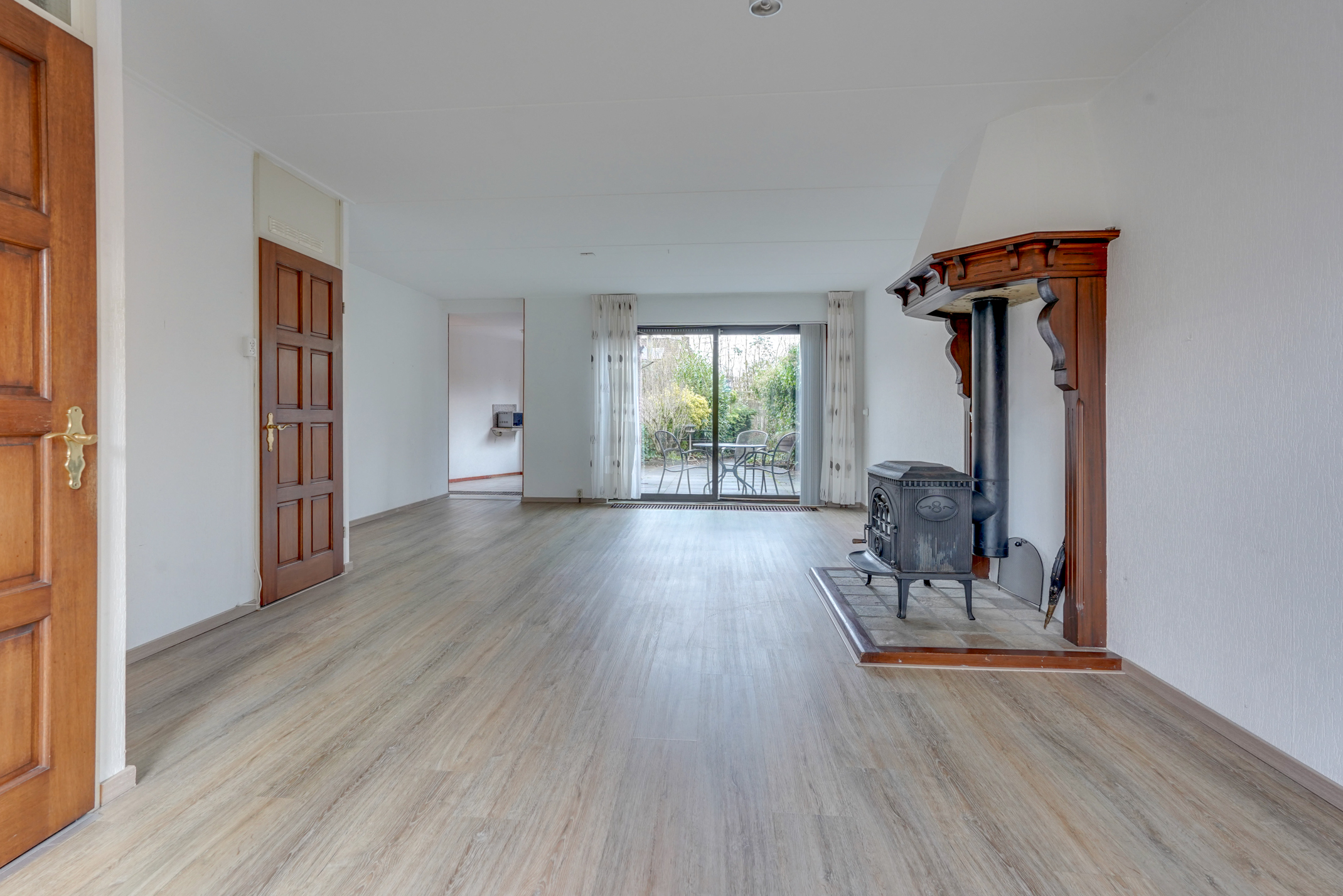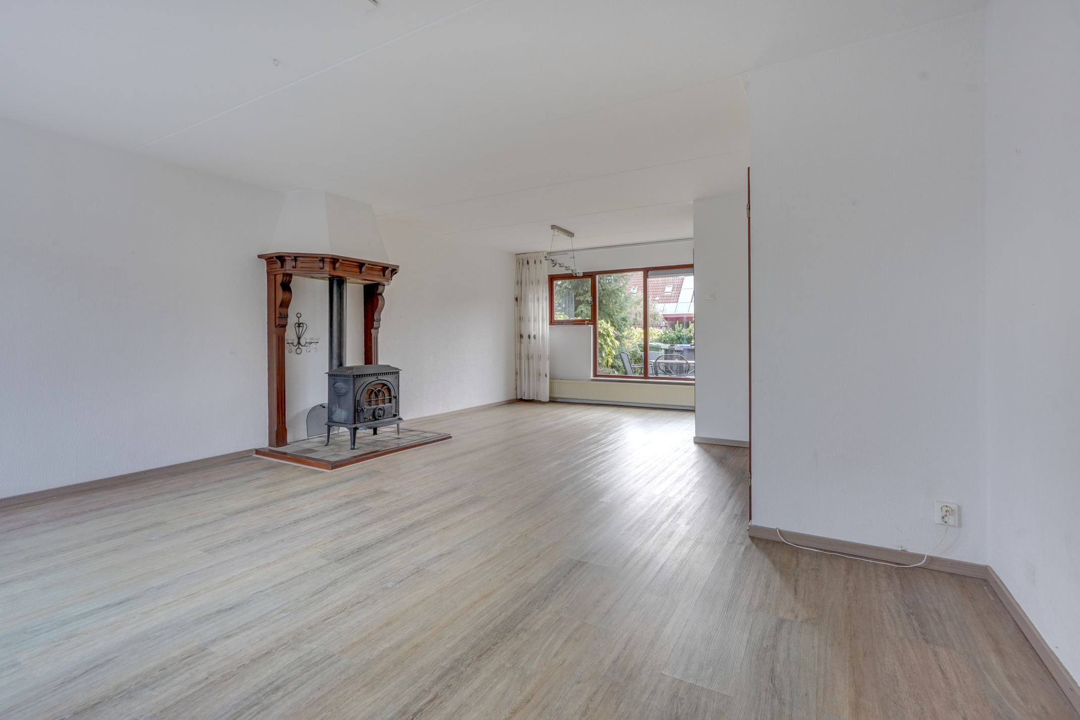 Vanuit de hal kom je in de ruime, lichte woonkamer met een fraaie houtkachel/allesbrander. De woonkamer biedt prettig uitzicht op zowel de voor- als achtertuin en geeft via een schuifpui toegang tot de achtertuin. Daarnaast is er een handige trapkast aanwezig voor extra bergruimte. Aansluitend bevindt zich de keuken, voorzien van diverse inbouwapparatuur en eveneens met toegang tot de achtertuin. Vanuit de keuken is de bijkeuken bereikbaar, in te delen na eigen wensen. Via de bijkeuken is er bovendien een doorloop naar de royale garage. De garage is ruim genoeg voor het stallen van een auto of een motor, maar kan ook uitstekend dienen als praktijk-, hobby- of werkruimte. De besloten achtertuin is fraai aangelegd, beschikt over een achterom en is gelegen op het zonnige zuidoosten. Hierdoor kun je hier al vroeg op de dag van de zon genieten. Een fijne, rustige plek met voldoende ruimte voor een terras en groen, ideaal voor gezinnen en tuinliefhebbers.