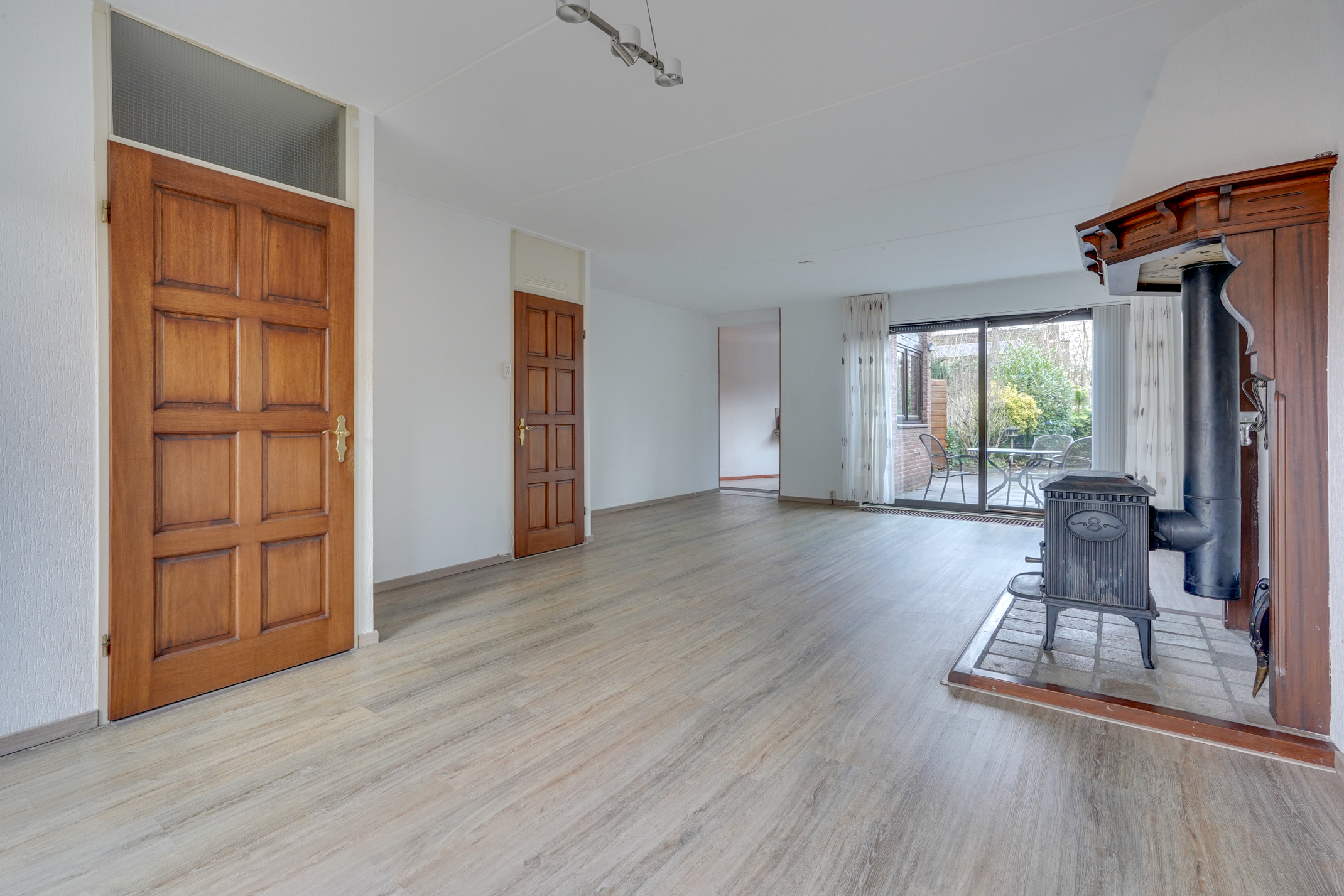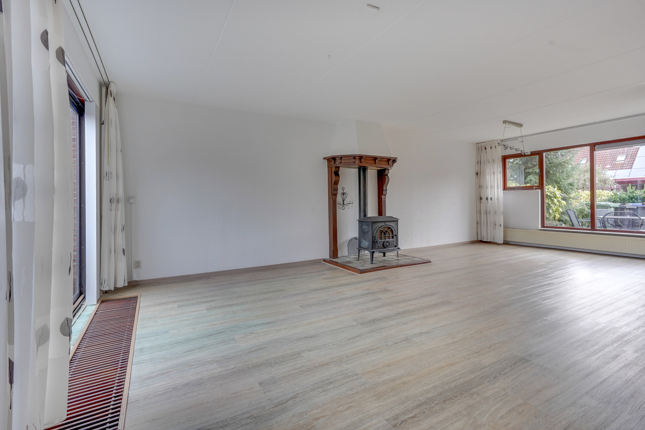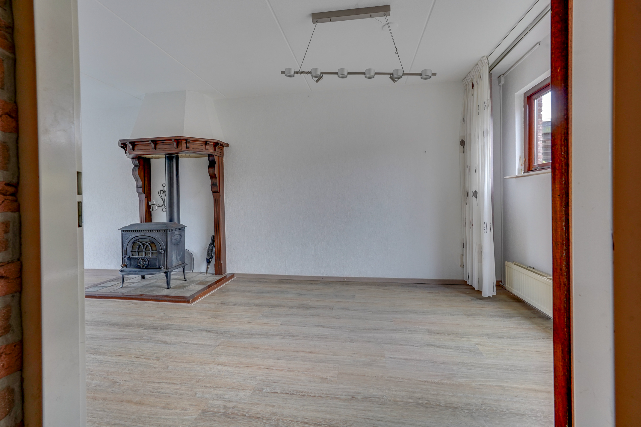 Vanuit de hal kom je in de ruime, lichte woonkamer met een fraaie houtkachel/allesbrander. De woonkamer biedt prettig uitzicht op zowel de voor- als achtertuin en geeft via een schuifpui toegang tot de achtertuin. Daarnaast is er een handige trapkast aanwezig voor extra bergruimte. Aansluitend bevindt zich de keuken, voorzien van diverse inbouwapparatuur en eveneens met toegang tot de achtertuin. Vanuit de keuken is de bijkeuken bereikbaar, in te delen na eigen wensen. Via de bijkeuken is er bovendien een doorloop naar de royale garage. De garage is ruim genoeg voor het stallen van een auto of een motor, maar kan ook uitstekend dienen als praktijk-, hobby- of werkruimte. De besloten achtertuin is fraai aangelegd, beschikt over een achterom en is gelegen op het zonnige zuidoosten. Hierdoor kun je hier al vroeg op de dag van de zon genieten. Een fijne, rustige plek met voldoende ruimte voor een terras en groen, ideaal voor gezinnen en tuinliefhebbers.