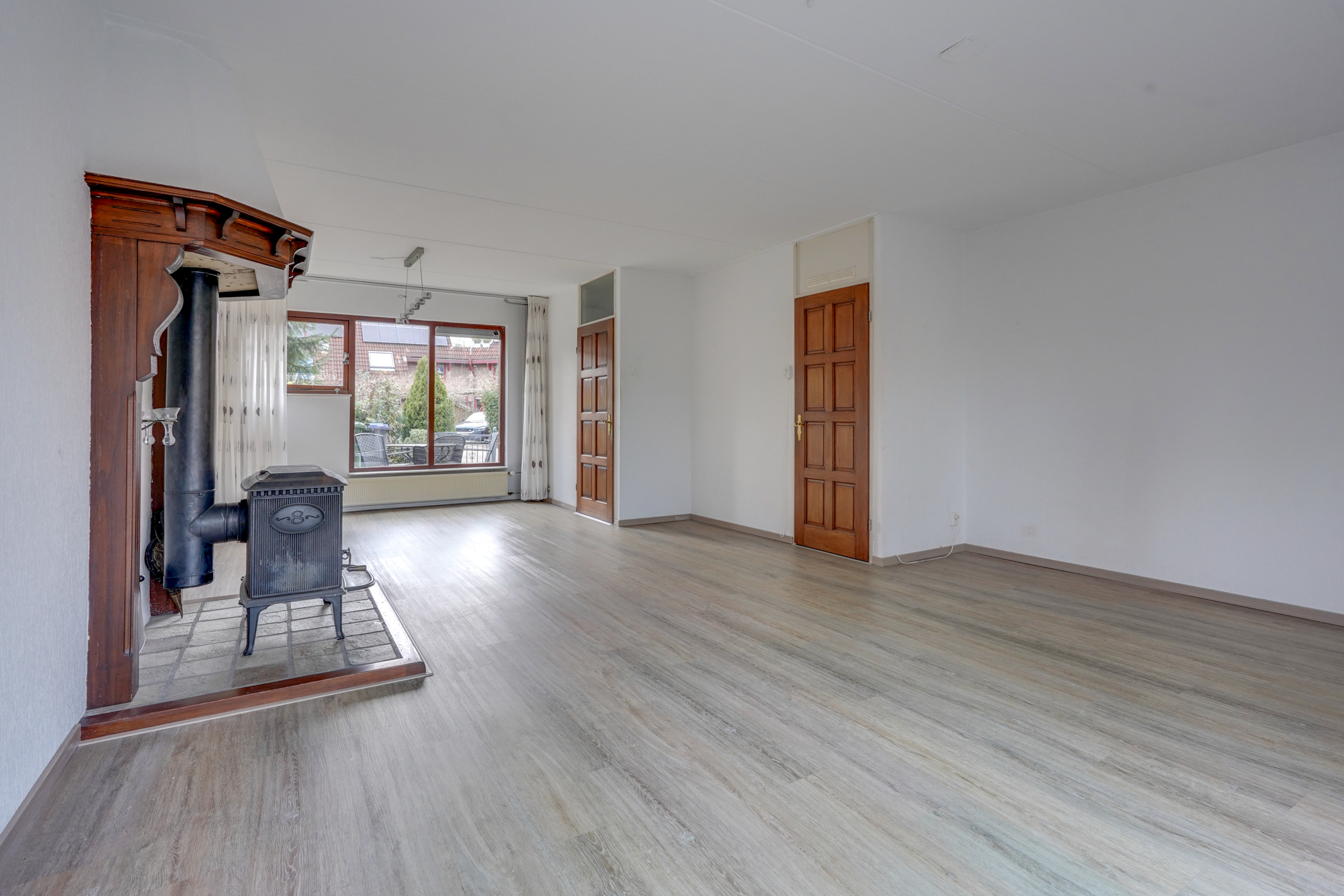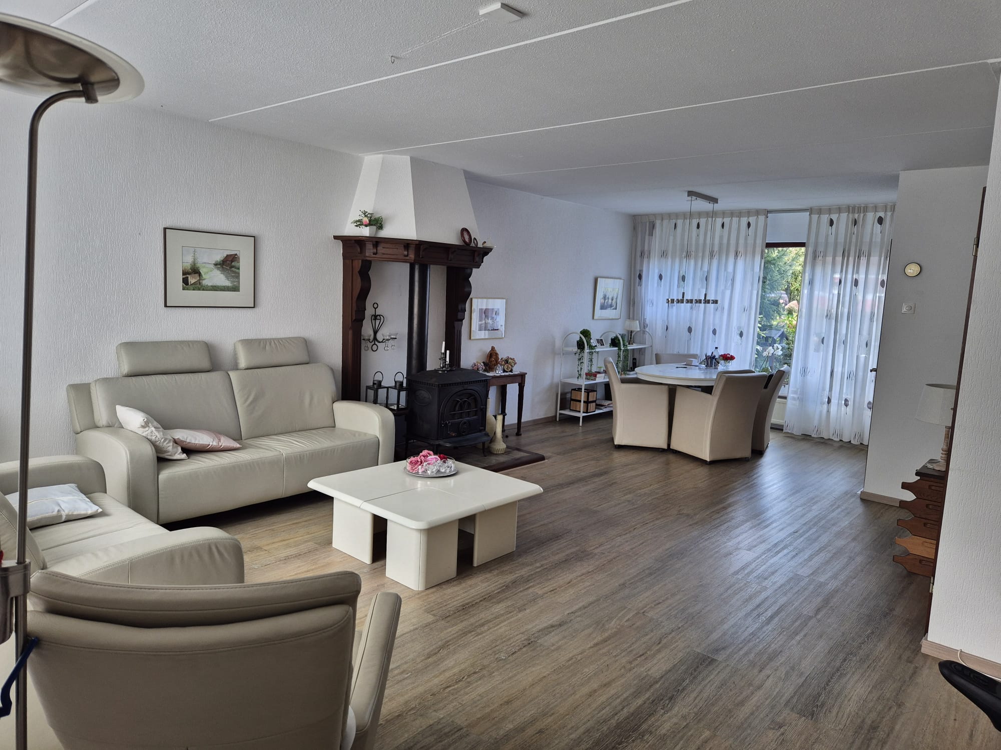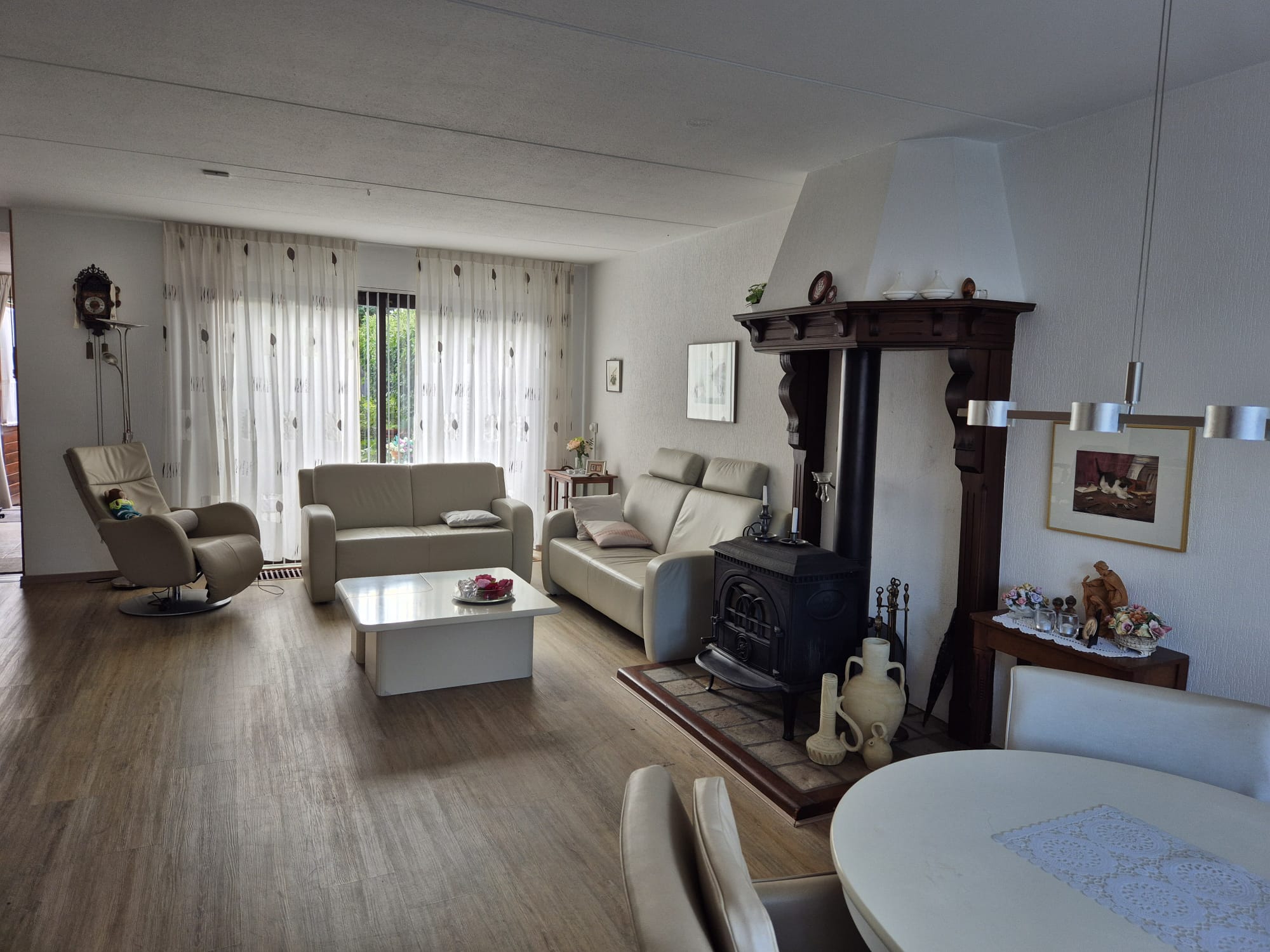 – De woon-/eetkamer is ruim en licht en biedt prettig uitzicht over de voor-/achtertuin.