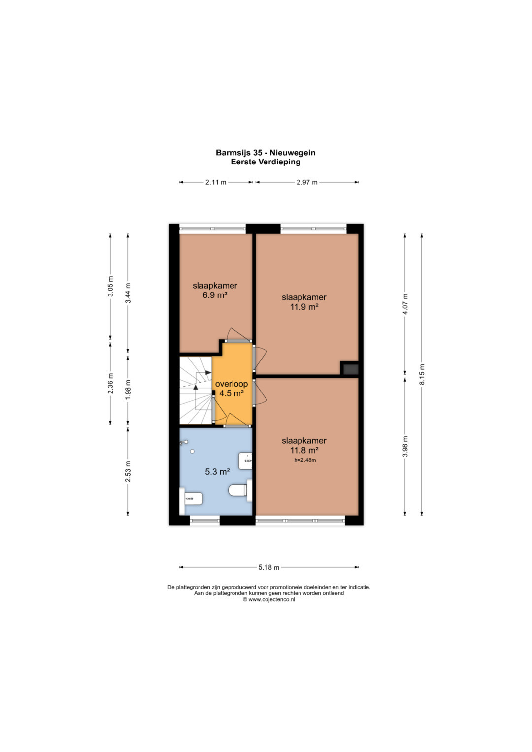 1e Verdieping: Overloop met toegang tot drie keurige slaapkamers van respectievelijk circa 11,9 m², 11,8 m² en 6,9 m². De badkamer is opvallend ruim en voorzien van een inloopdouche, zwevend toilet, bidet, wastafel en een designradiator.