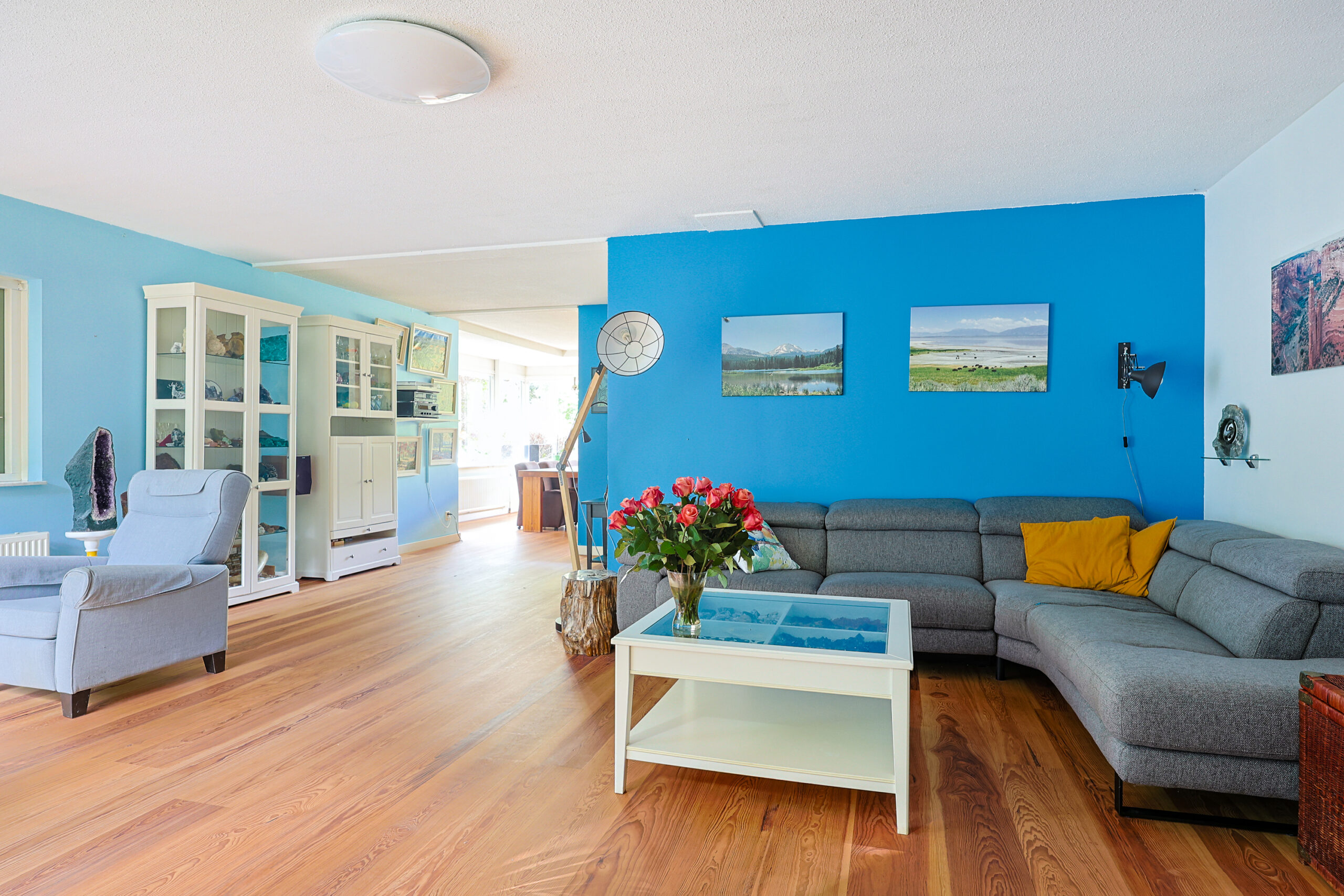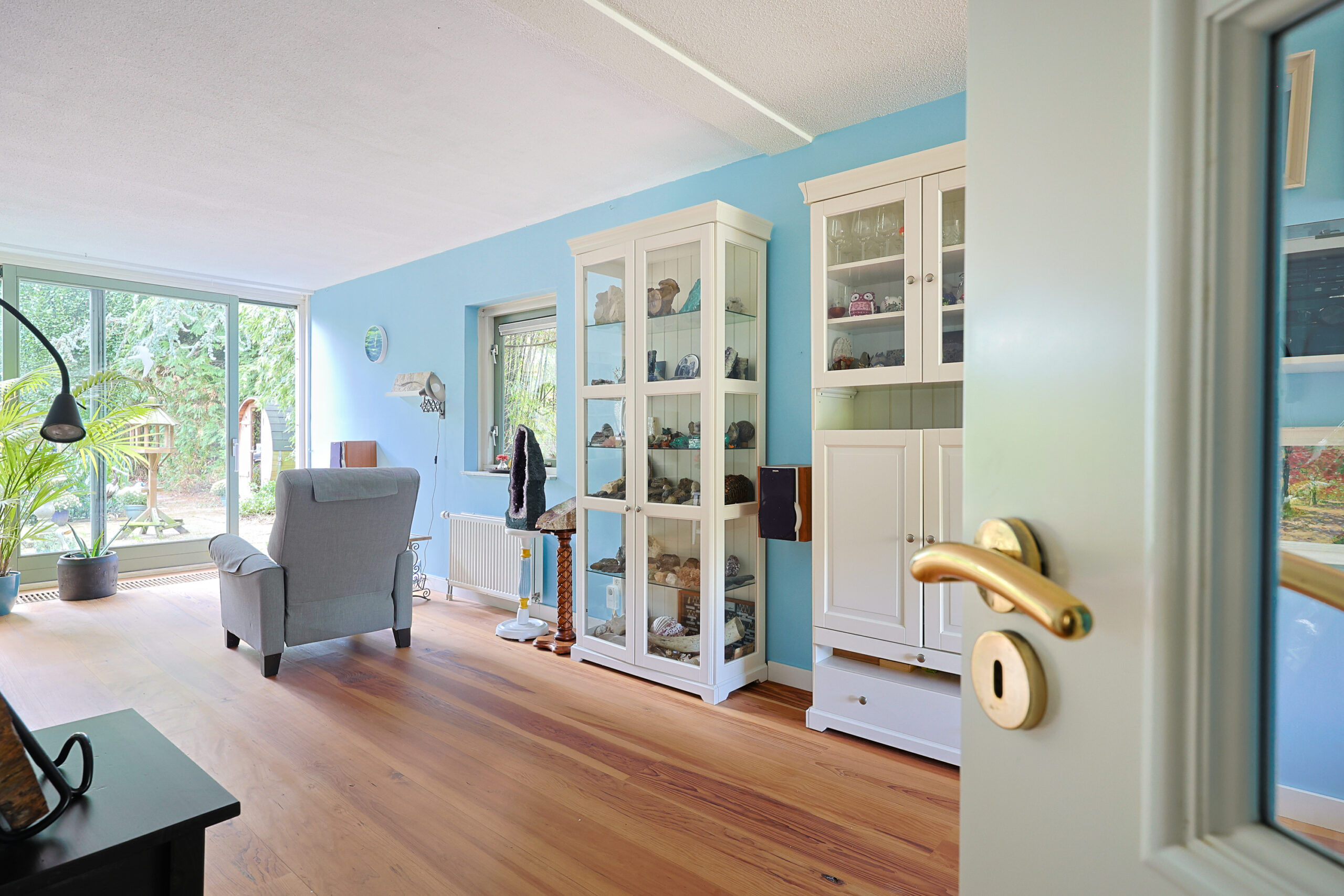 • De begane grond is grotendeels voorzien van brede Amerikaans grenen plankenvloer.