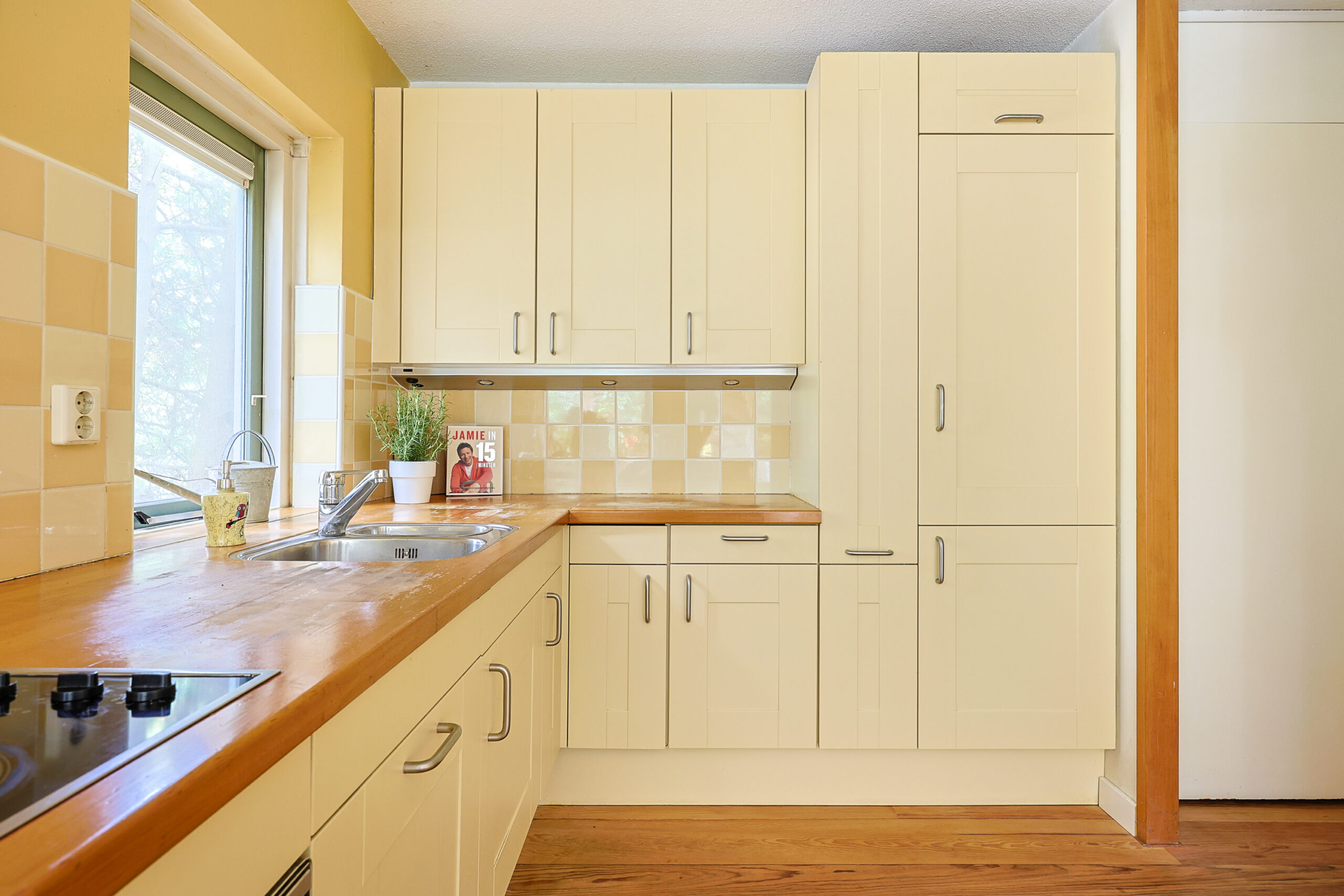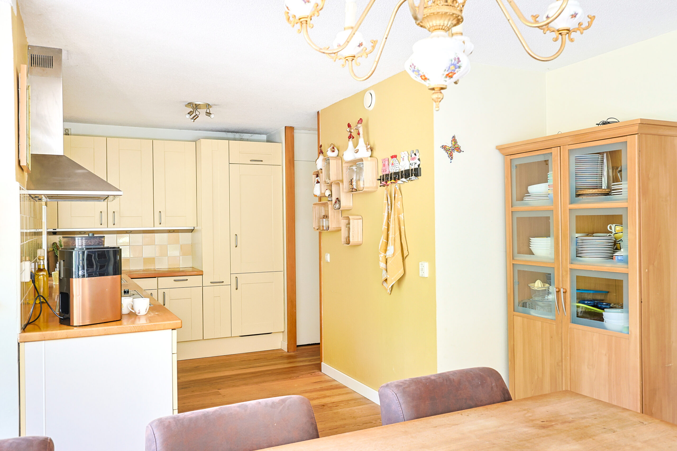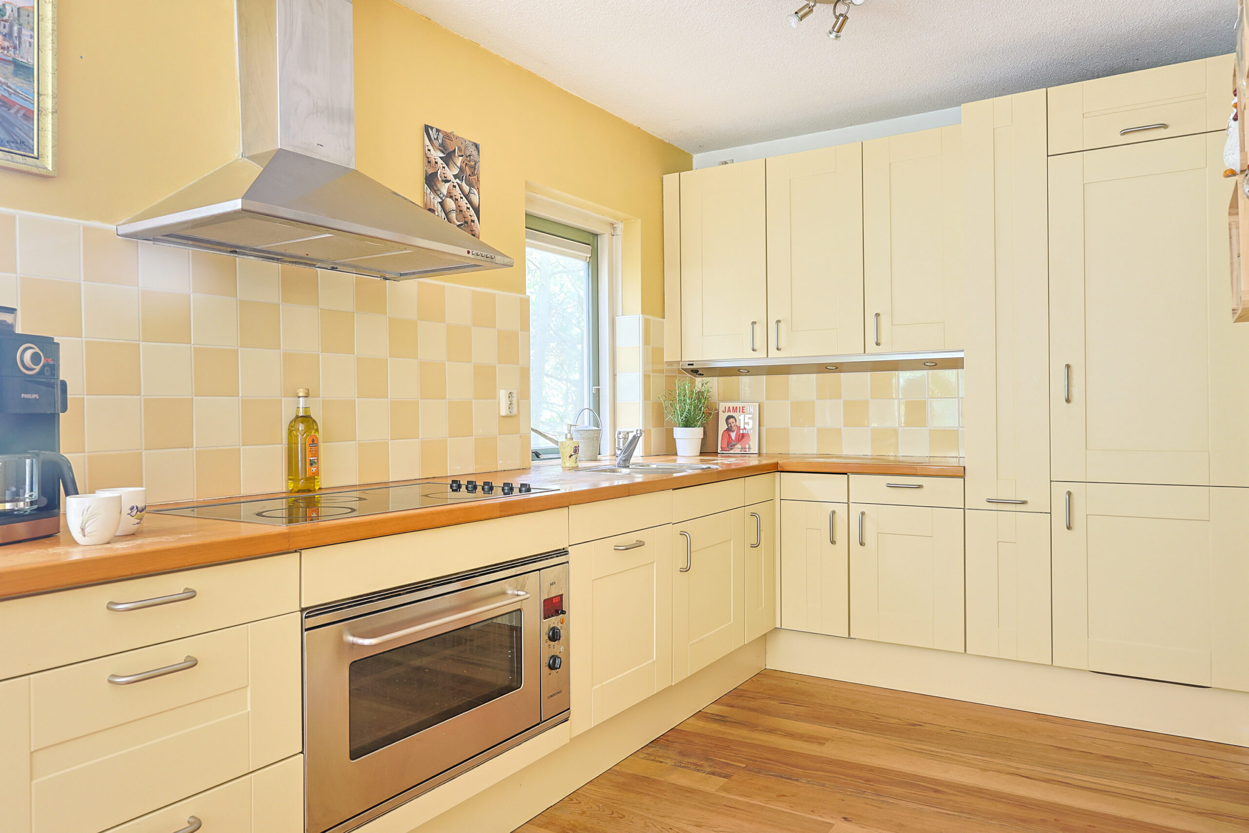 • Luxe en sfeervolle keuken met inrichting in L-opstelling en o.a. voorzien van 5-pits kookplaat, 90cm brede oven, RVS afzuigkap, vaatwasmachine, koel-/vriescombinatie en apothekerskast.