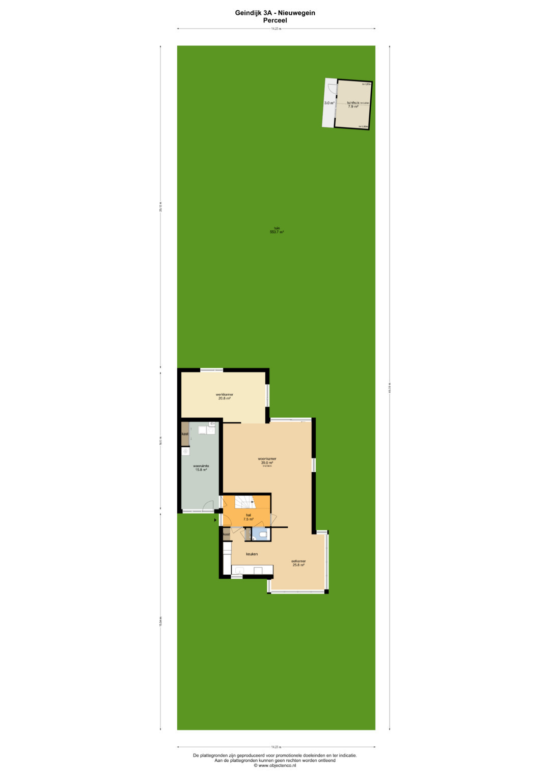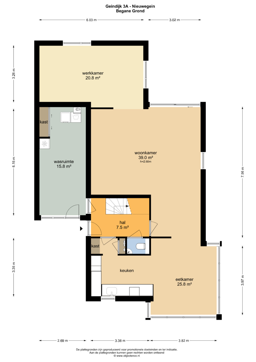 BEGANE GROND: Entree, hal met luxe toiletruimte en trapopgang. Tussenhal met meterkast en toegang naar de ruime en sfeervolle eetkeuken welke is voorzien van inrichting in L-opstelling met diverse inbouwapparatuur waaronder een 5-pits keramische kookplaat. Tuingerichte woonkamer met Amerikaans grenen planken vloer en schuifpui naar de achtertuin en doorgang naar de werk-/studeerkamer aan de achterzijde van ca. 19 m². Vanuit de hal toegang naar de ruime kantoor-/praktijkruimte van ca. 16,5 m² welke tevens een eigen entree heeft, waardoor deze ideaal is voor bv. praktijk aan huis.