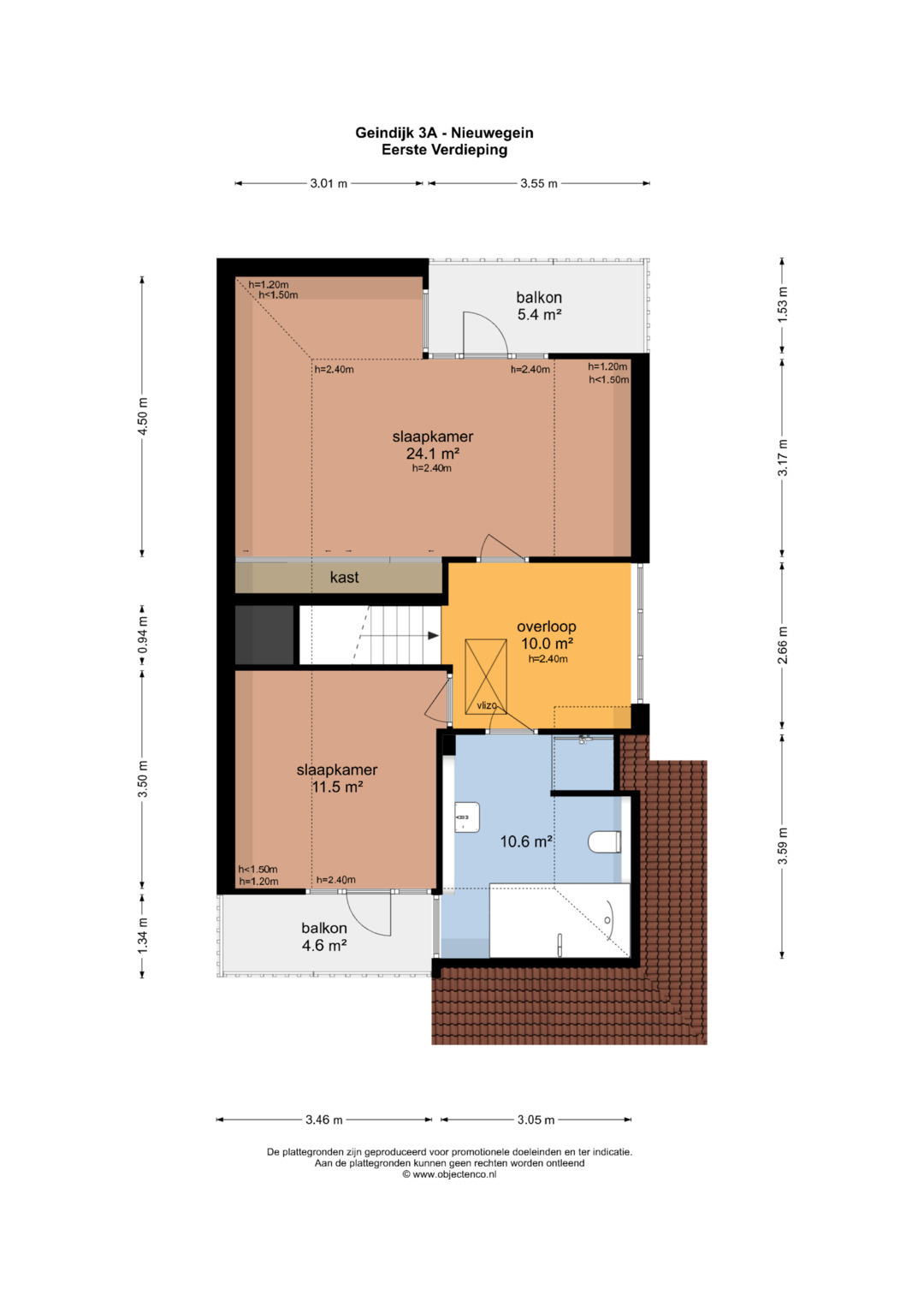 1e VERDIEPING: Overloop met toegang naar 2 ruime slaapkamers van respectievelijk ca. 24 m² en 11 m², beiden met een eigen balkon. De slaapkamer aan de achterzijde is voorzien van een vaste kast en is eventueel op te splitsen waardoor een extra slaapkamer kan worden gerealiseerd. Volledig betegelde, luxe badkamer met whirlpool, design wastafel, aparte douche en 2e toilet.