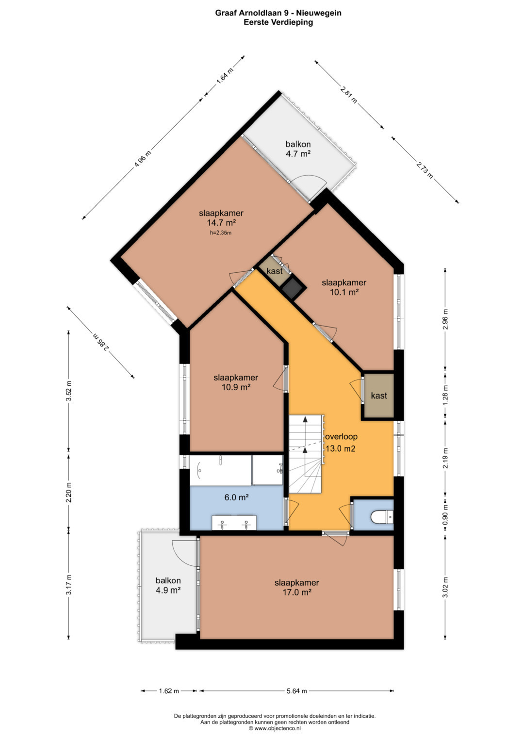 1E VERDIEPING: De ruime overloop biedt toegang tot een viertal goed bemeten slaapkamers van ca. 17,0 m2, 14,7 m2, 10,9 m2 en 10,1 m2, alsmede de badkamer met ligbad, douche-cabine, dubbele wastafel en designradiator. Ook is er een separate toiletruimte. De twee grootste slaapkamers beschikken daarnaast over een sfeervol eigen balkon (gesitueerd op het westen en het noordoosten).