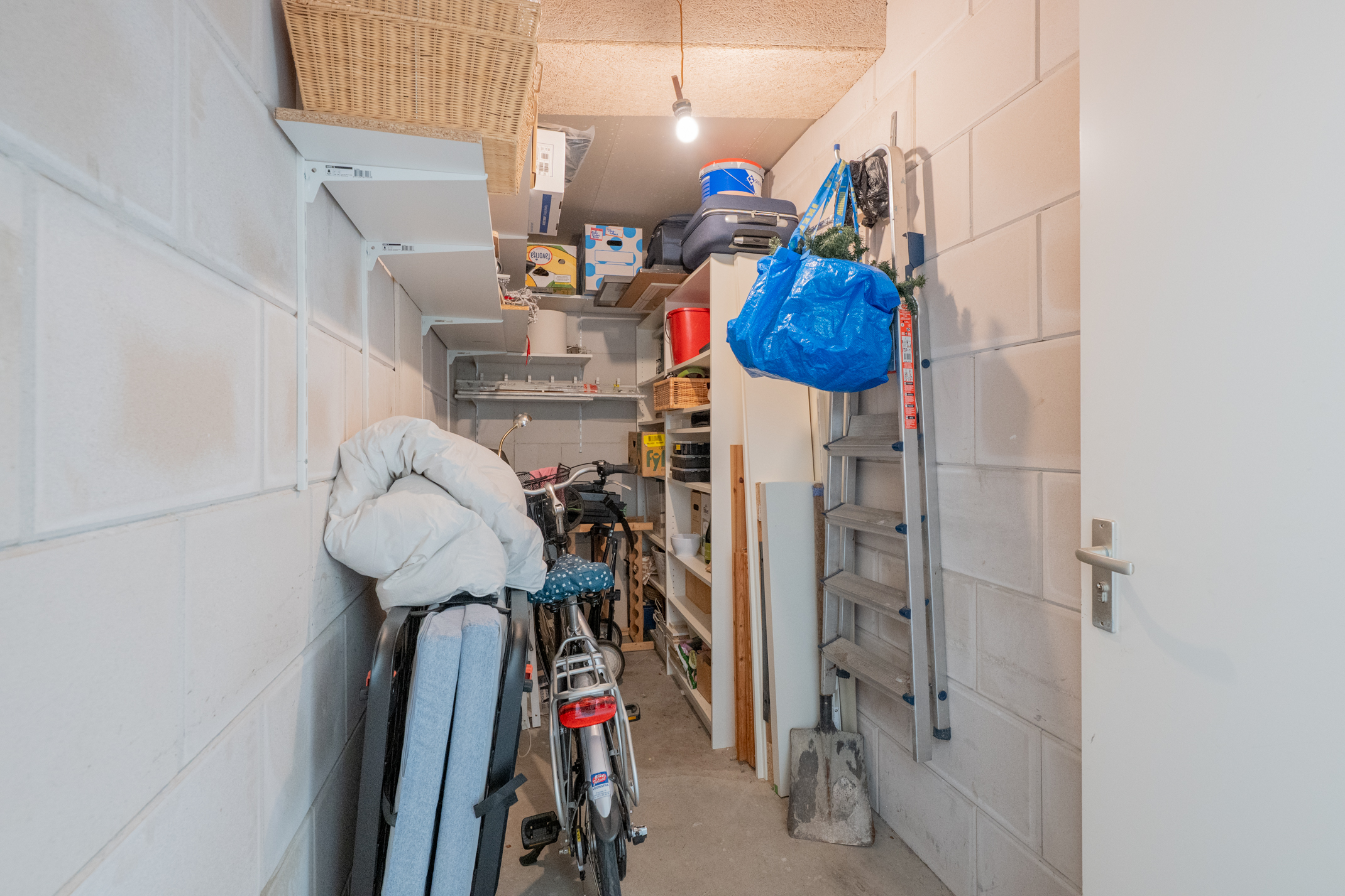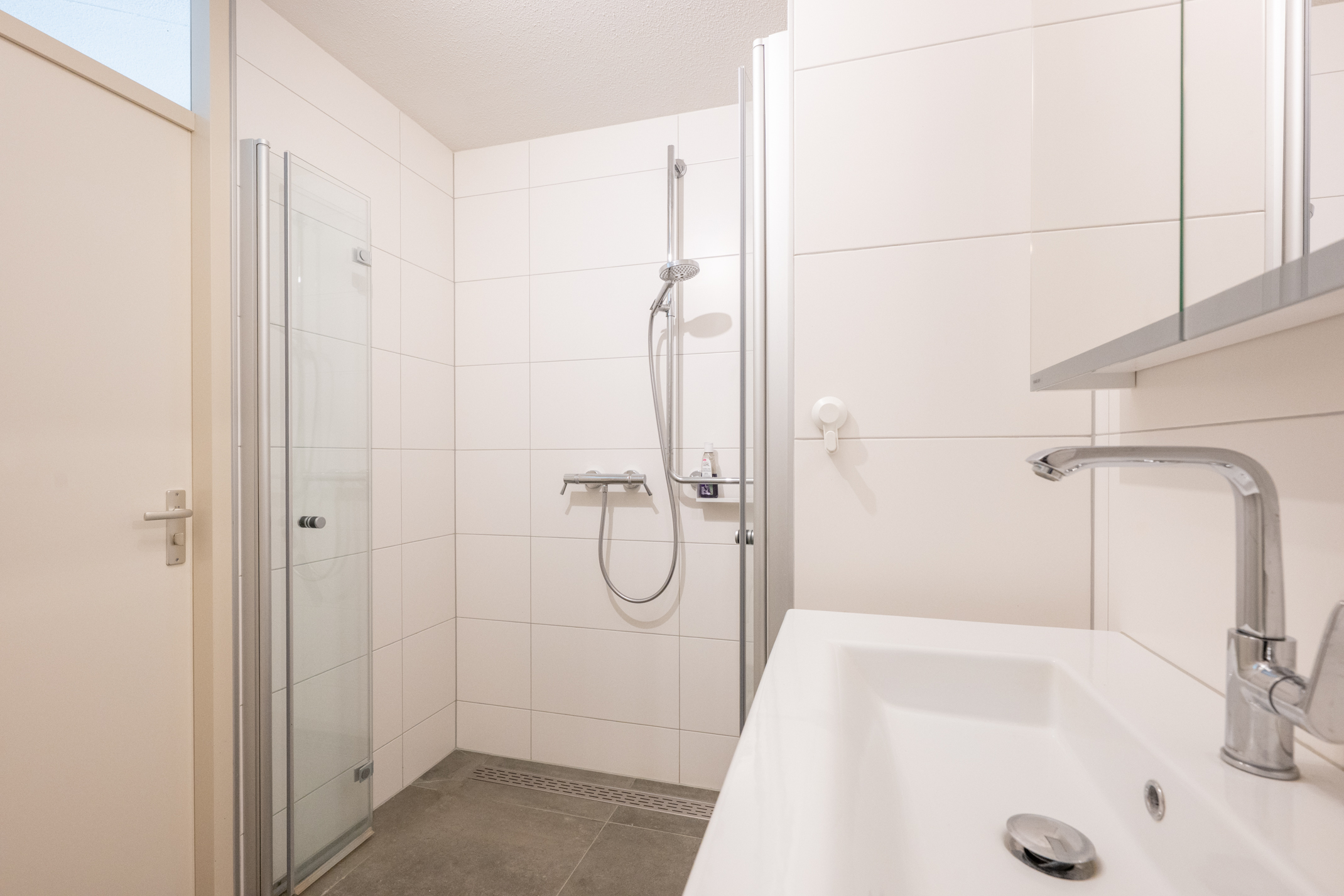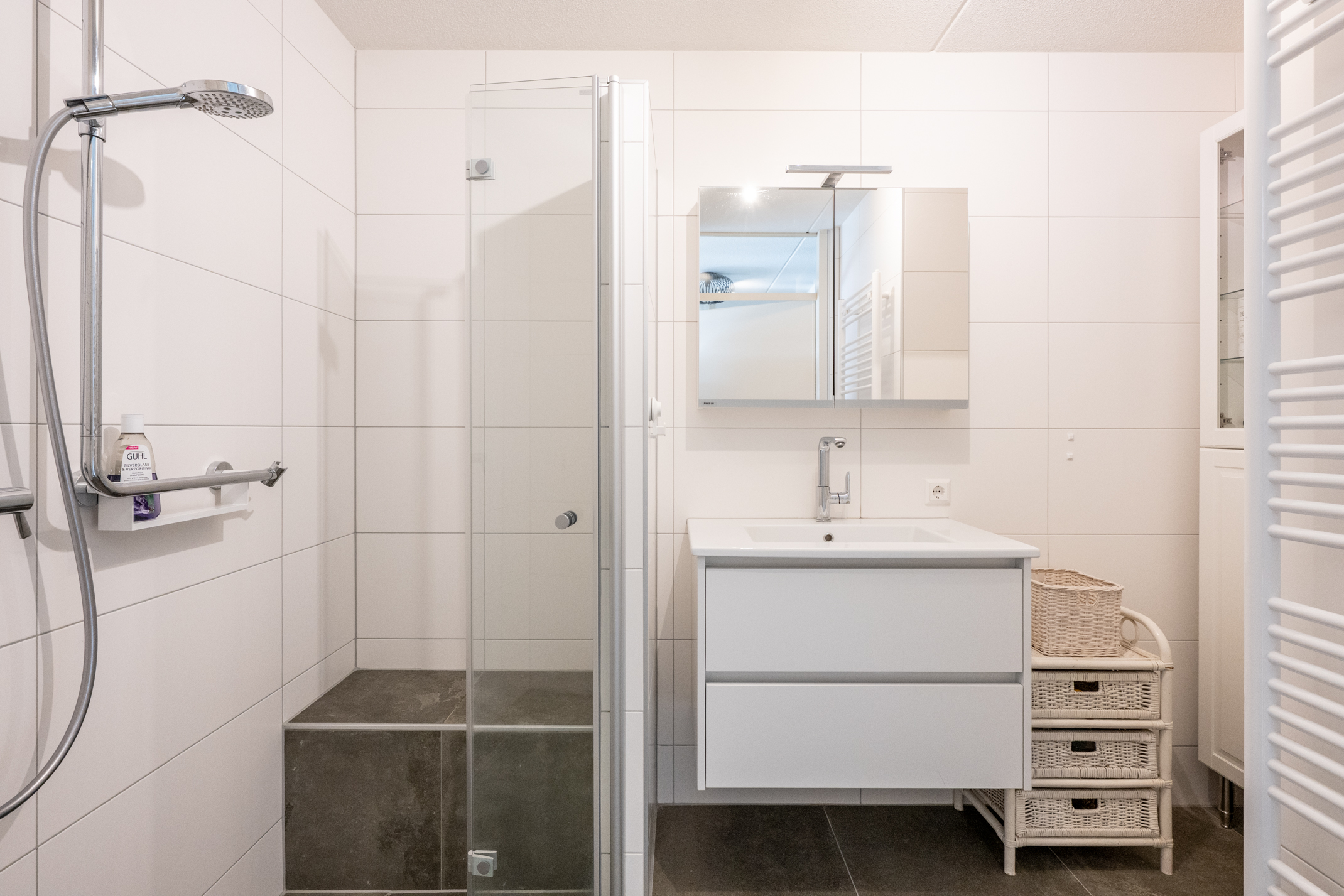 De badkamer is recent gemoderniseerd en is geheel betegeld in een lichte kleurstelling. De badkamer is voorzien van een inloopdouche met zitbankje, een wastafelmeubel en een designradiator. Een groot pluspunt, vooral wanneer je gasten ontvangt, is dat er een separate toiletruimte is. Deze ruimte is voorzien van toilet en een fonteintje. De royale inpandige bergruimte kan voor diverse doeleinden worden gebruikt. Ideaal als voorraadkast. Tevens bevinden zich hier de aansluitingen voor het wasapparatuur. De berging in de onderbouw biedt voldoende ruimte voor het bergen van uw vakantie- / kerst spullen of het stallen van bijvoorbeeld fietsen.