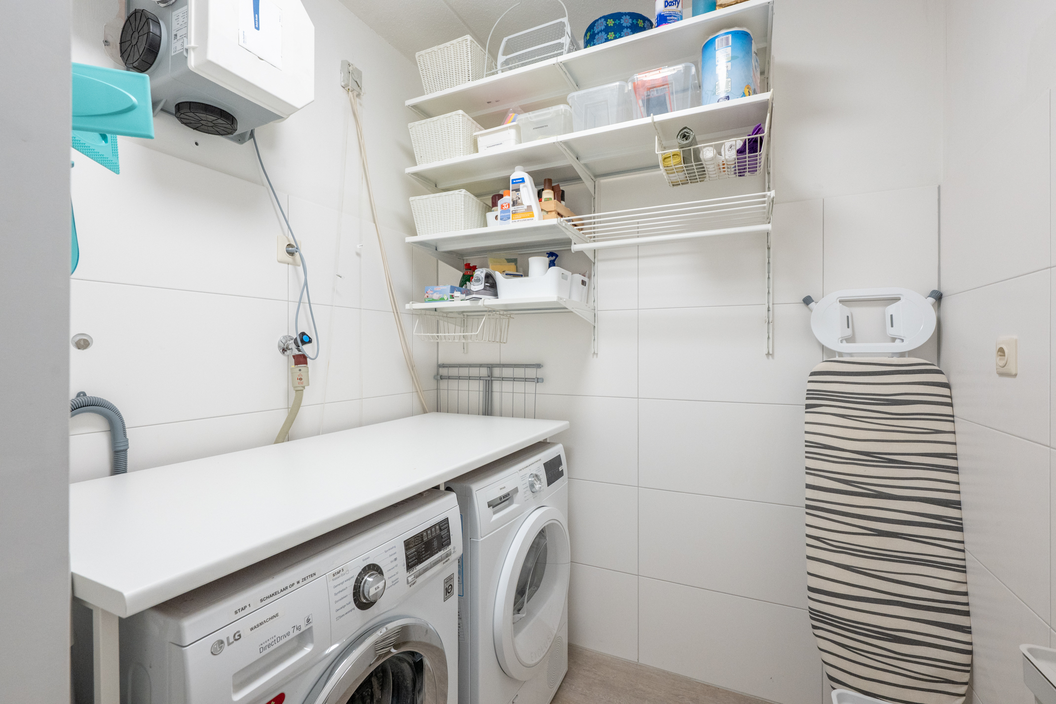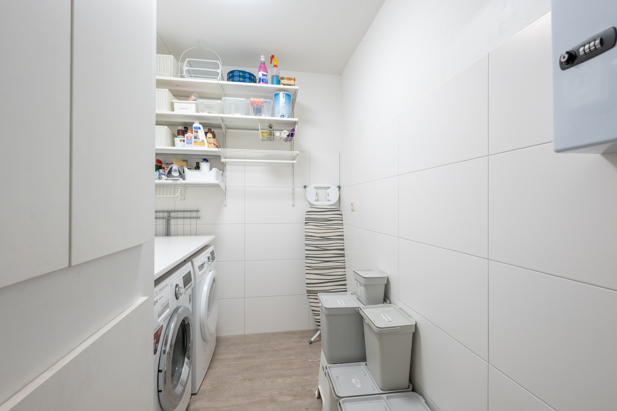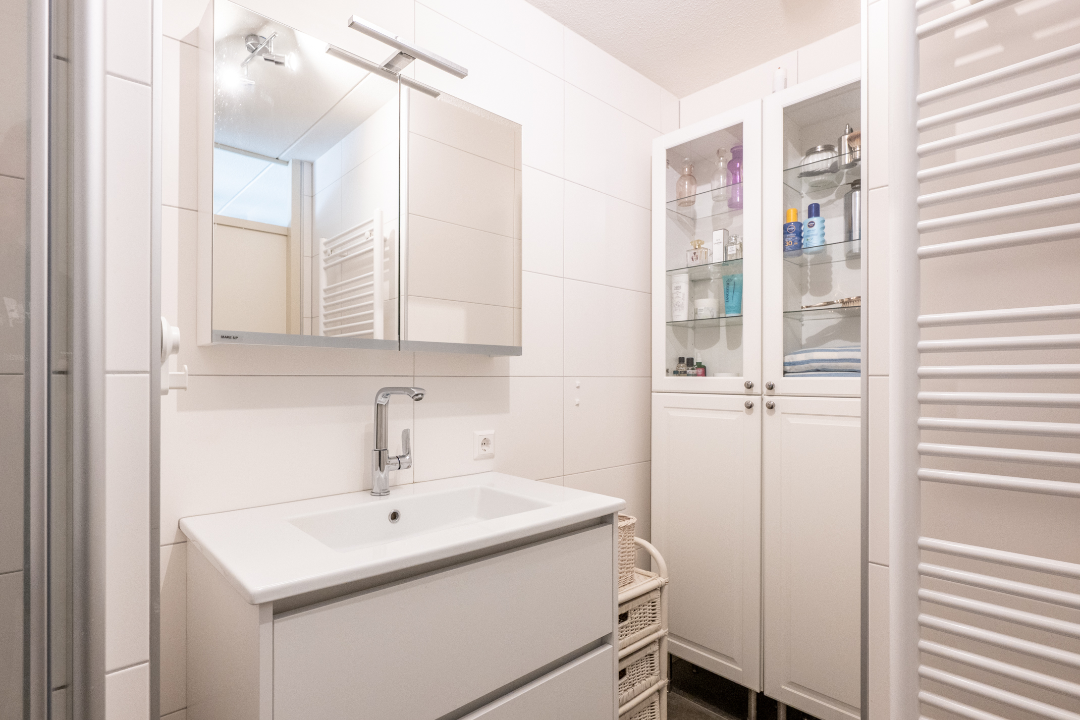 De badkamer is recent gemoderniseerd en is geheel betegeld in een lichte kleurstelling. De badkamer is voorzien van een inloopdouche met zitbankje, een wastafelmeubel en een designradiator. Een groot pluspunt, vooral wanneer je gasten ontvangt, is dat er een separate toiletruimte is. Deze ruimte is voorzien van toilet en een fonteintje. De royale inpandige bergruimte kan voor diverse doeleinden worden gebruikt. Ideaal als voorraadkast. Tevens bevinden zich hier de aansluitingen voor het wasapparatuur. De berging in de onderbouw biedt voldoende ruimte voor het bergen van uw vakantie- / kerst spullen of het stallen van bijvoorbeeld fietsen.