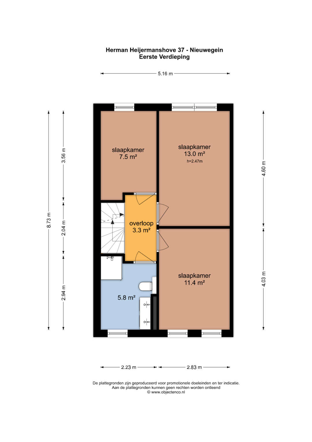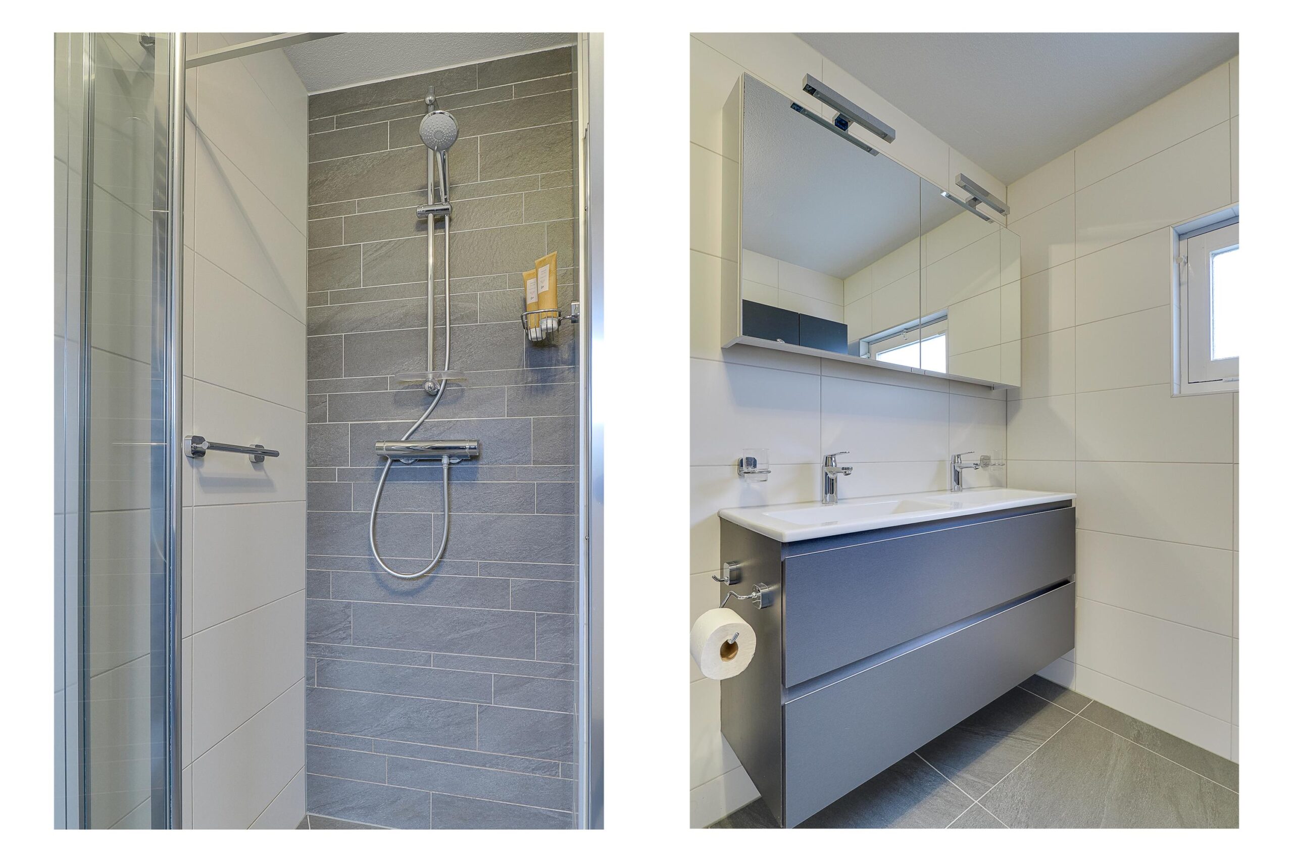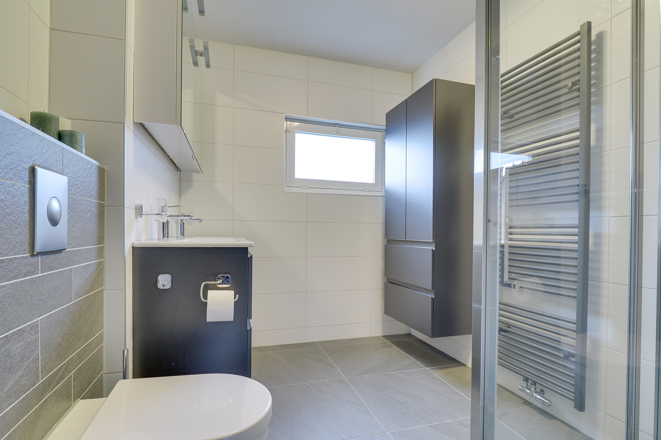 1e Verdieping: Overloop met toegang naar 3 slaapkamers van respectievelijk circa 7,5 m2, 13,0 m2 en 11,4 m2. De ruime badkamer is recent volledig gemoderniseerd en voorzien van inloopdouche, toilet, wastafelmeubel met twee kommen en designradiator.