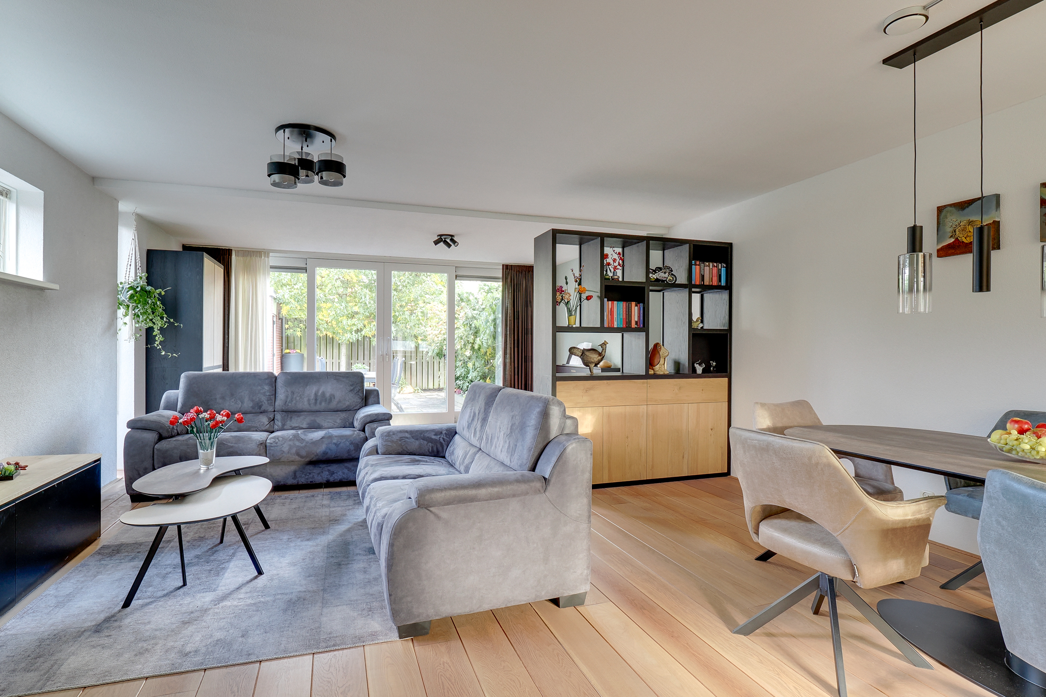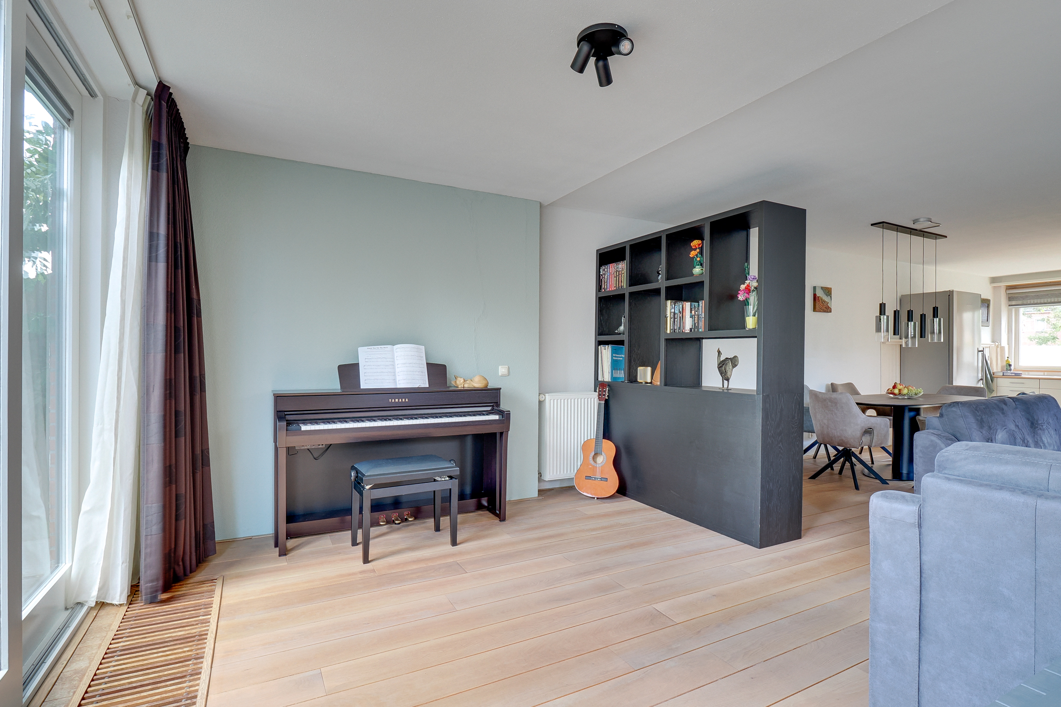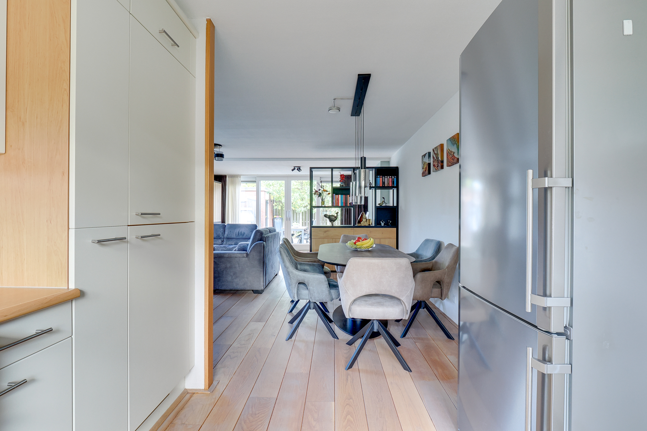Begane grond: Entree met keurige toiletruimte, meterkast en trapopgang. Vanuit de hal bereik je de ruime uitgebouwde woonkamer met aan de achterzijde een schuifpui naar de tuin , . Aan de voorzijde tref je de open keuken aan die voorzien is van een keurige inrichting in L-opstelling. Het totale woonoppervlak van de woonkamer en keuken bedraagt circa 47,2 m2.