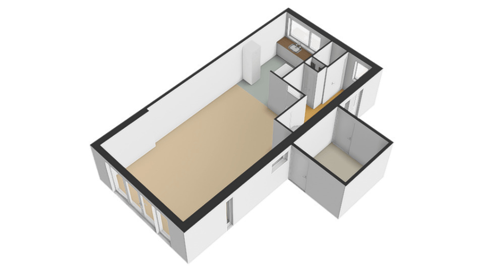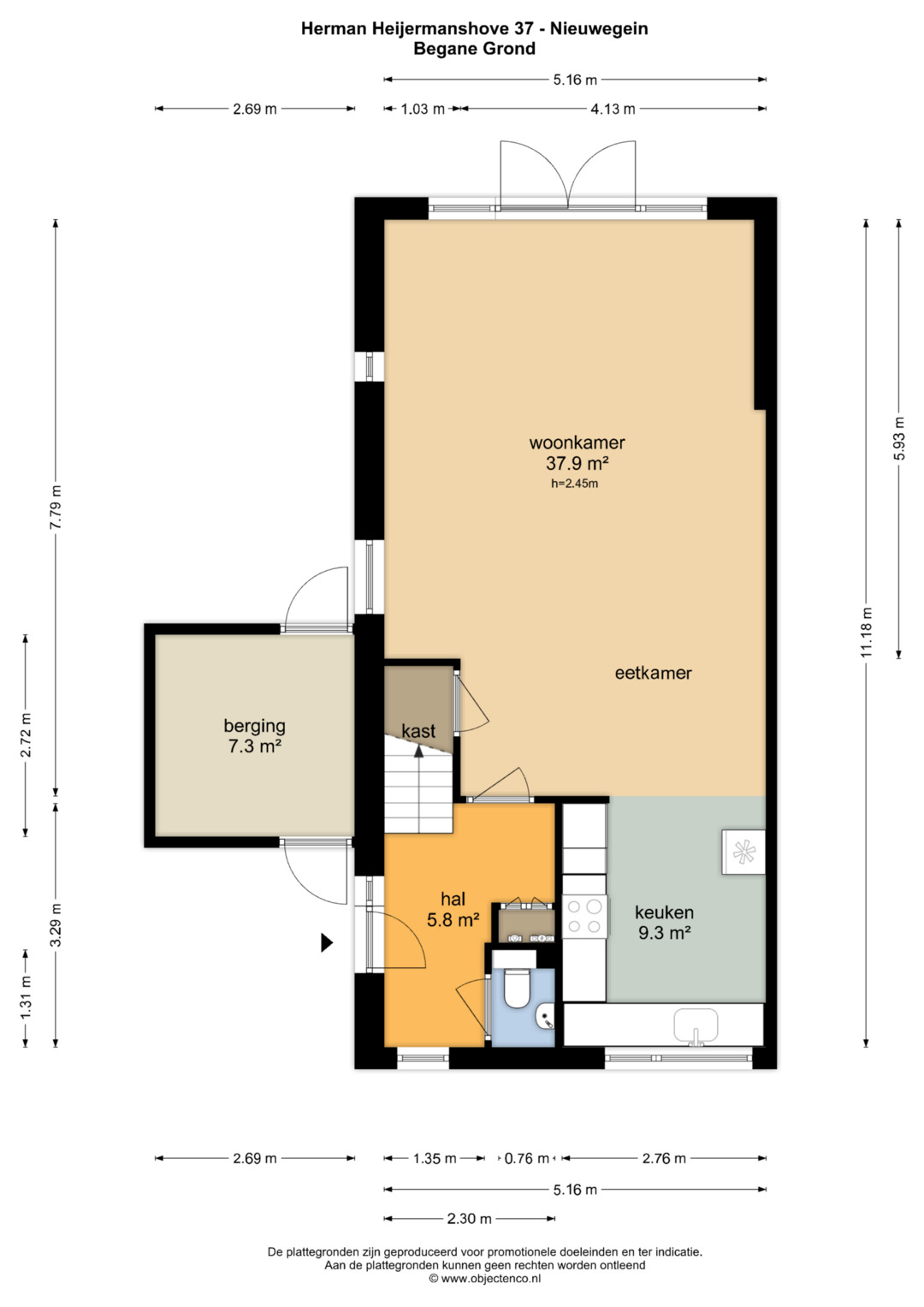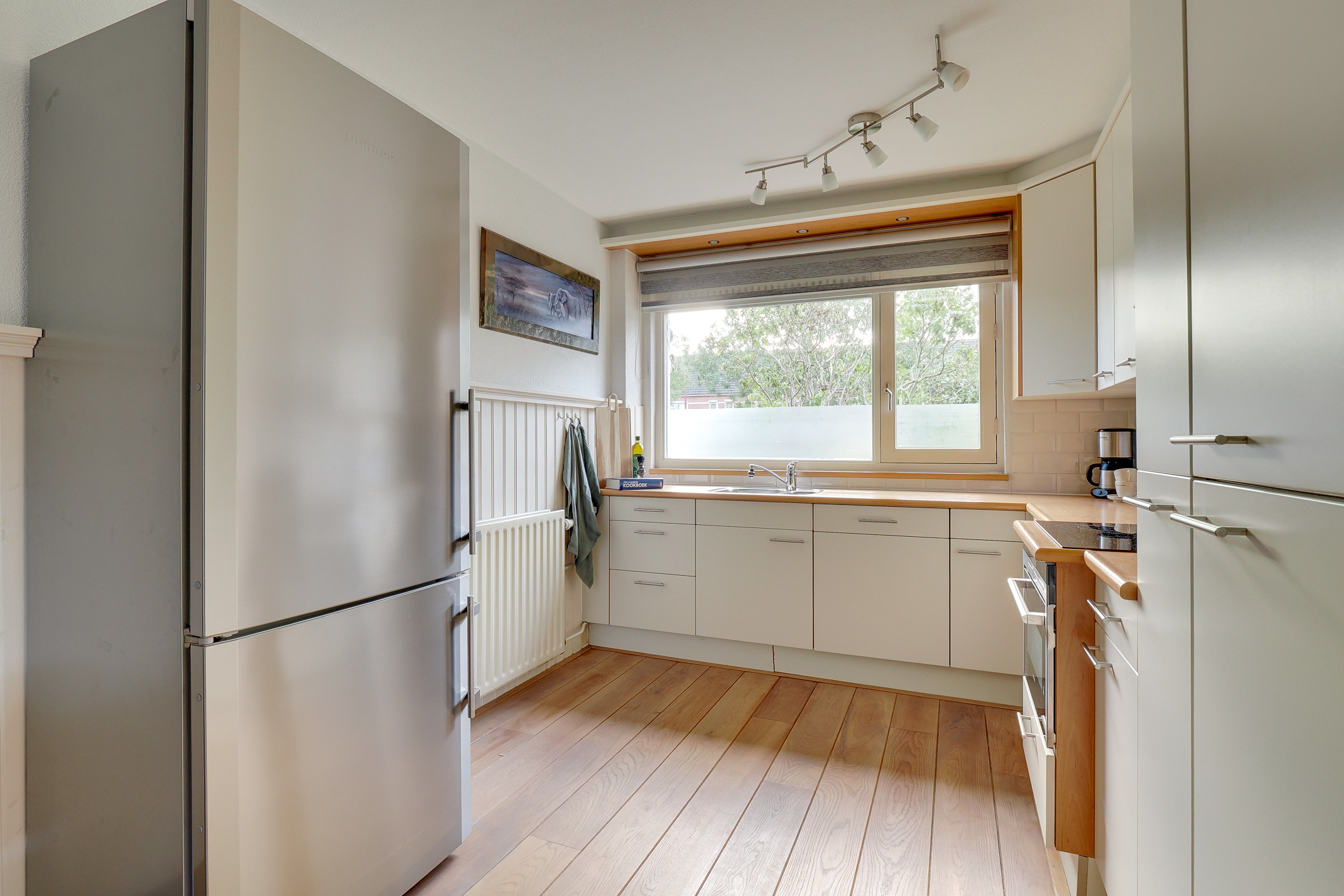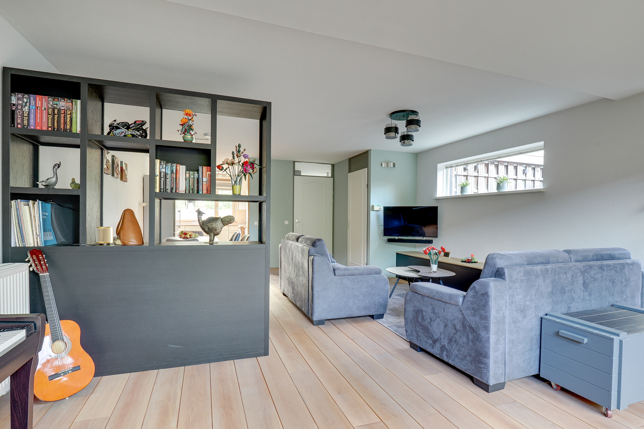 Begane grond: Entree met keurige toiletruimte, meterkast en trapopgang. Vanuit de hal bereik je de ruime uitgebouwde woonkamer met aan de achterzijde een schuifpui naar de tuin , . Aan de voorzijde tref je de open keuken aan die voorzien is van een keurige inrichting in L-opstelling. Het totale woonoppervlak van de woonkamer en keuken bedraagt circa 47,2 m2.