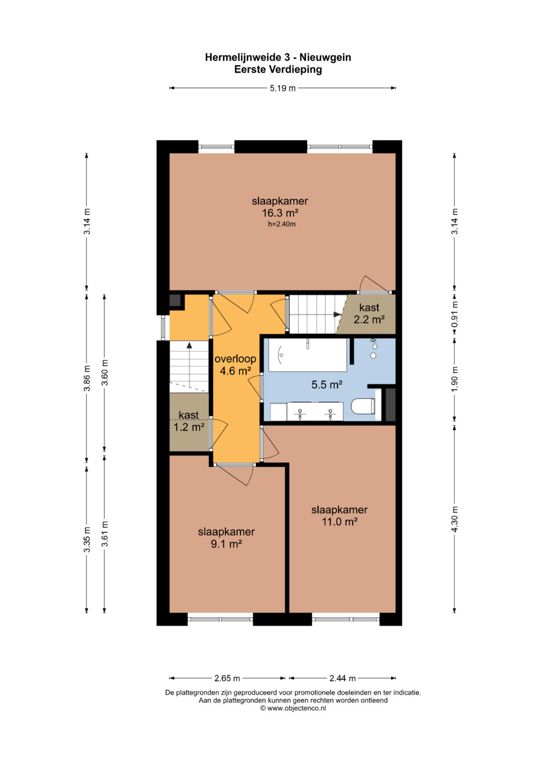 Eerste verdieping: Ruime overloop met vaste kast en toegang naar drie mooie slaapkamers van respectievelijk 16,3 m2, 9,1 m2 en 11 m2. De inpandige badkamer is ruim en luxe afgewerkt met onder andere inloop douche, ligbad, wastafelmeubel met 1 grote bak en een zwevend toilet.