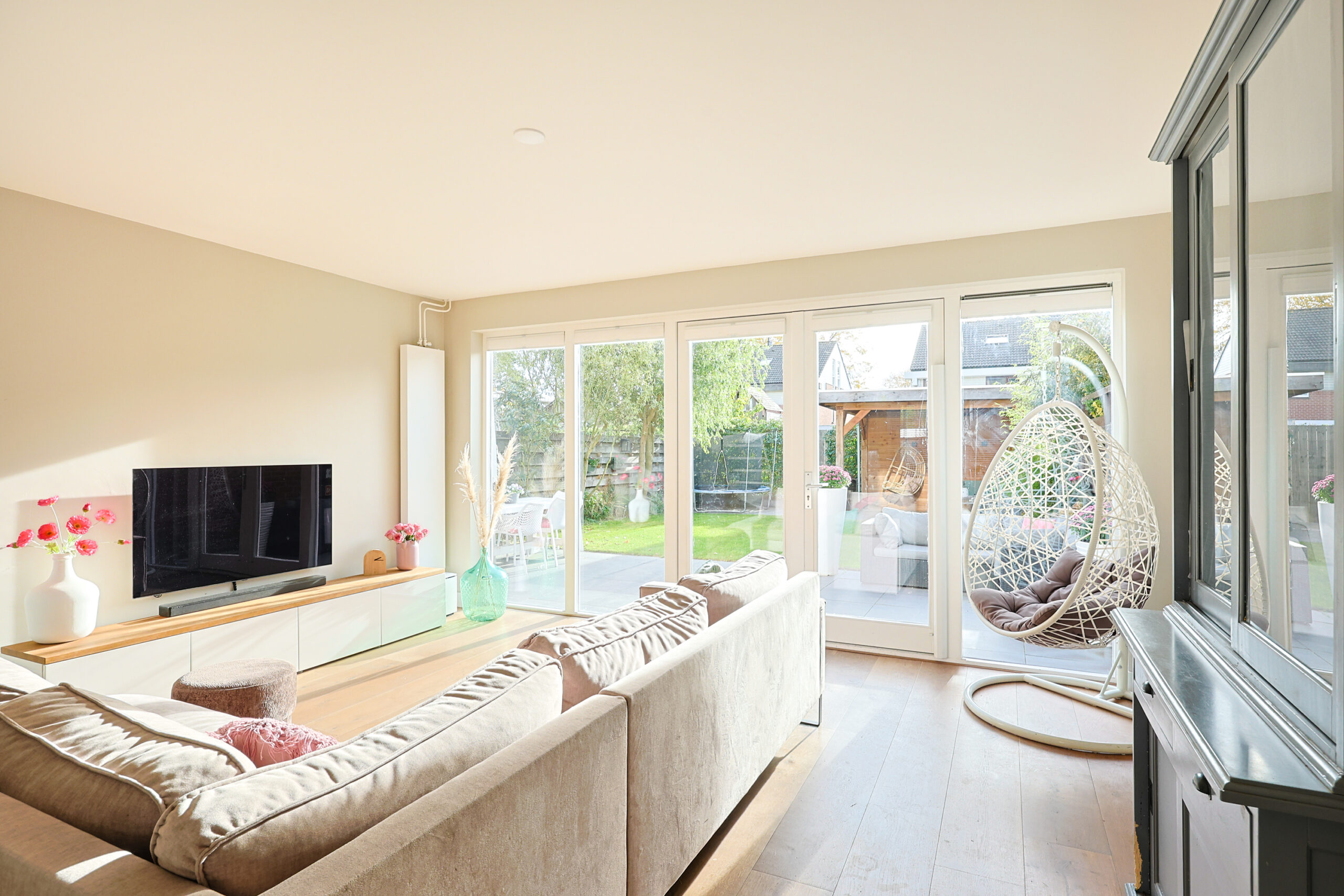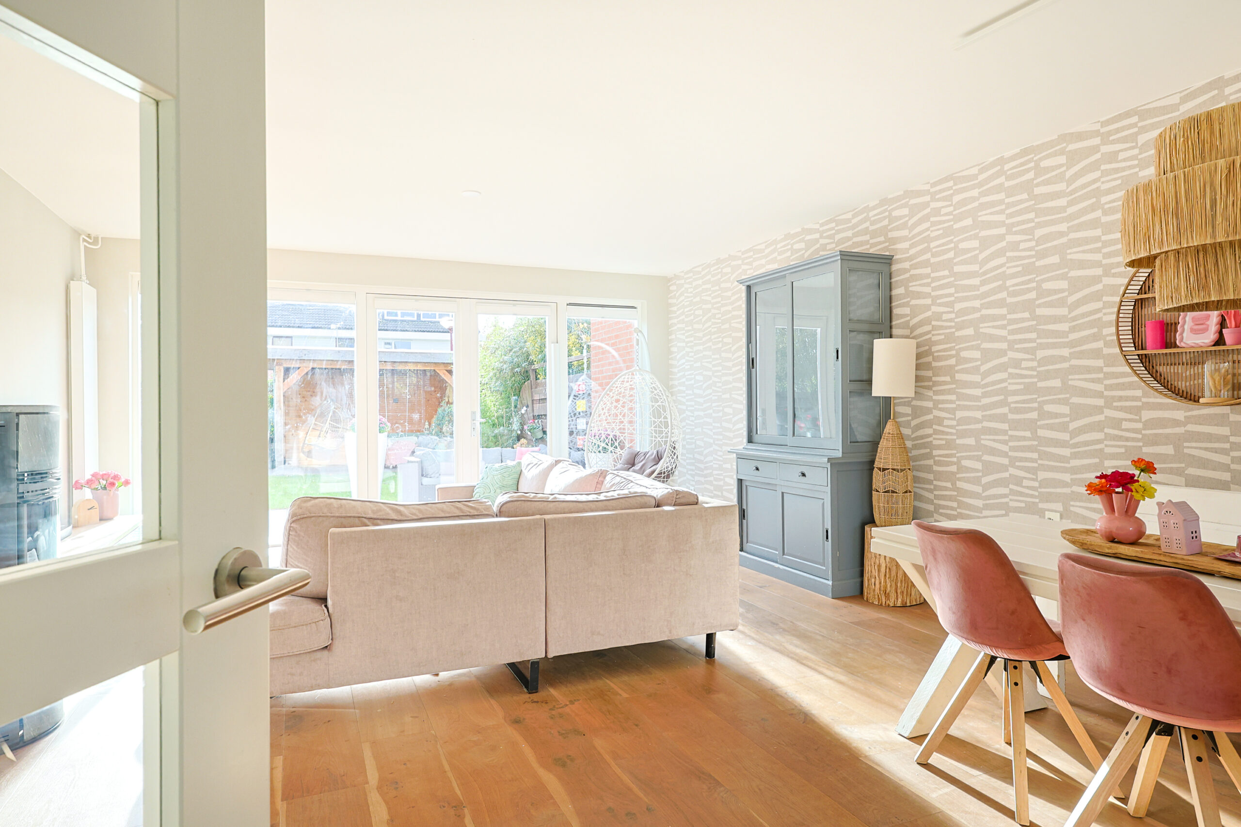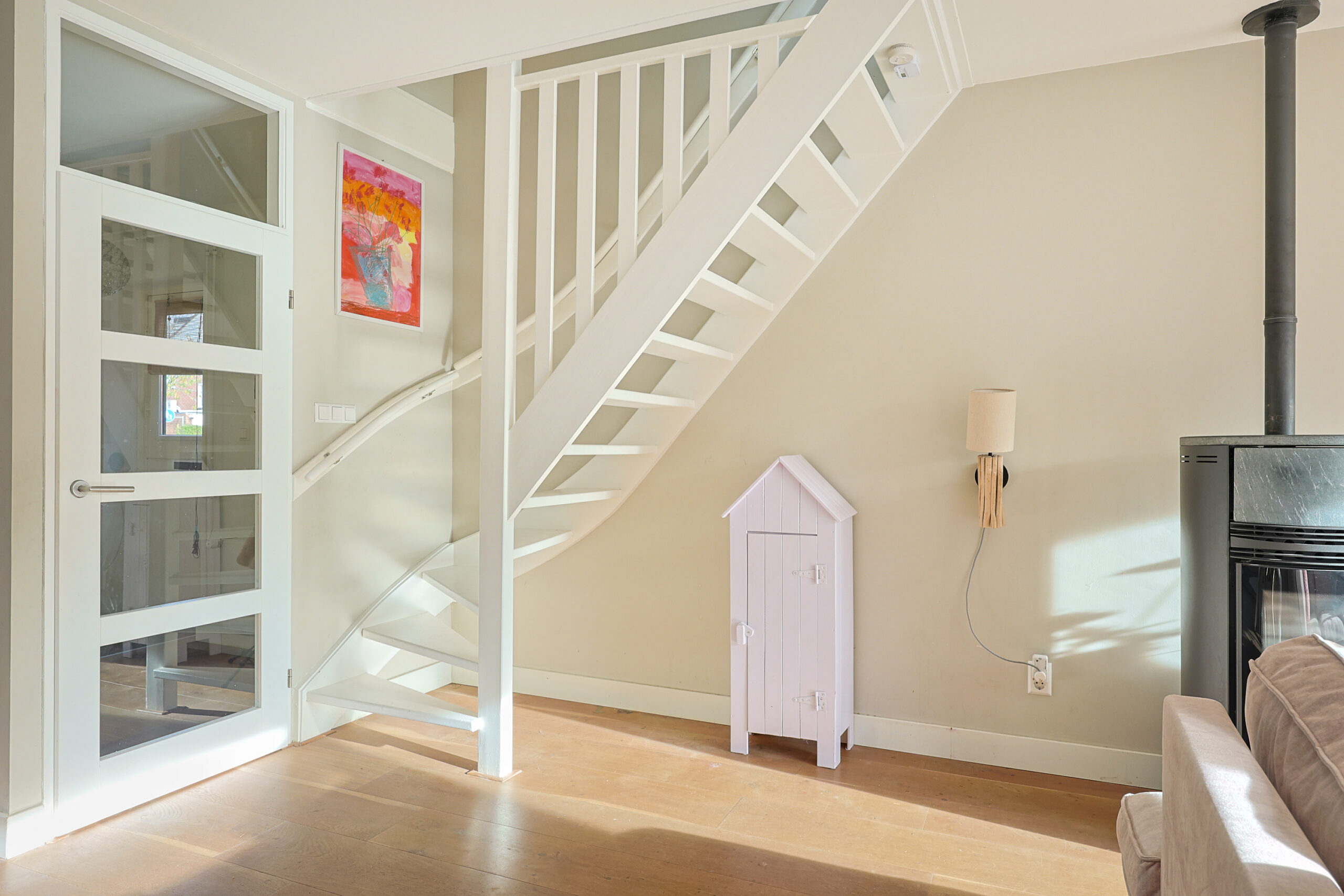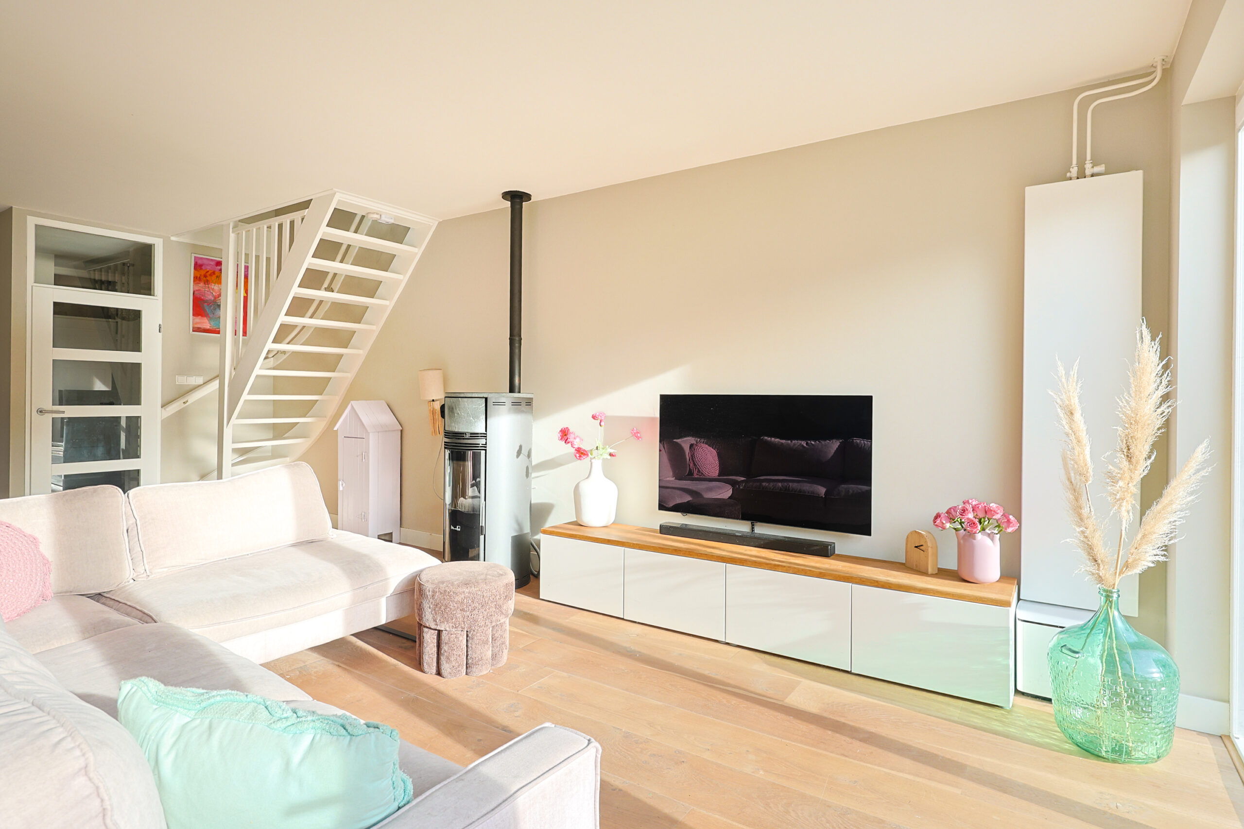 – Zeer ruime licht woonkamer met houten vloer en pelletkachel.