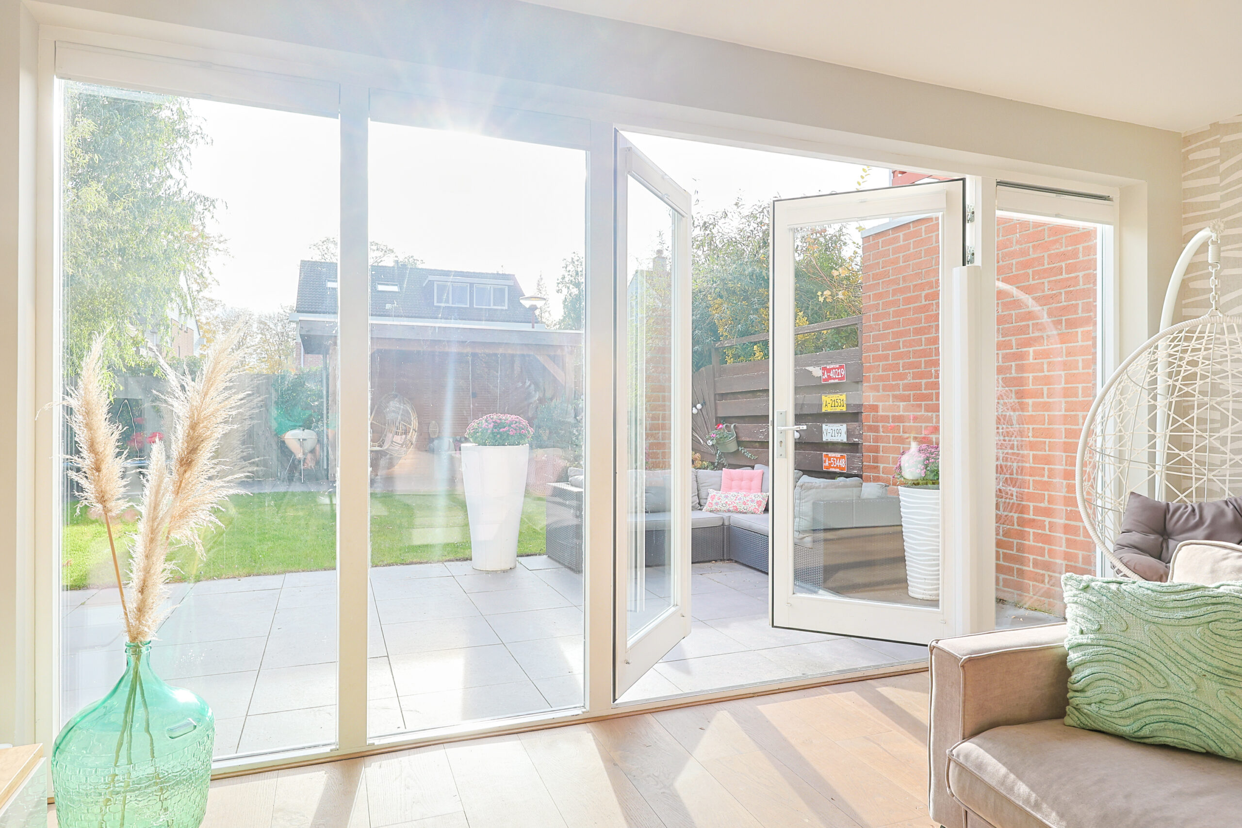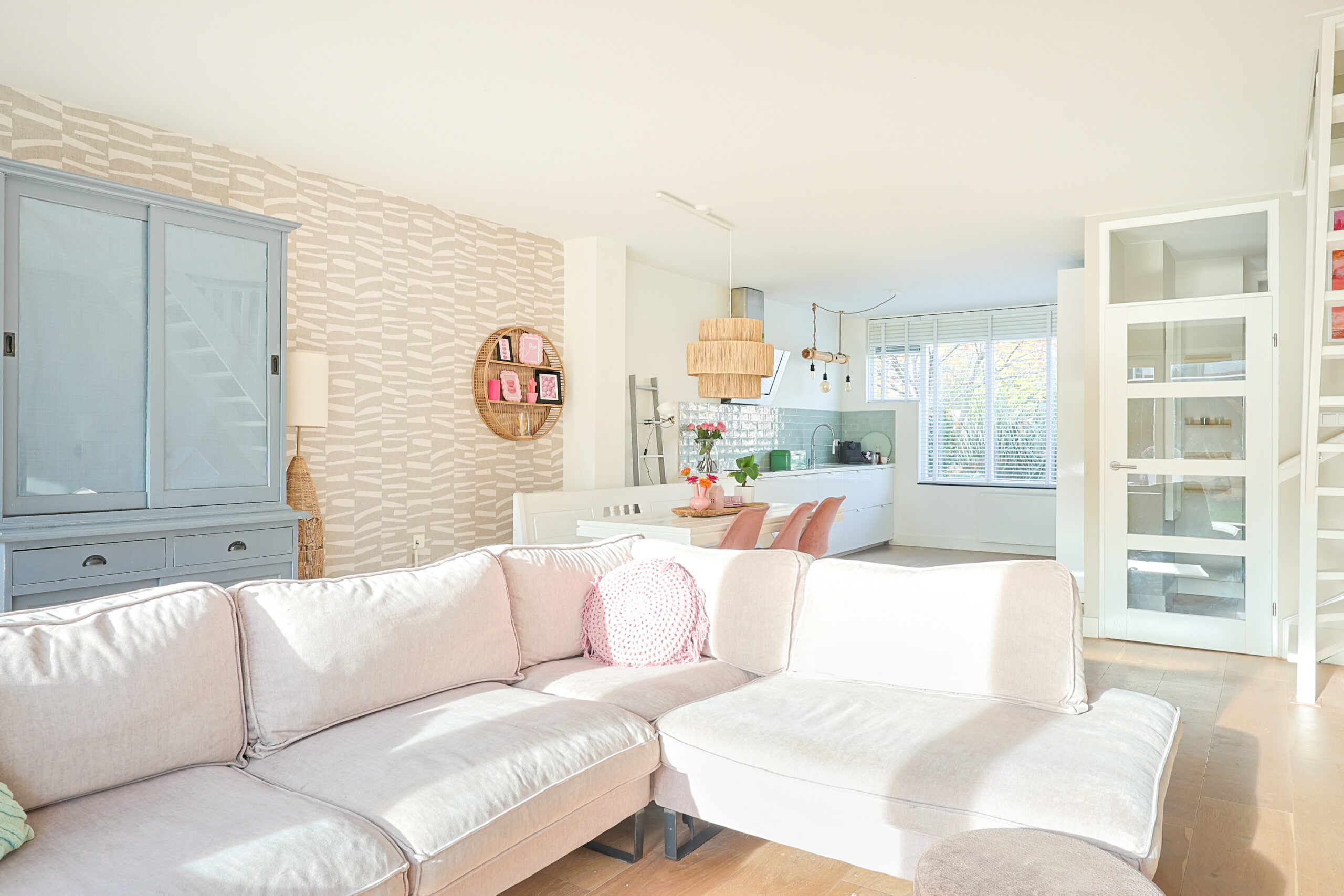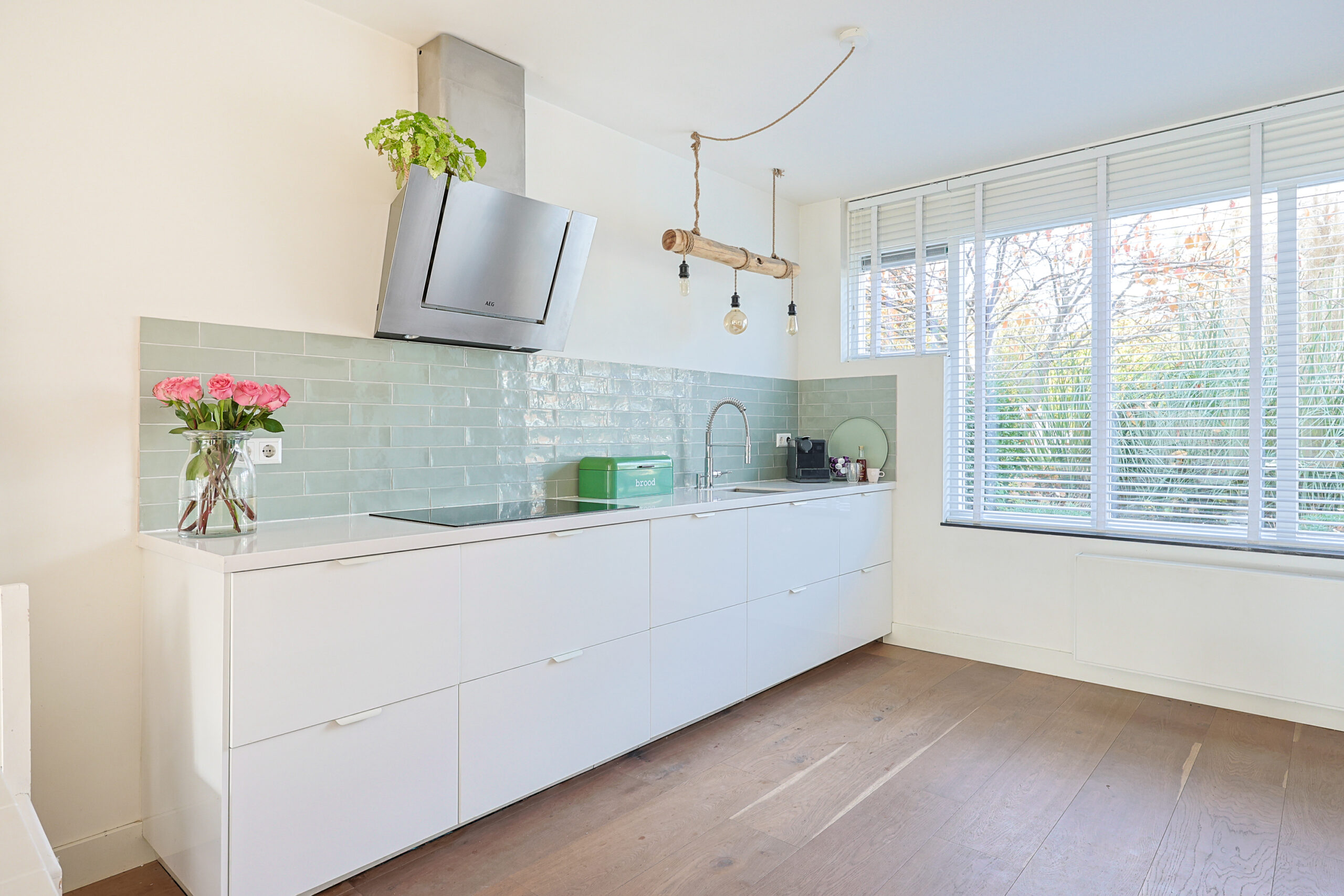 – Zeer ruime licht woonkamer met houten vloer en pelletkachel.