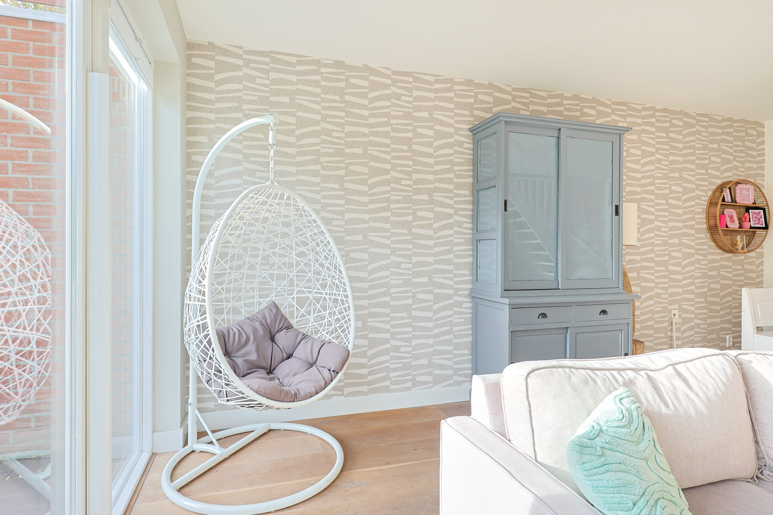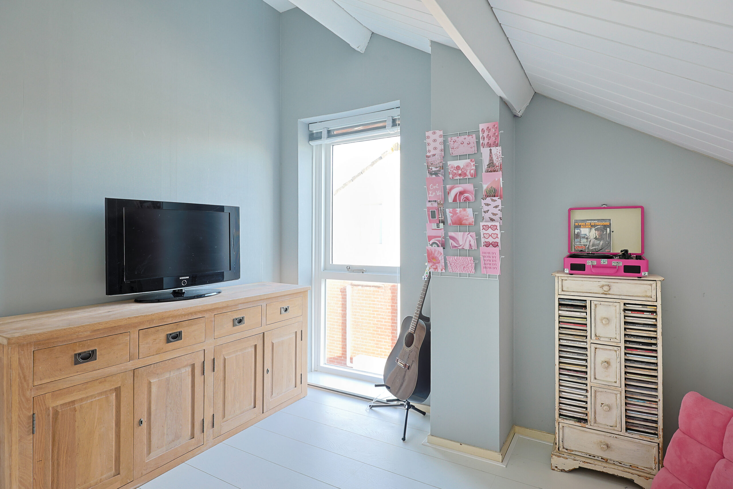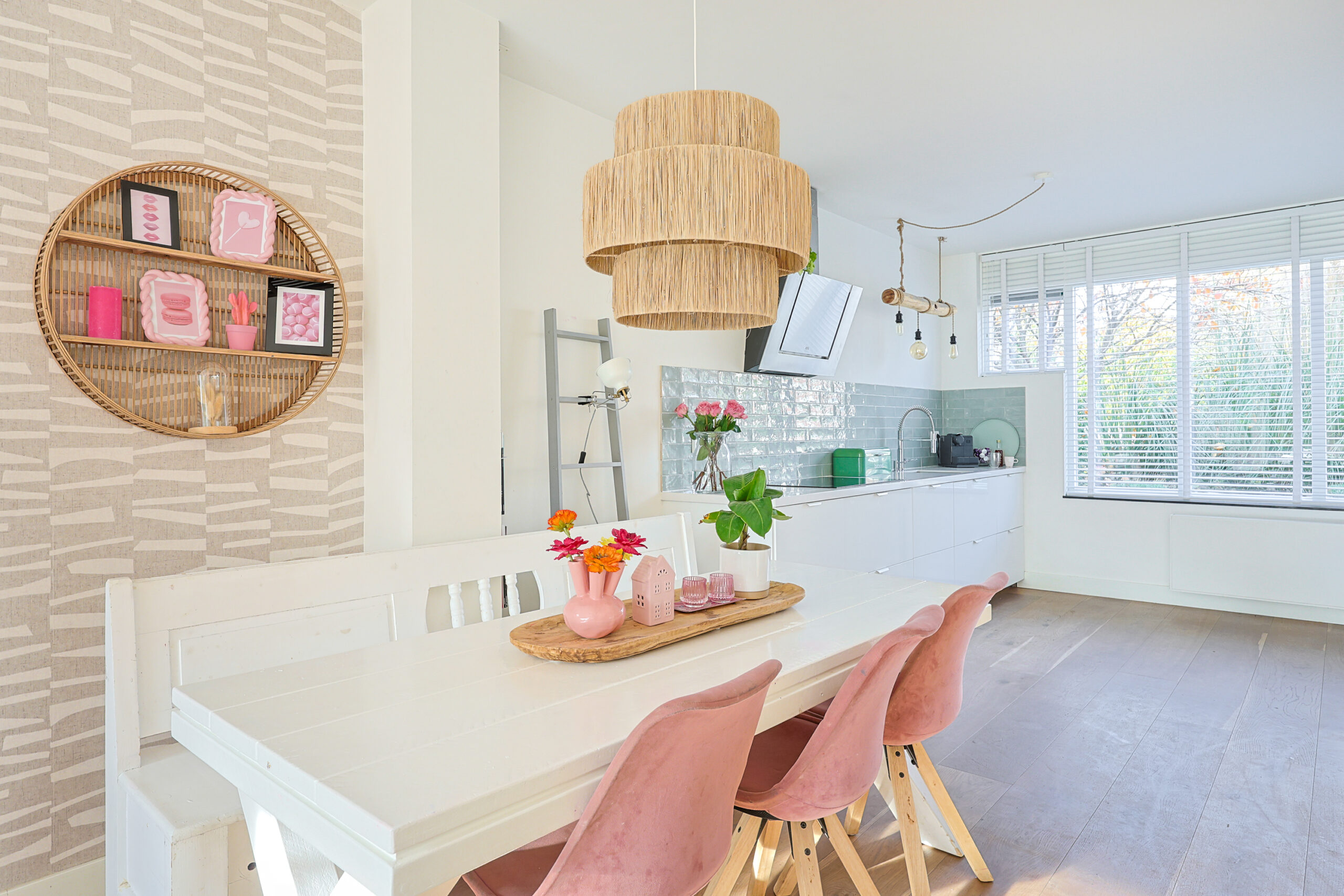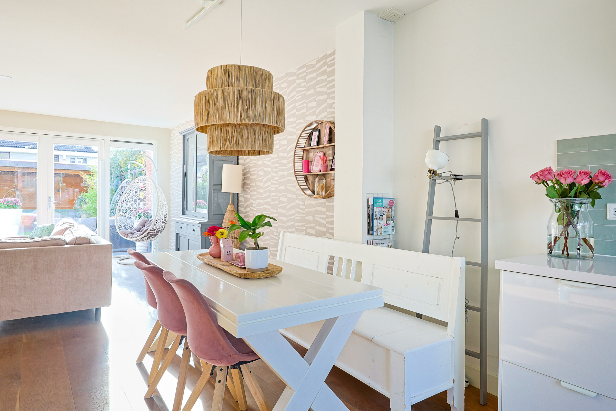 – Zeer ruime licht woonkamer met houten vloer en pelletkachel.