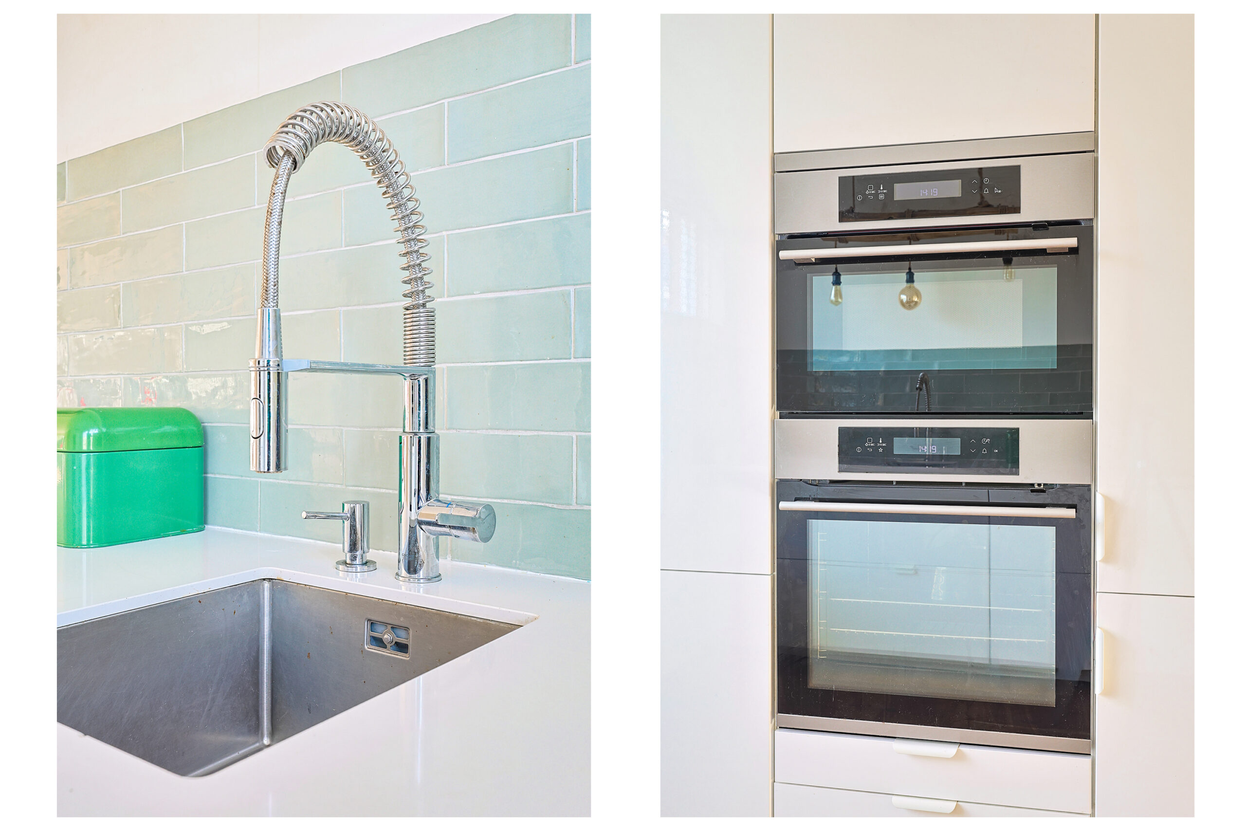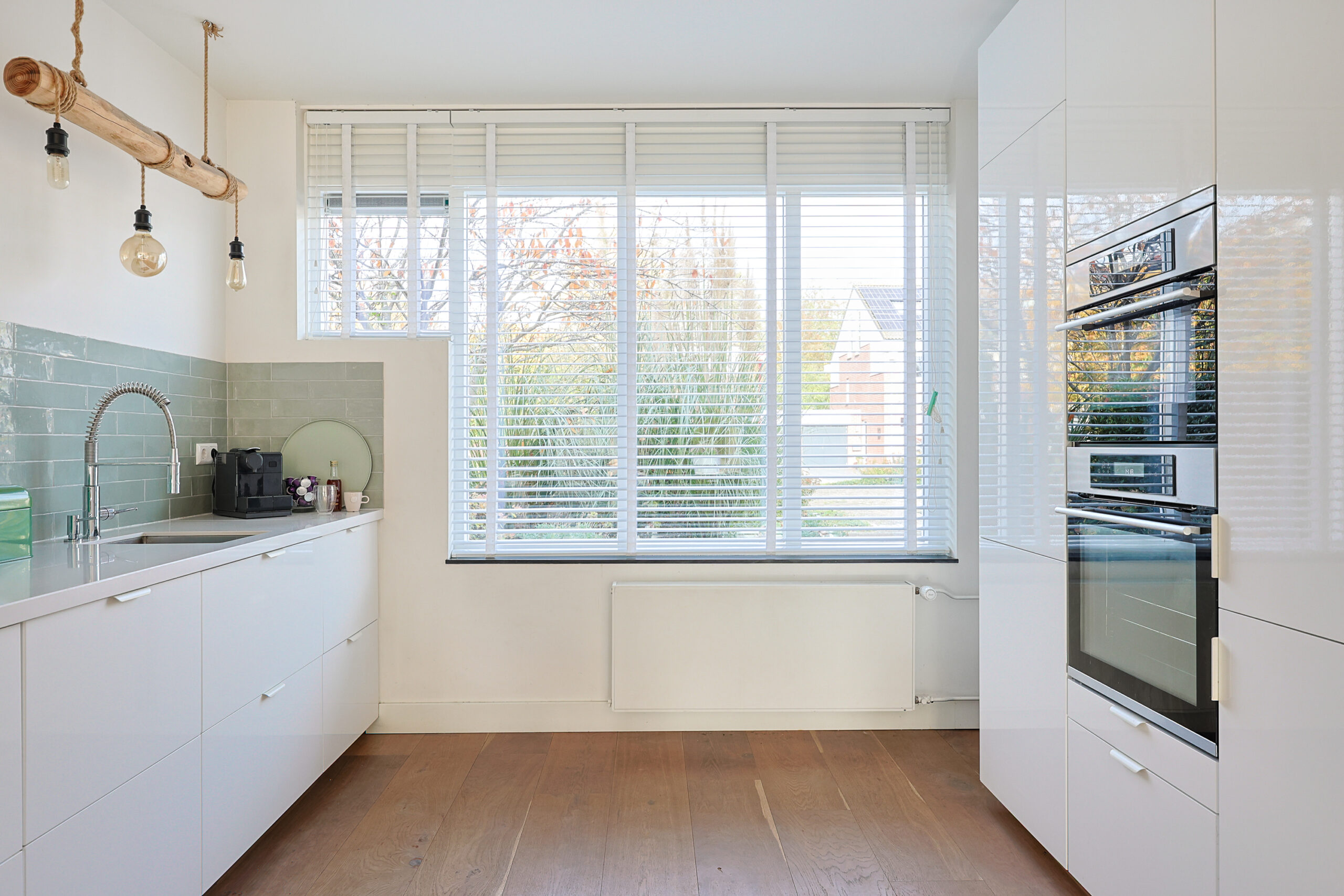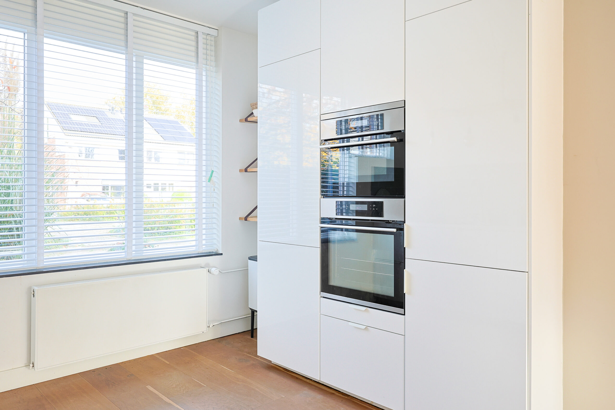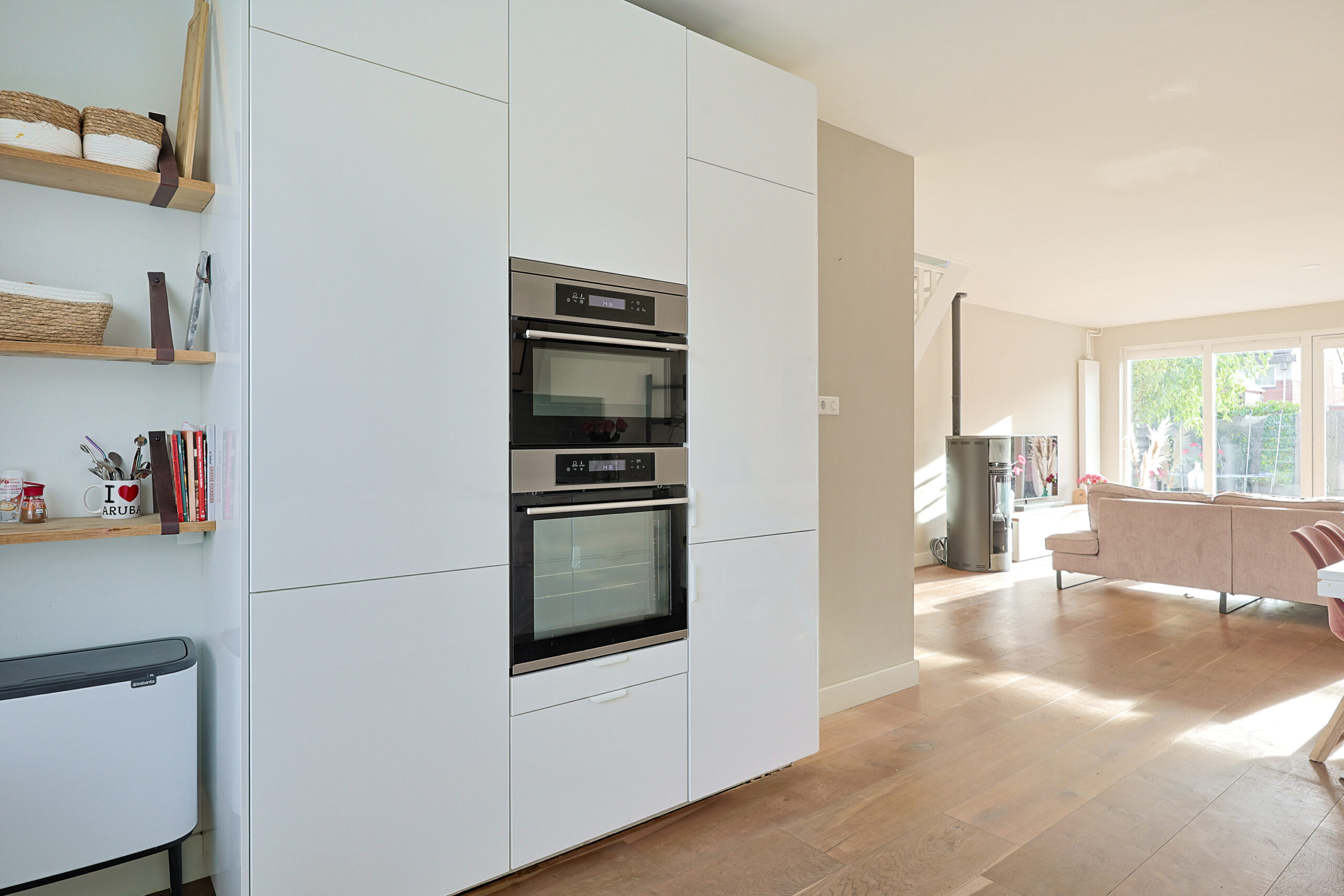 – Moderne hoogglans witte keuken met diverse inbouwapparatuur.