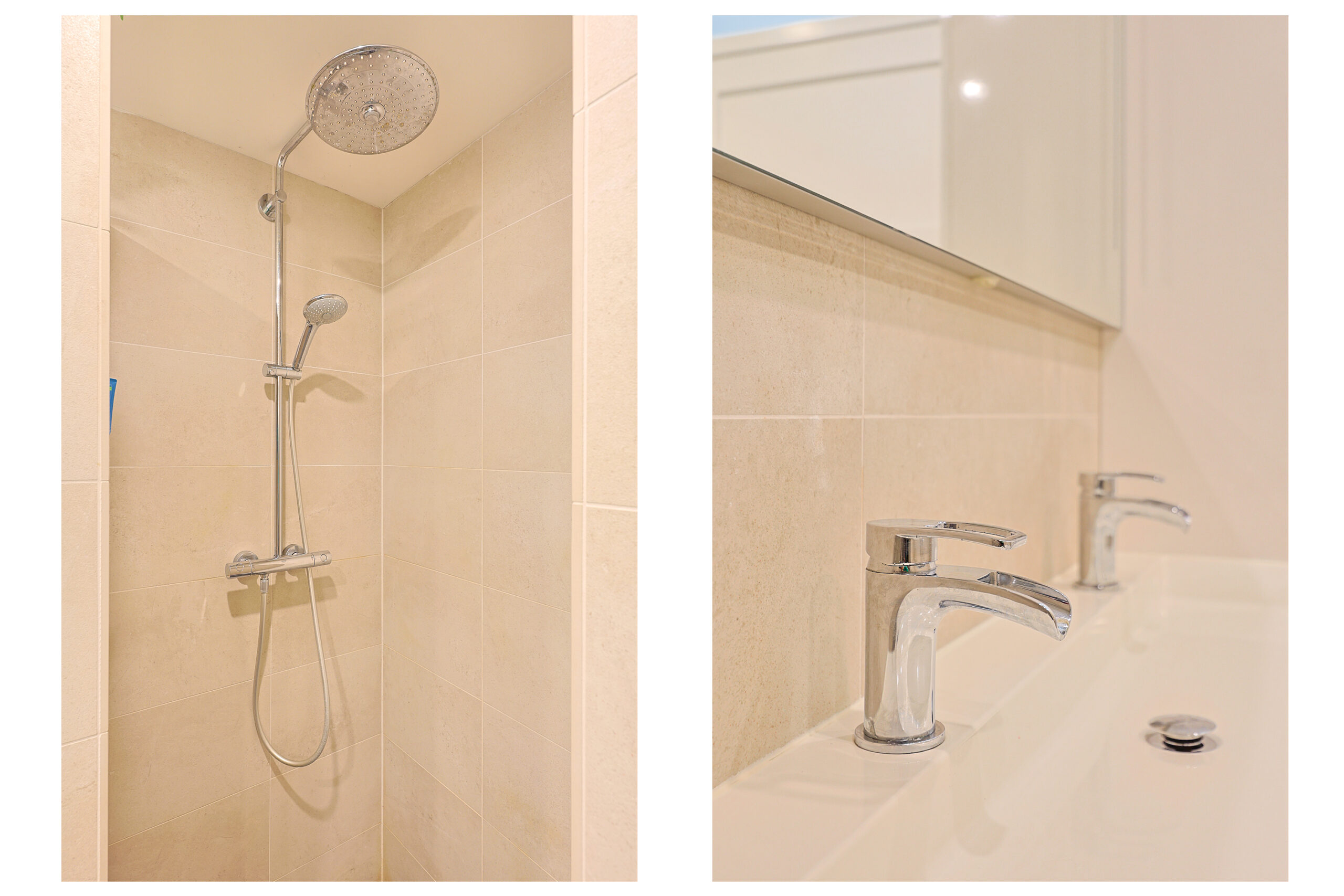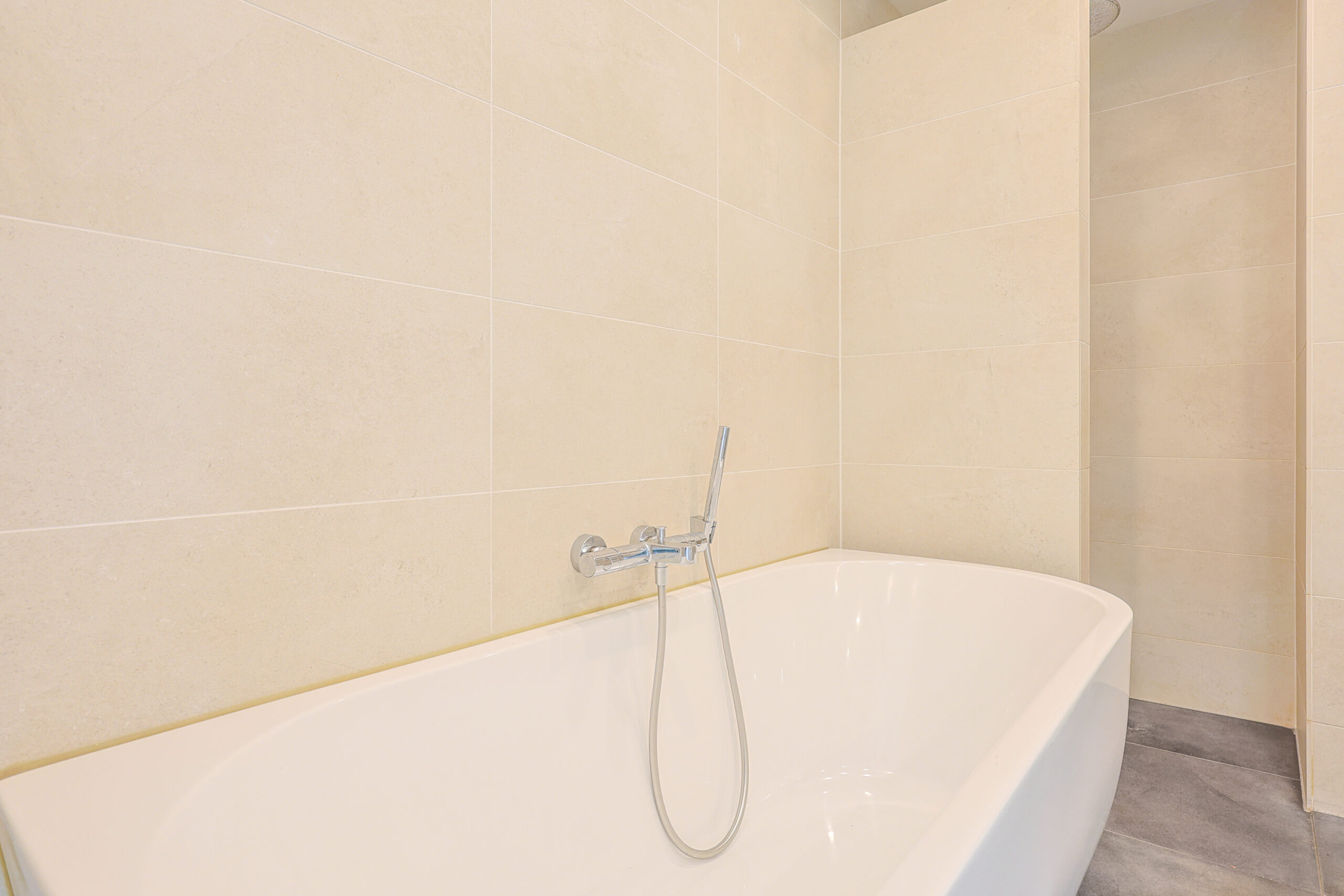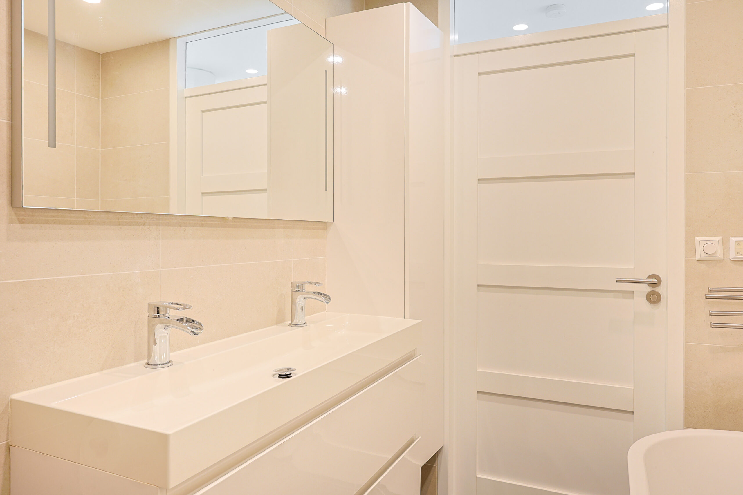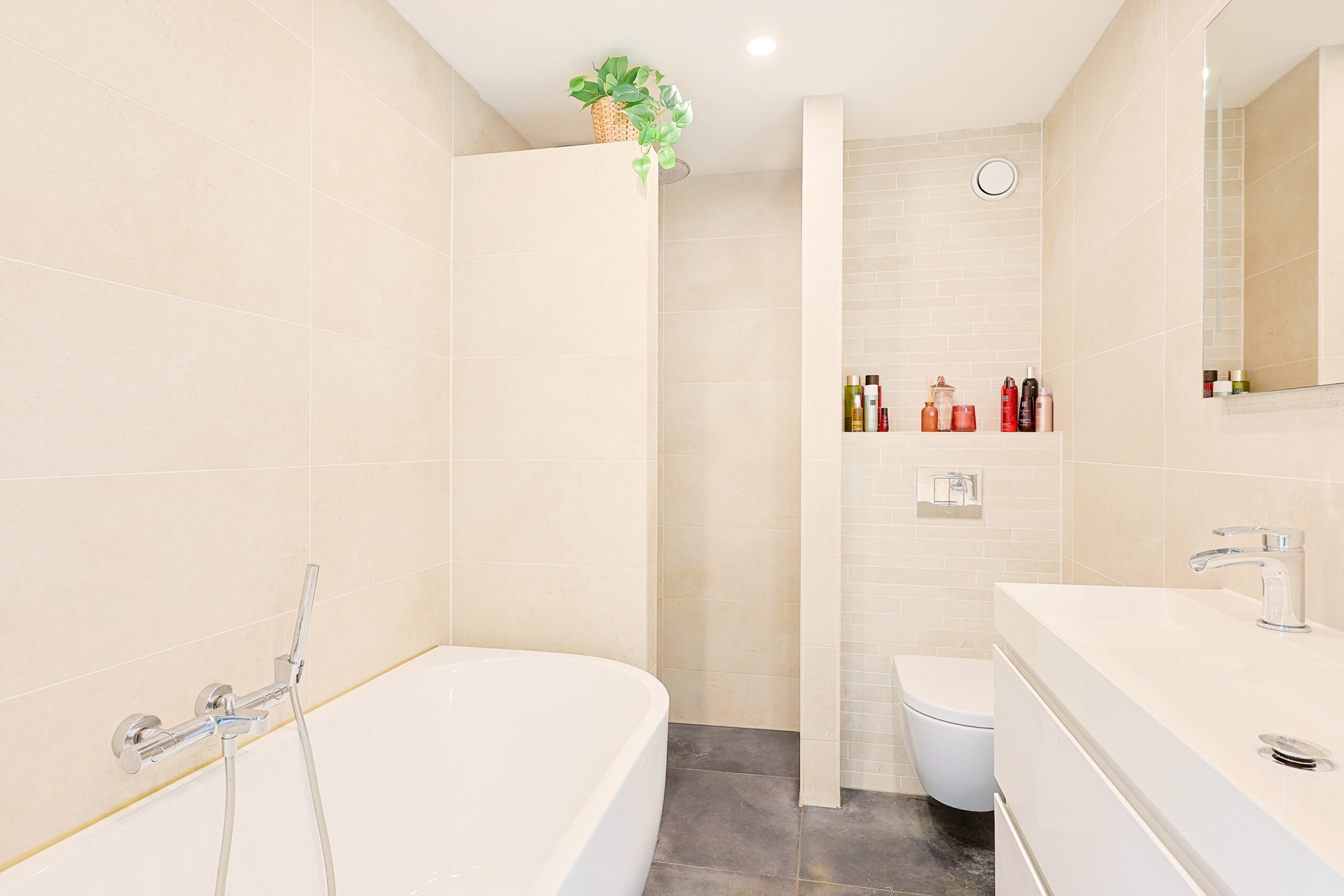 – Luxe moderne badkamer met ligbad, inloop douche, grote wastafel meubel en tweede toilet en spiegel met spiegelverwarming.