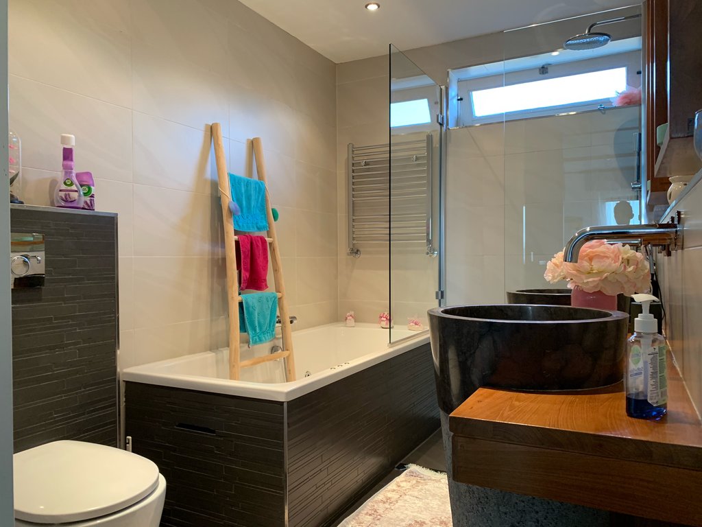 2e VERDIEPING: Ruime overloop, 3 mooie ruime slaapkamers. Luxe badkamer voorzien van whirlpool bad, 2 wastafels, douchecabine en zwevend toilet.