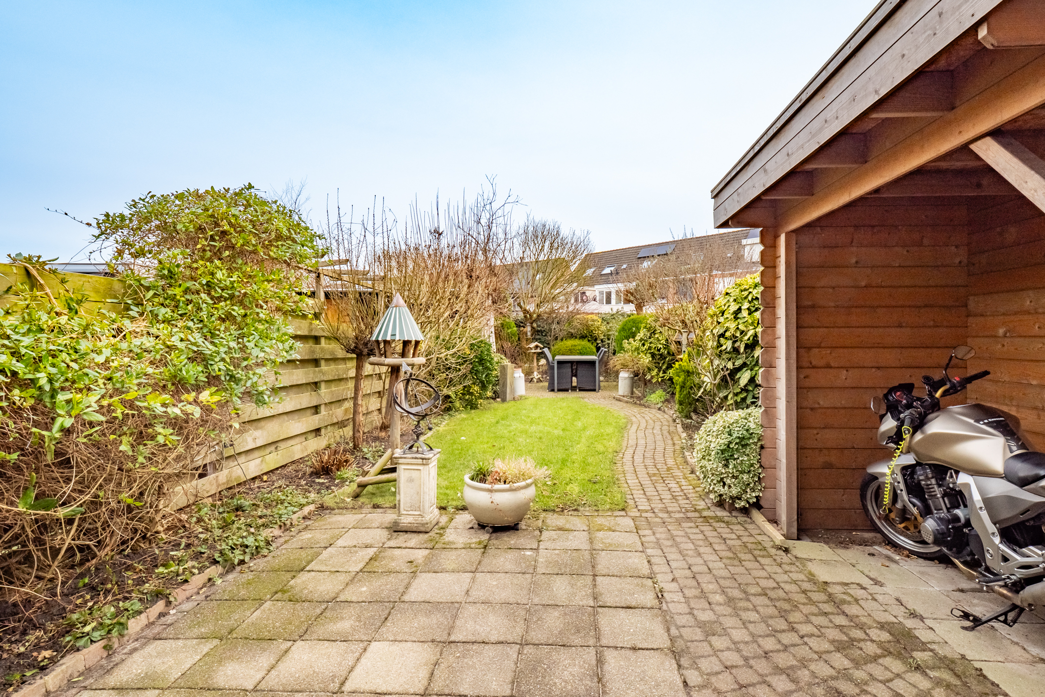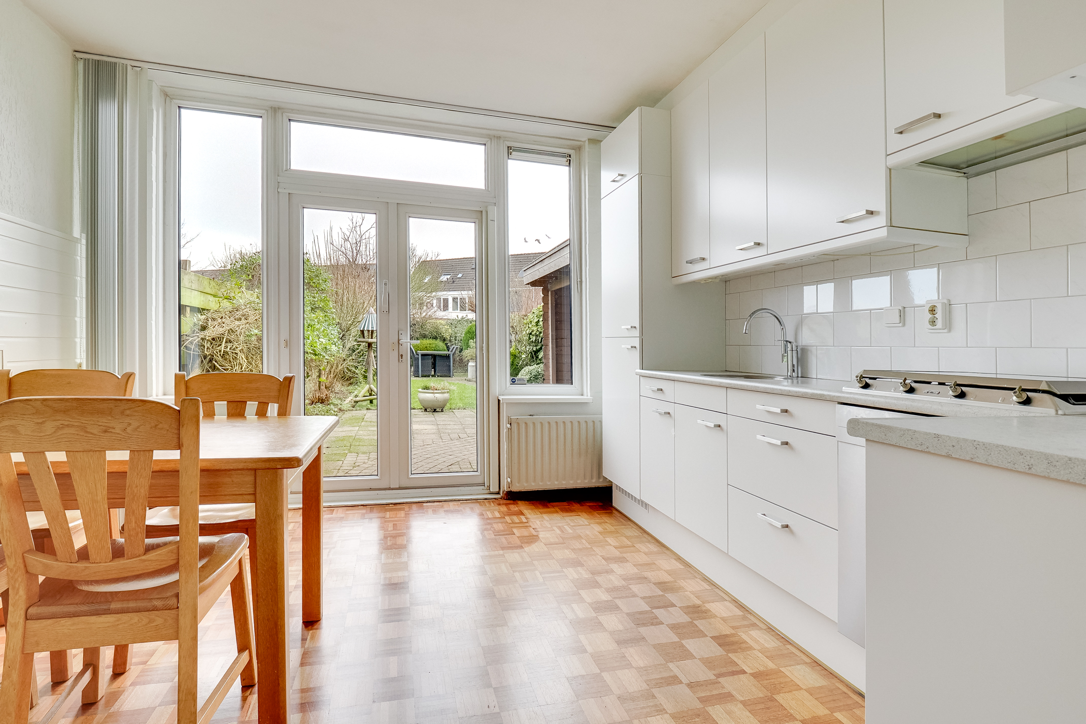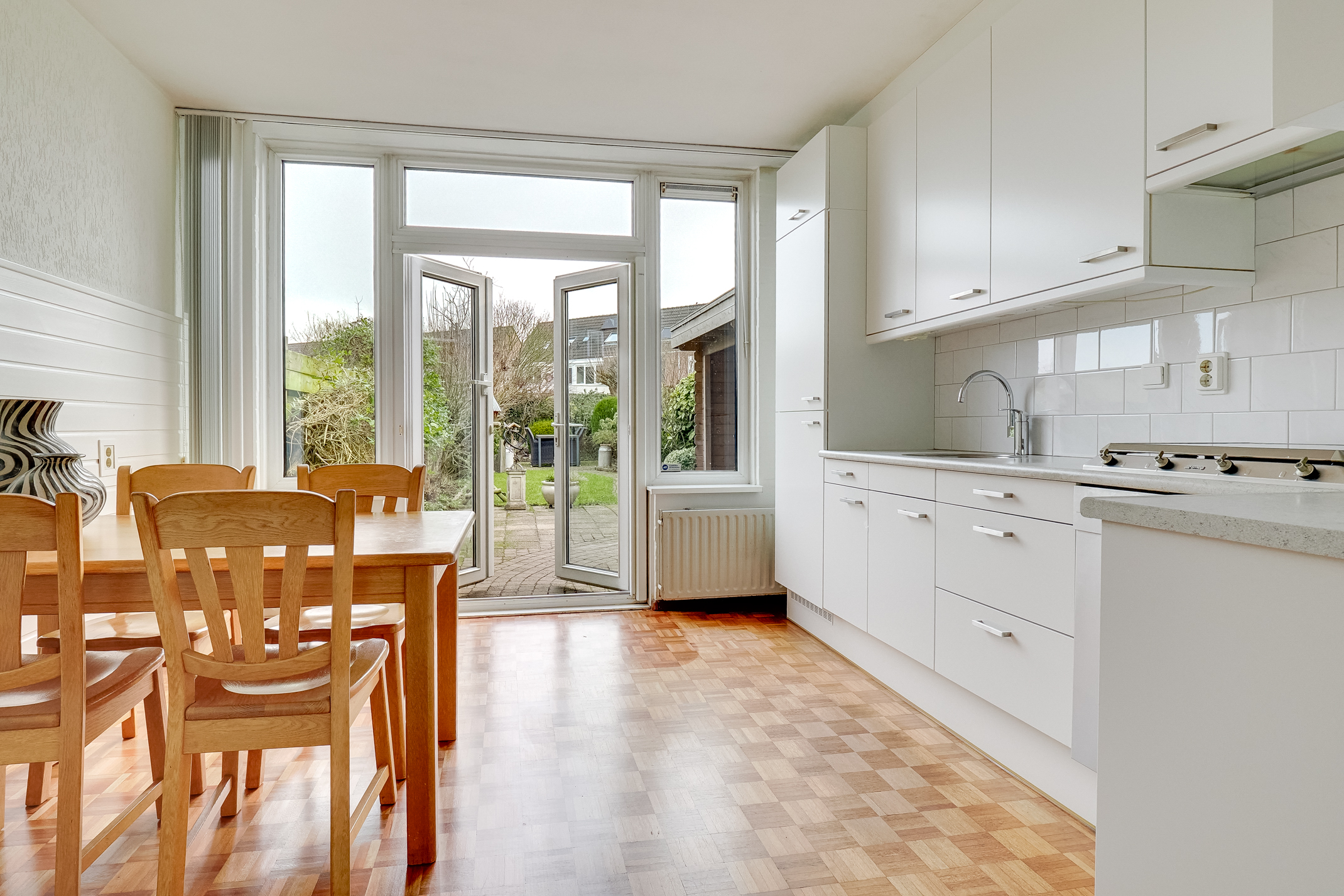 mogelijkheden en heeft prettig contact met de eettafel, hierdoor ontstaat het gevoel van een woonkeuken.Tevens biedt de eetkamer middels openslaande deuren toegang tot de zeer diepe achtertuin. De achtertuin is erg fijn en biedt voldoende ruimte, welke de mogelijkheid biedt tot een uitbouw, De achtertuin is ruim ca. 19 meter diep en beschikt over keurige bestrating, inpandige berging, planten borders, buitenkraan, achterom en separate overkapping. De tuin biedt voldoende zon en schaduw.