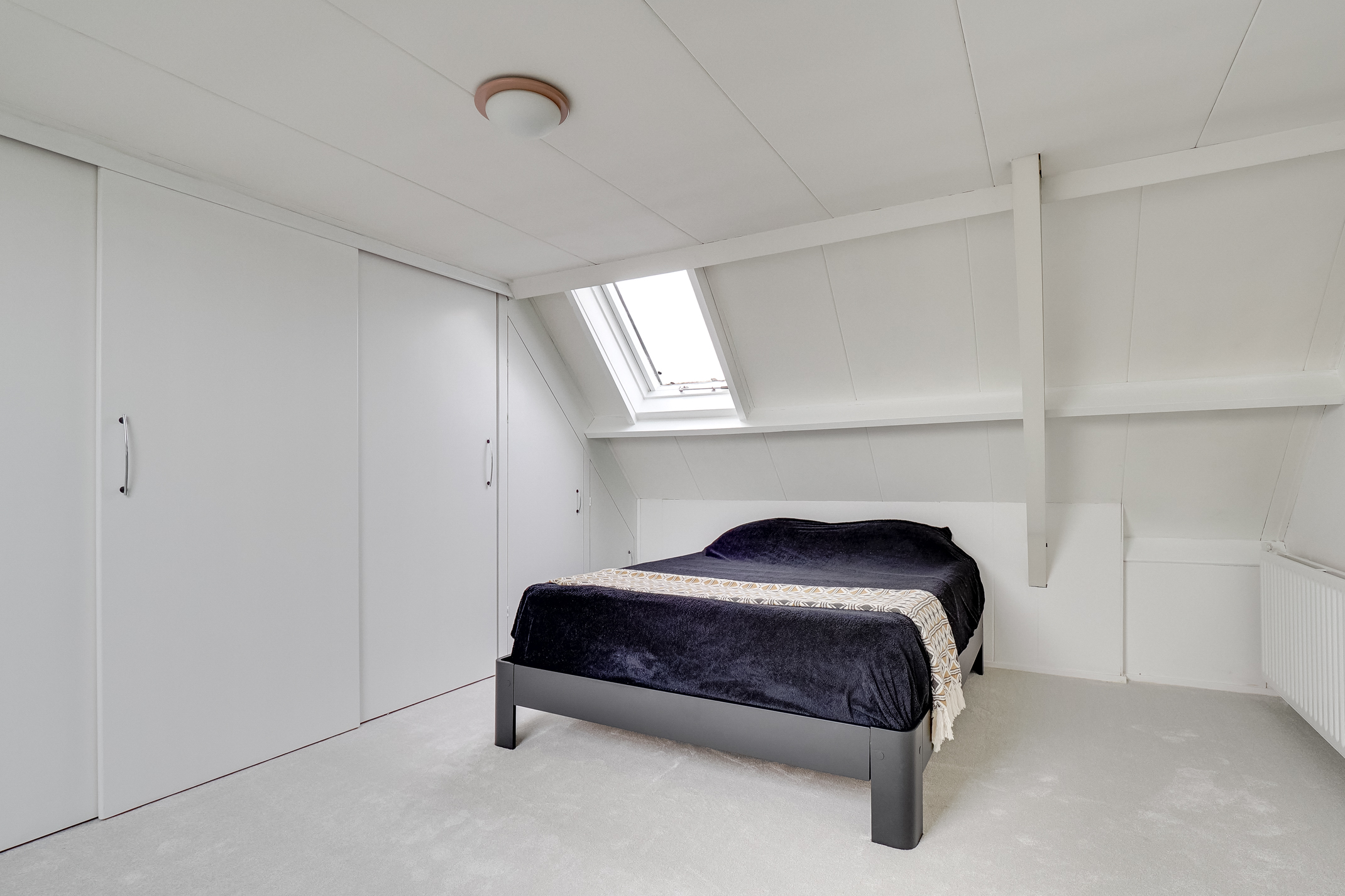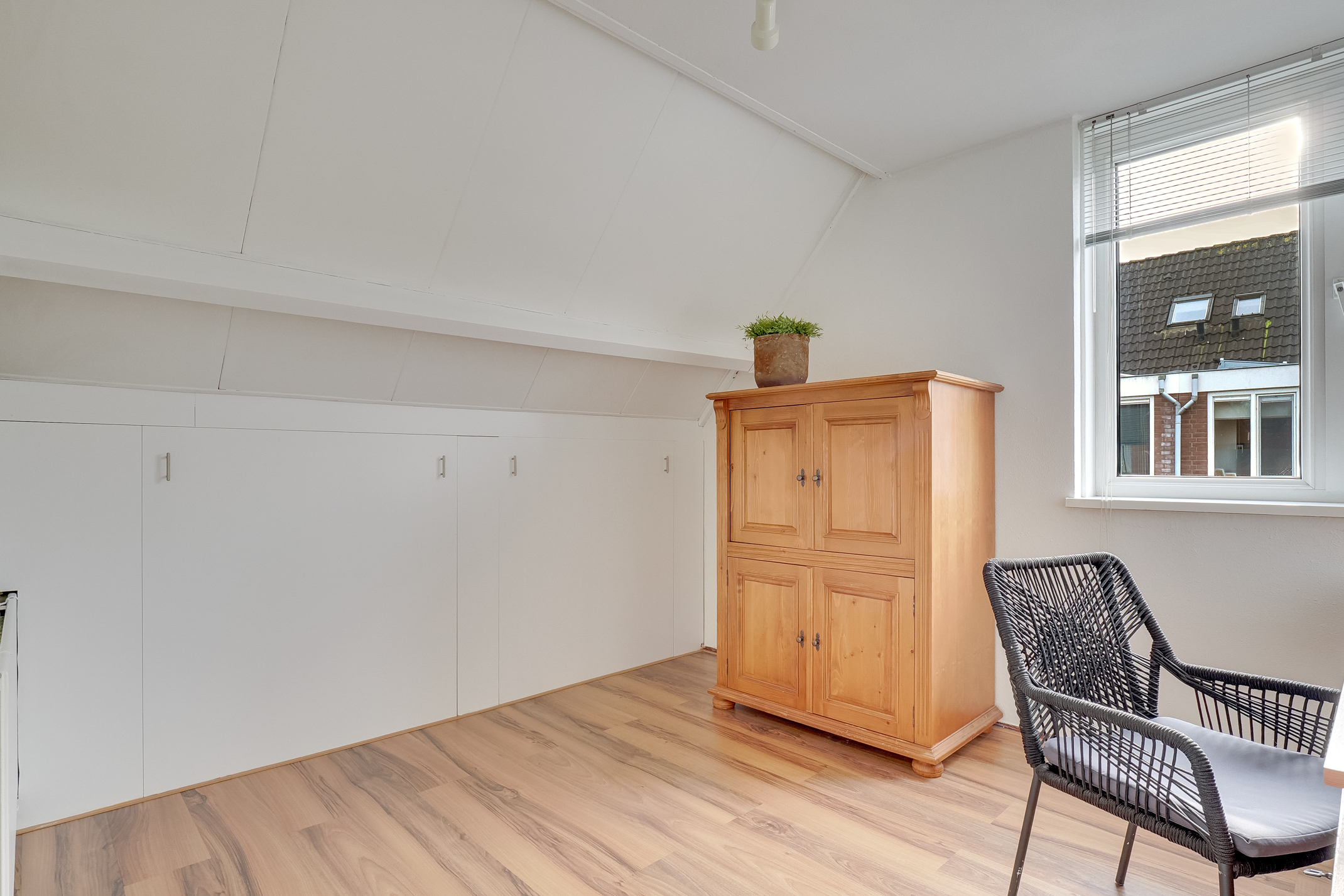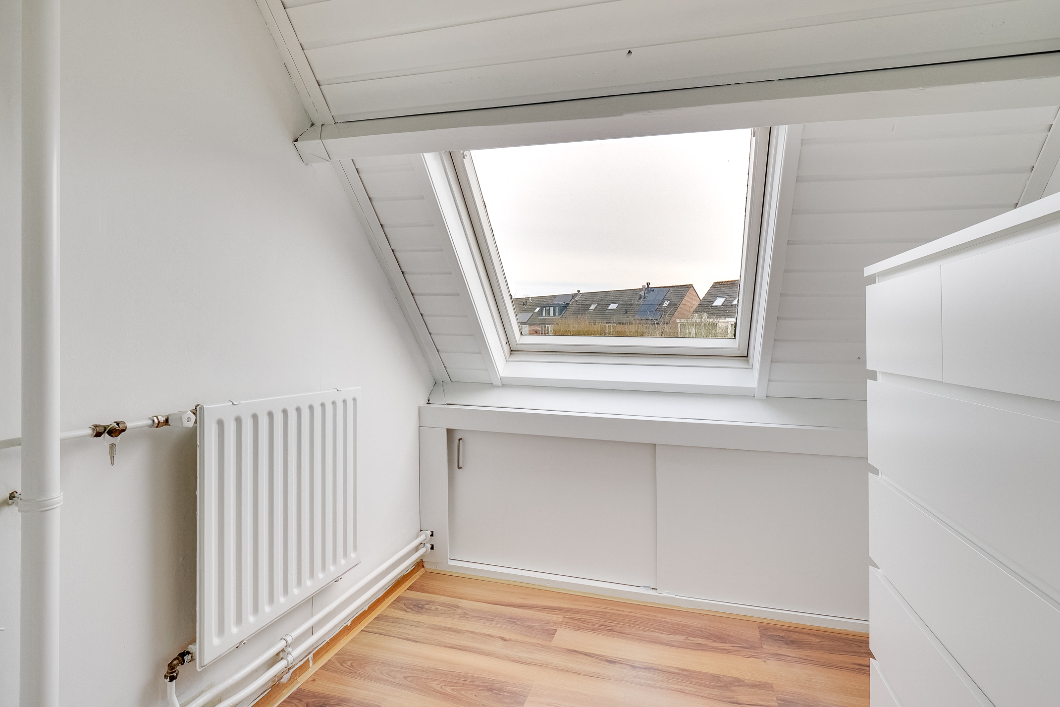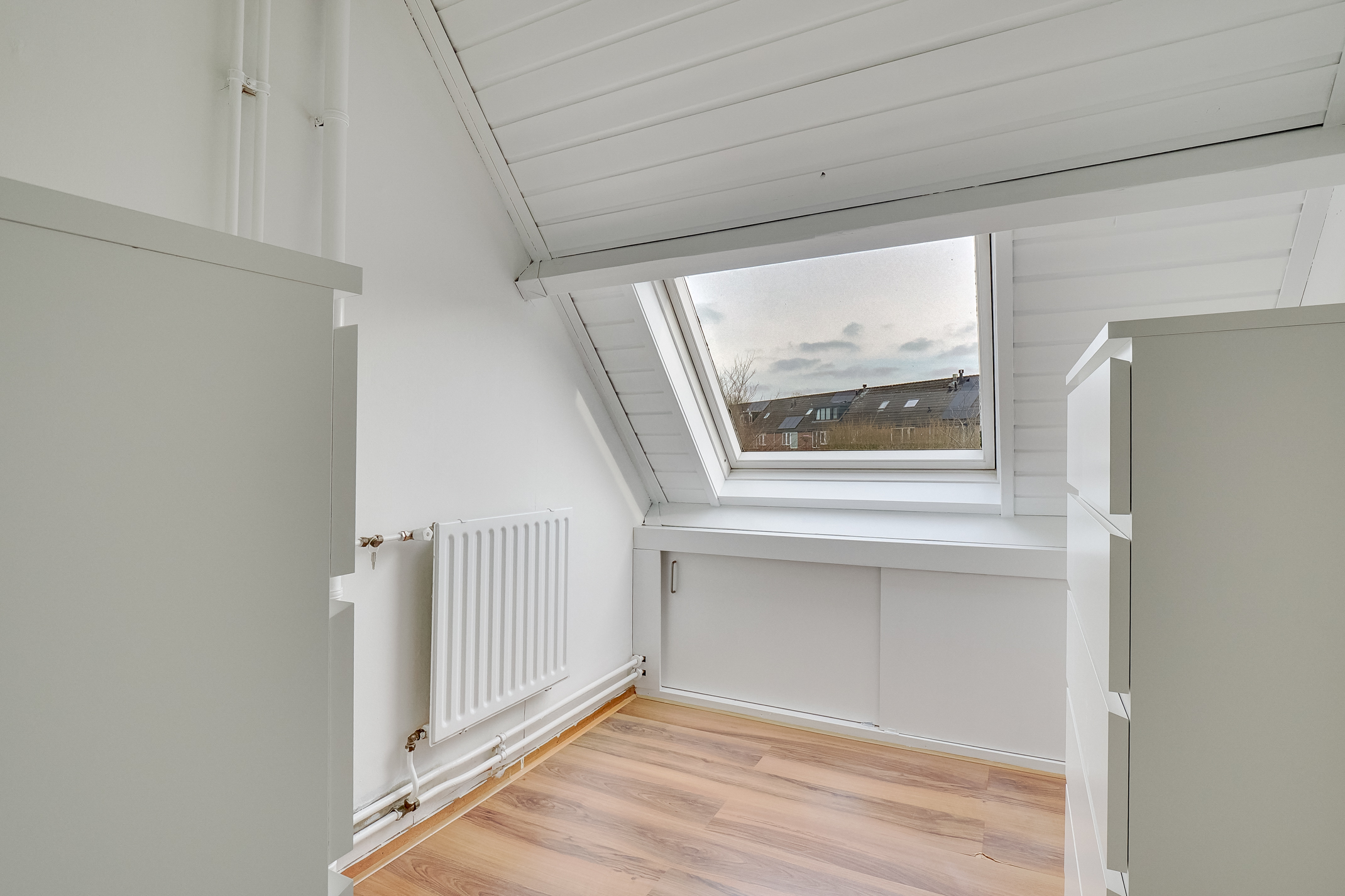2E VERDIEPING: Overloop met plaats voor de C.V.-ketel en toegang tot de vierde slaapkamer van ca. 17,1 m2. De mooie slaapkamer met voldoende lichtinval en bergruimte is ook voorzien van een kastenwand.