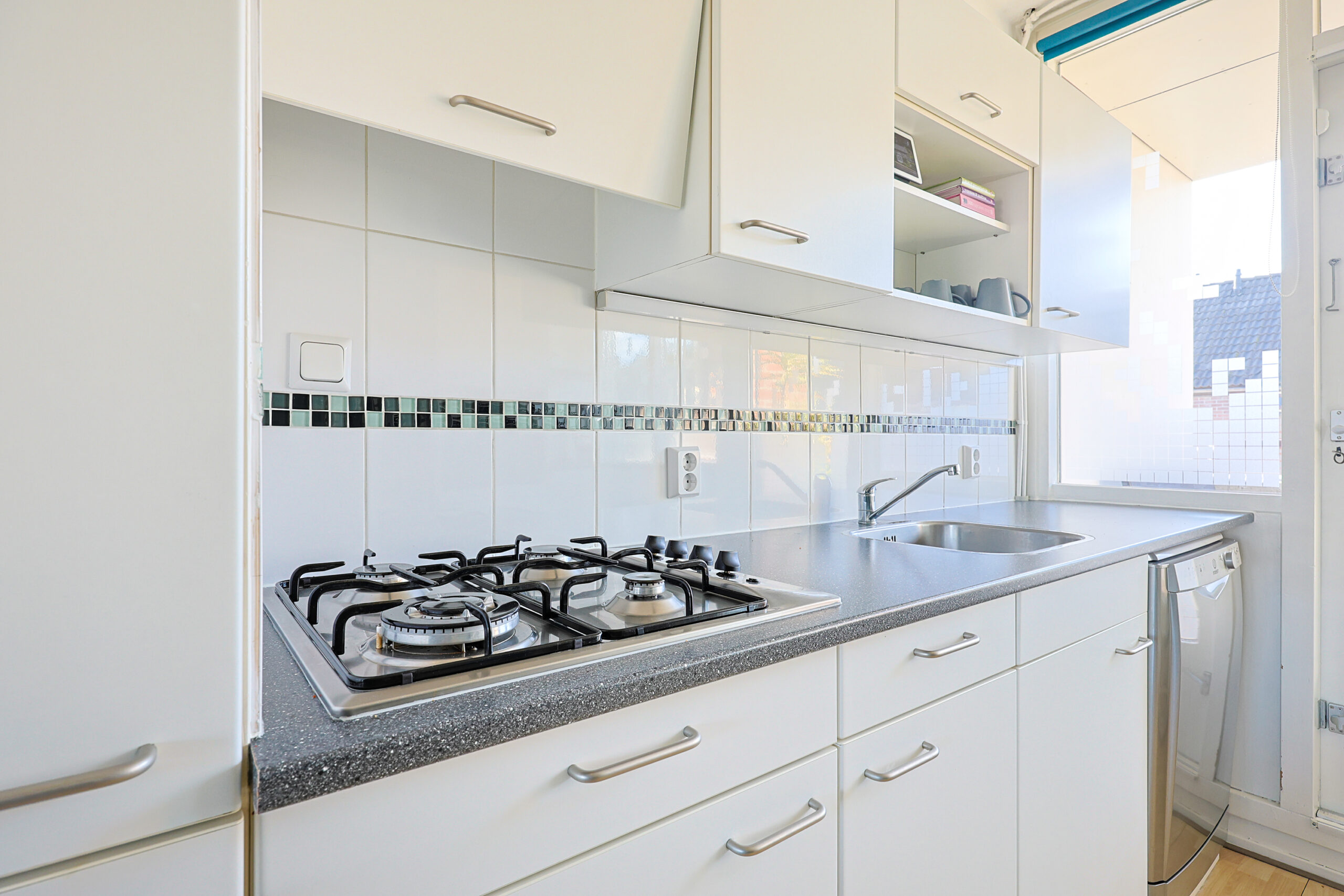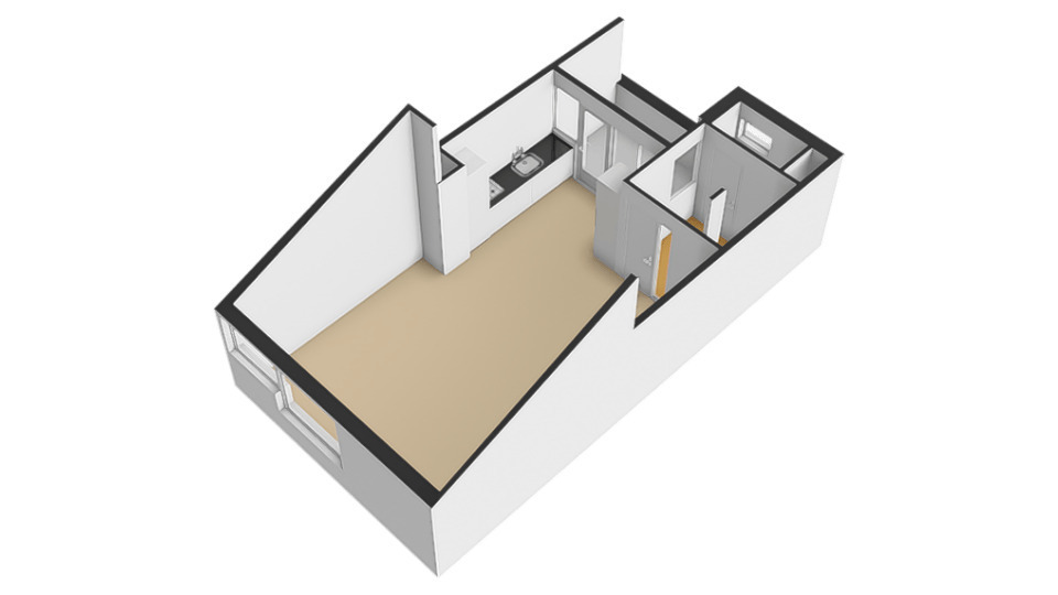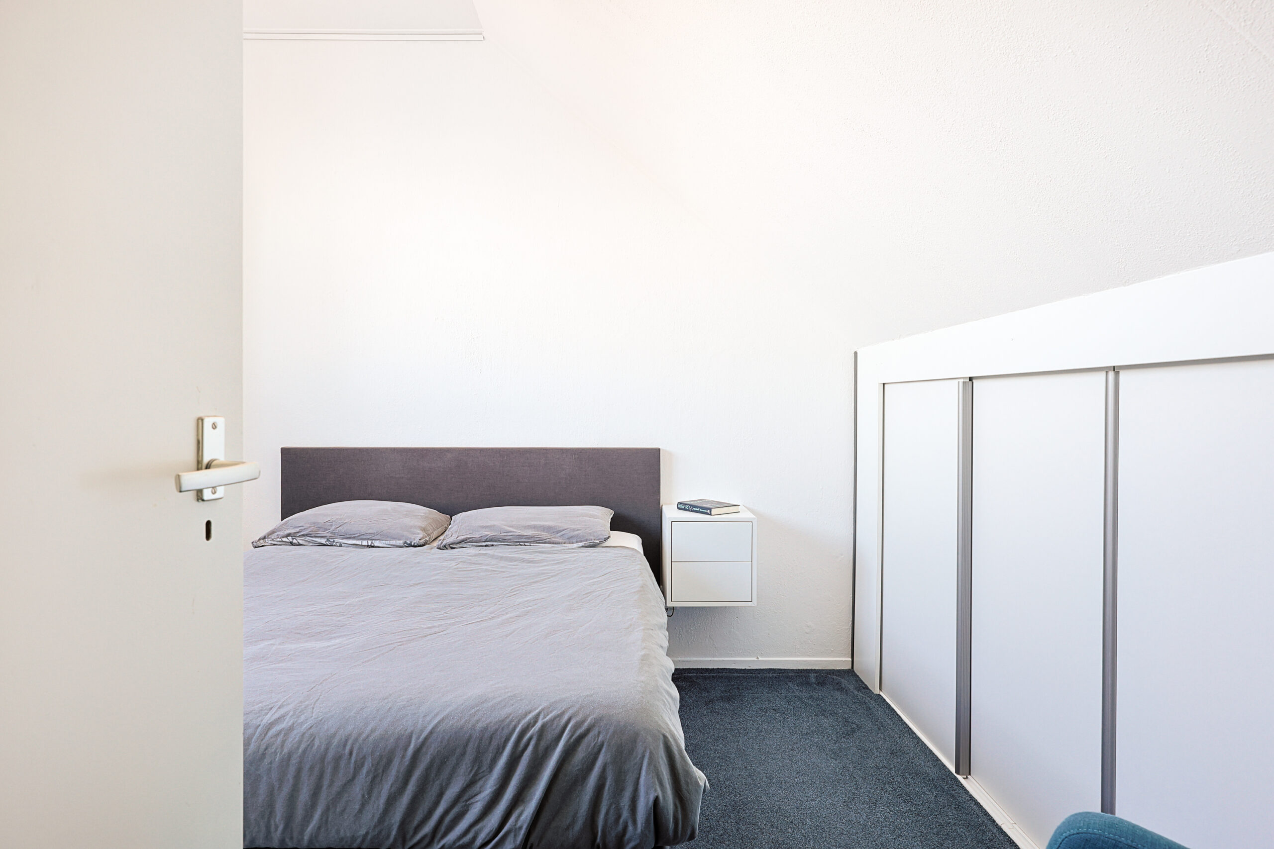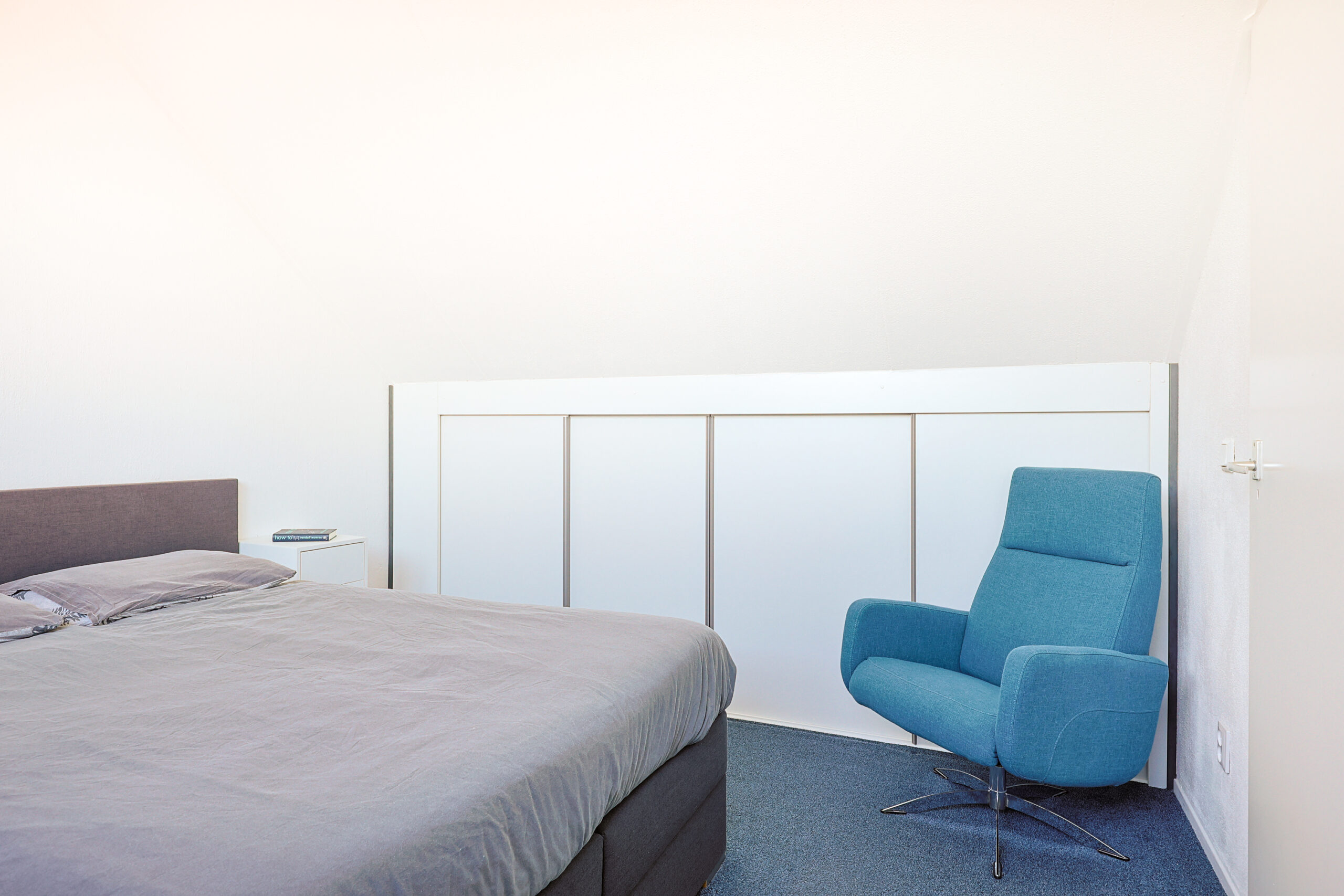 TWEEDE VERDIEPING: De woonkamer valt direct op door de schuine kap: een detail dat de ruimte een uniek en speels karakter geeft. Het maakt de woning net even anders dan de standaard appartementen. Samen met de goede lichtinval voelt het geheel ruim en sfeervol aan, een fijne plek om te ontspannen of gasten te ontvangen. Aansluitend bevindt zich de open keuken met de benodigde inbouwapparatuur. Vanuit de keuken wordt er ook toegang geboden tot de ruime loggia op het zuiden of je nu ’s ochtends een kop koffie drinkt of ’s avonds nog even van de zon wilt genieten, hier kan het allemaal. Op deze verdieping is er ook een toiletruimte.