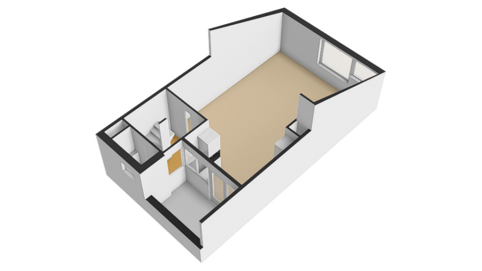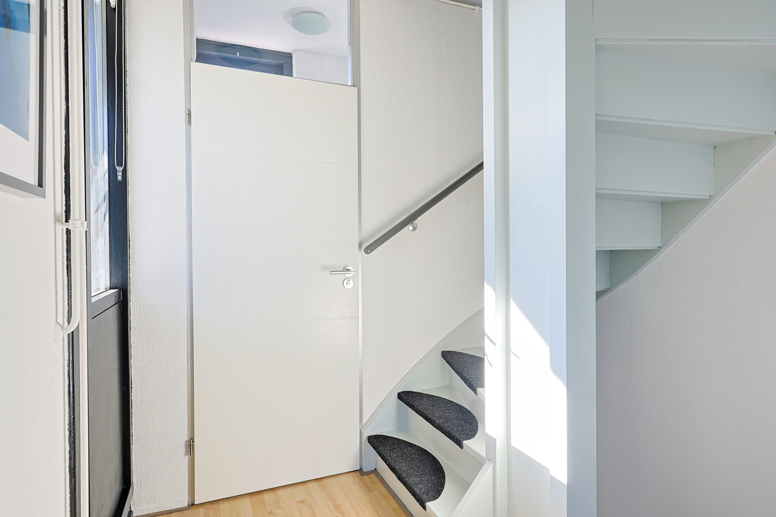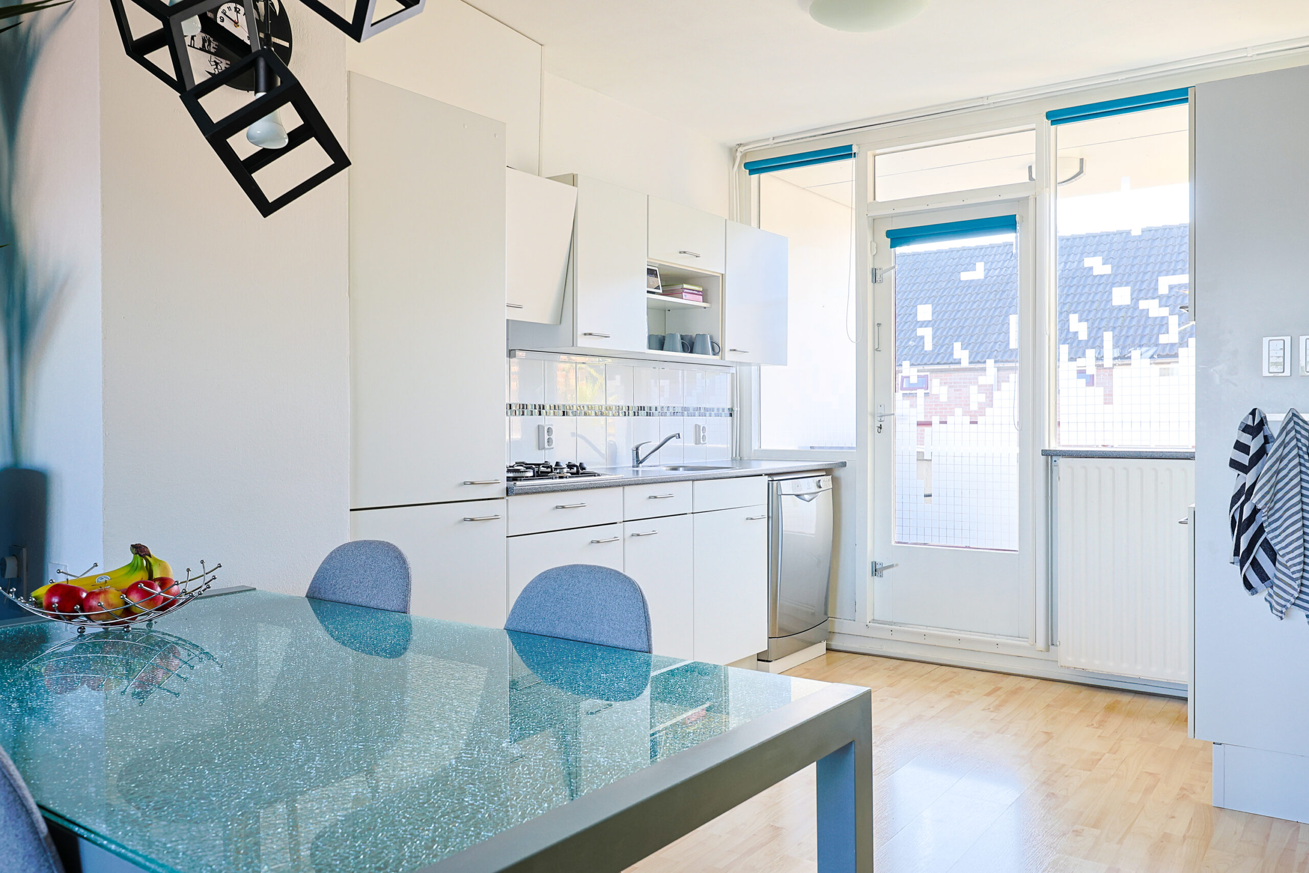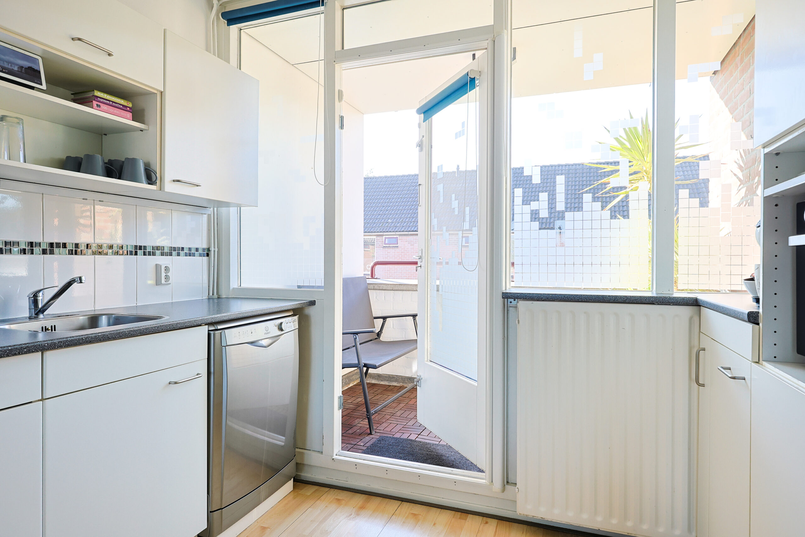 TWEEDE VERDIEPING: De woonkamer valt direct op door de schuine kap: een detail dat de ruimte een uniek en speels karakter geeft. Het maakt de woning net even anders dan de standaard appartementen. Samen met de goede lichtinval voelt het geheel ruim en sfeervol aan, een fijne plek om te ontspannen of gasten te ontvangen. Aansluitend bevindt zich de open keuken met de benodigde inbouwapparatuur. Vanuit de keuken wordt er ook toegang geboden tot de ruime loggia op het zuiden of je nu ’s ochtends een kop koffie drinkt of ’s avonds nog even van de zon wilt genieten, hier kan het allemaal. Op deze verdieping is er ook een toiletruimte.
