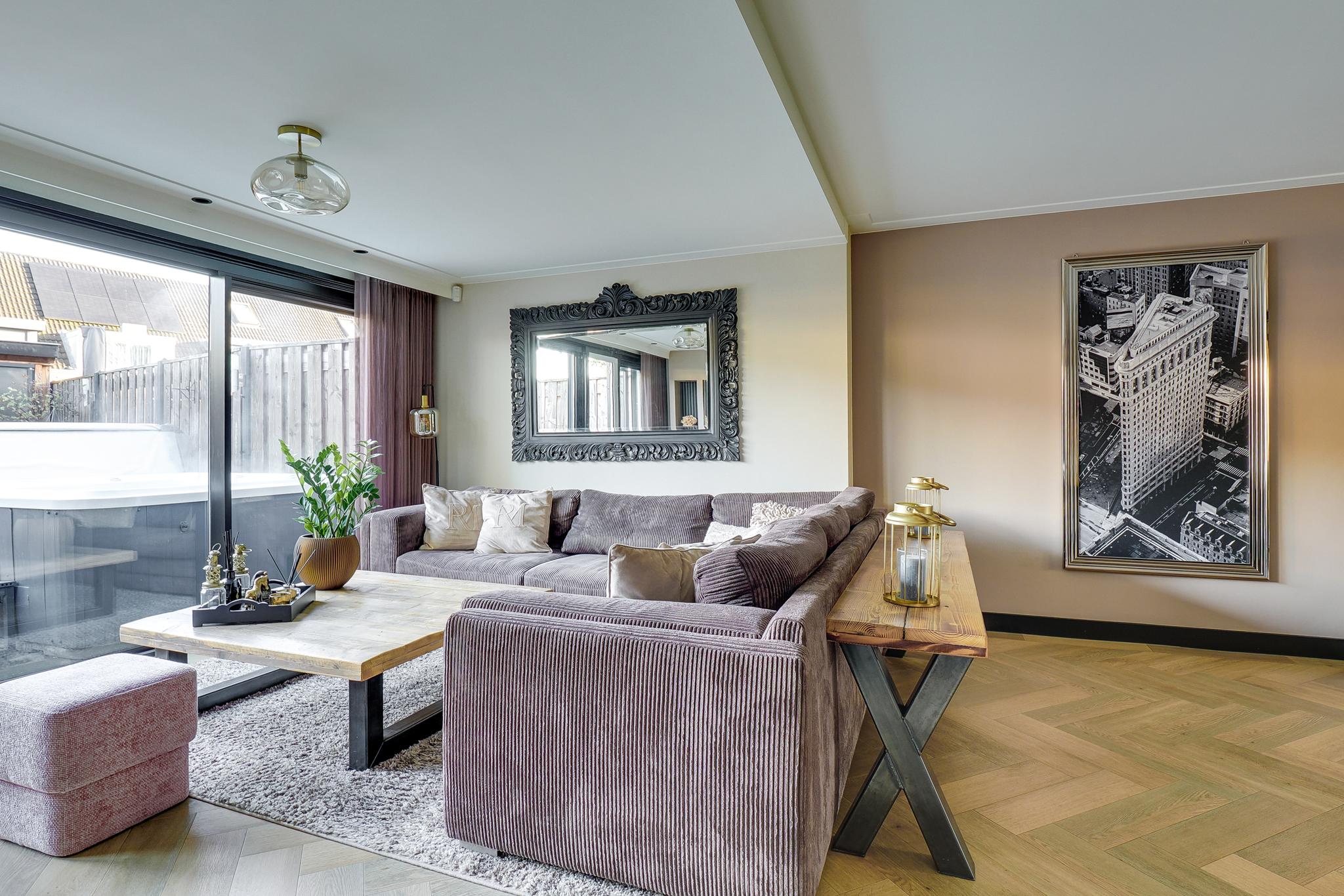 Begane grond: Entree met meterkast en toegang naar de keuken en woonkamer. Aan de voorzijde van de woning vind je de moderne half open keuken die voorzien is van luxe inbouwapparatuur waarvan onder andere een inductie kookplaat met geïntegreerde afzuiging in U-opstelling. De woonkamer is aan de achterzijde uitgebouwd waardoor een ruime, lichte woonkamer is ontstaan. De begane grond is voorzien van een visgraat PVC-vloer en vloerverwarming. In de achtertuin bevindt zich een grote afgesloten verwarmde veranda van circa 19,2 m2. Tevens is de veranda voorzien van een vaste kast en extra bergruimte.