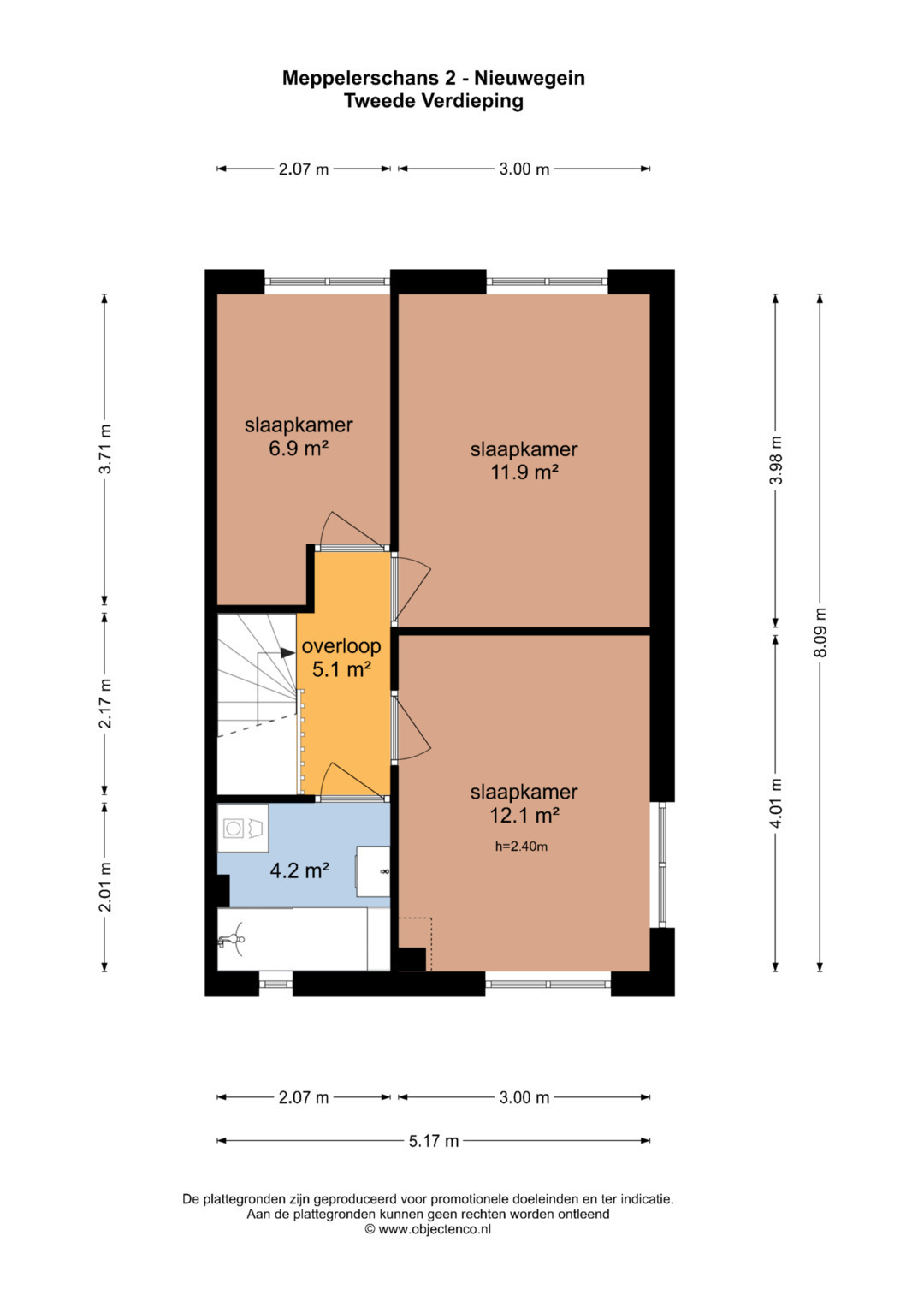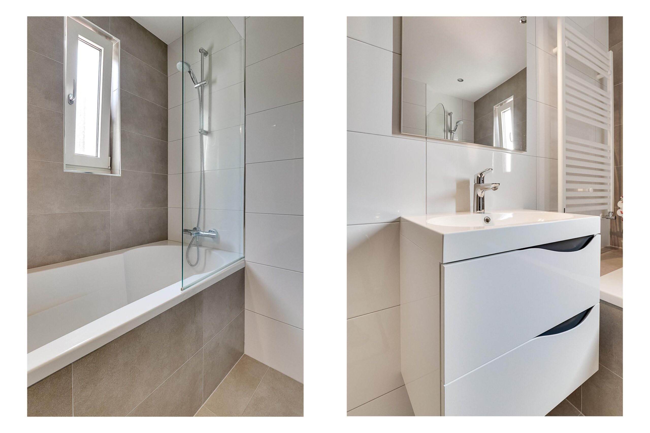 2e Verdieping: Overloop met toegang tot drie slaapkamers van circa 12,1 m², 6,9 m² en 11,9 m². De badkamer is uitgevoerd met een ligbad, wastafelmeubel en een aansluiting voor de wasmachine.
