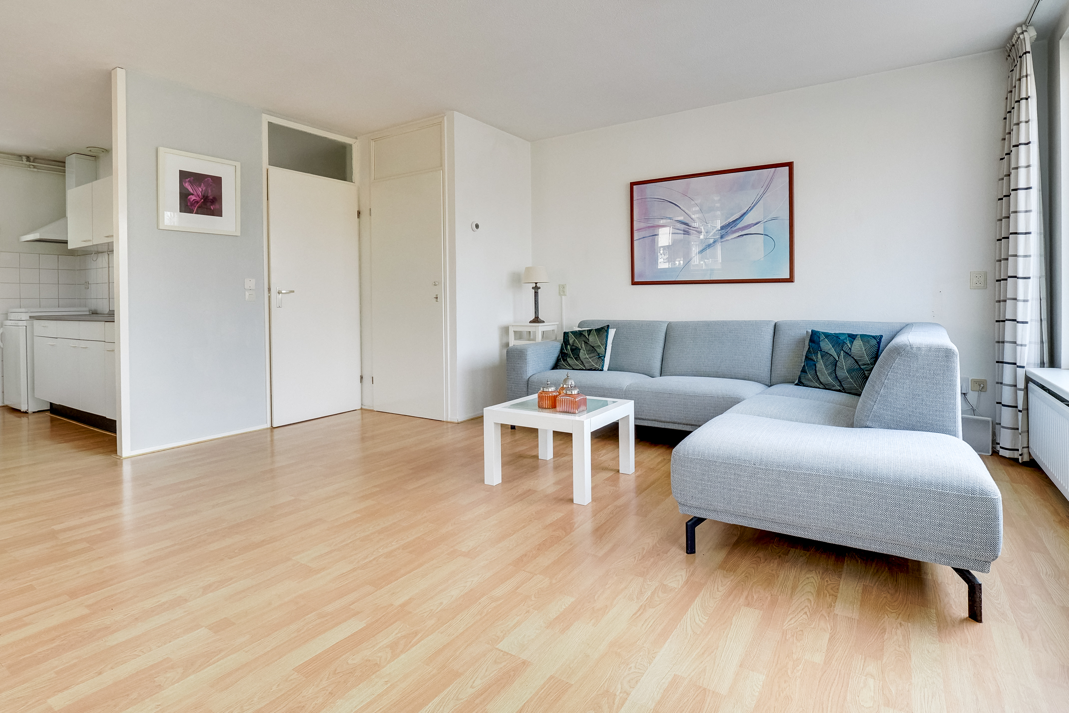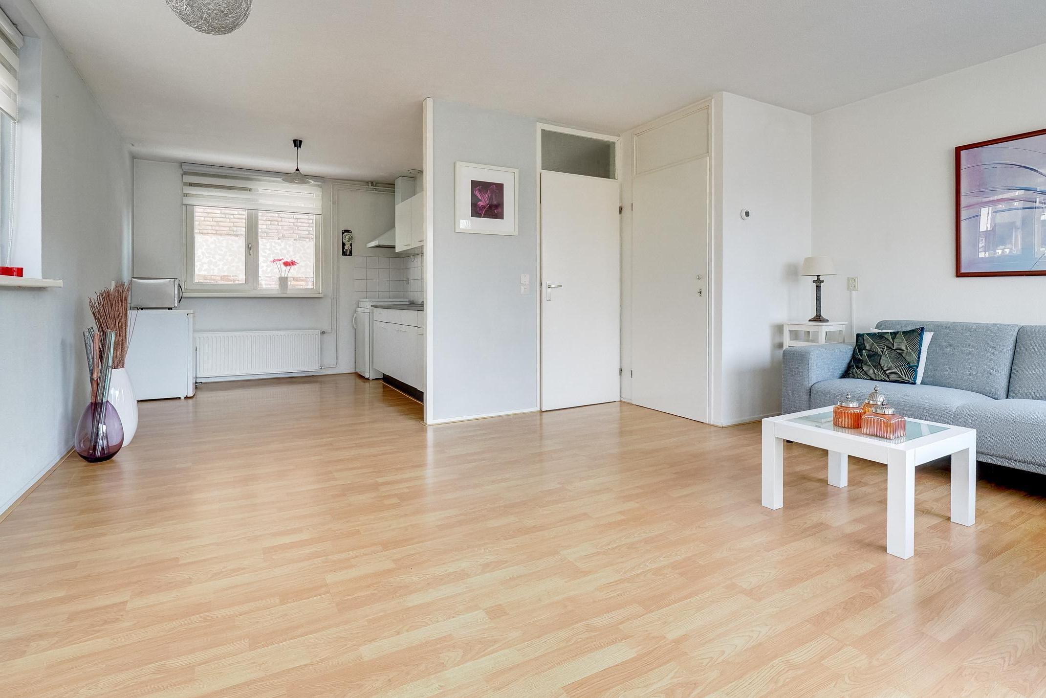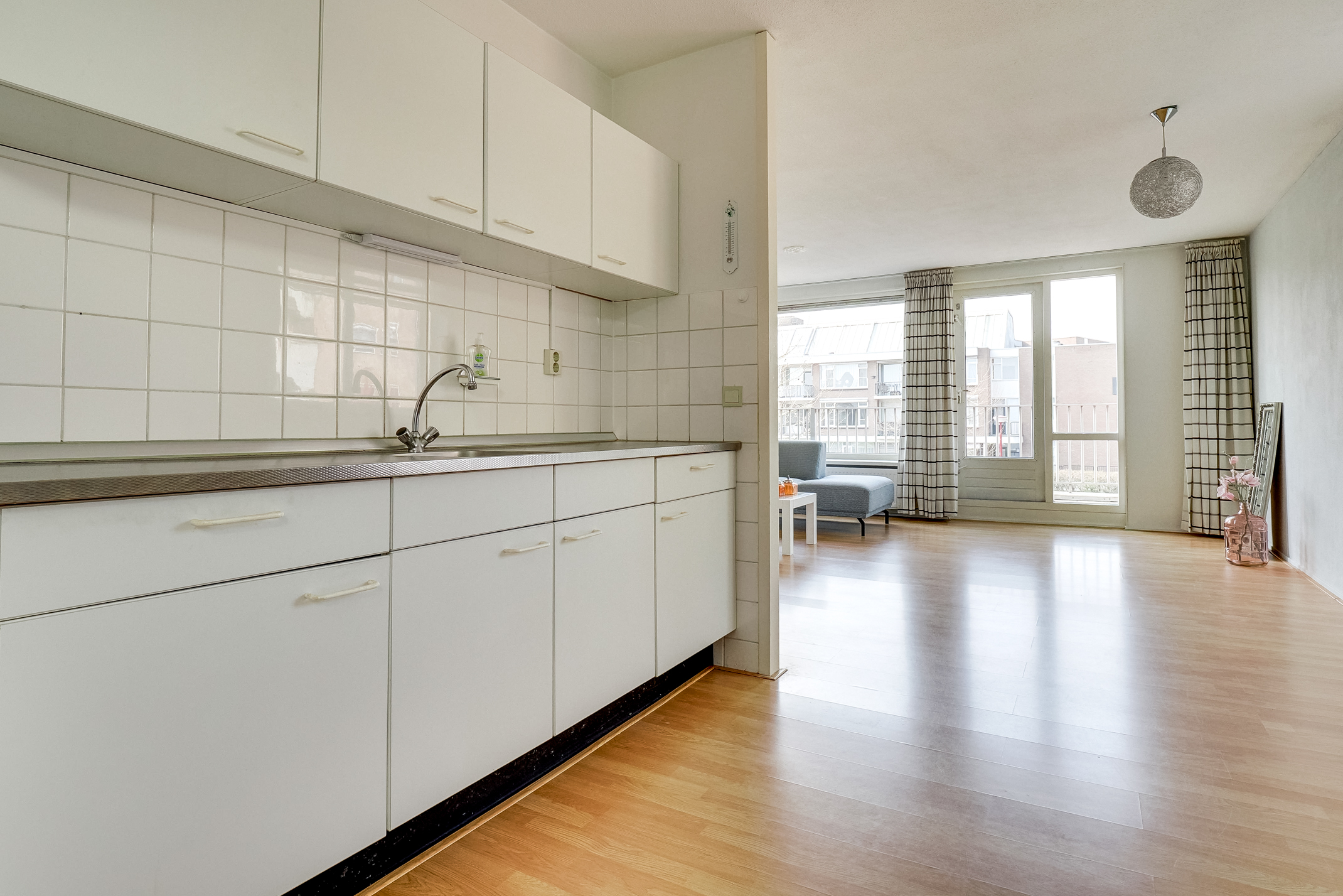 1e Verdieping: Entree, hal met meterkast, toiletruimte, trapopgang naar de tweede verdieping en toegang tot de woonkamer en keuken. De woonkamer is ruim van opzet en geniet van veel lichtinval dankzij de grote raampartijen. Vanuit de woonkamer heb je toegang tot het balkon dat over de gehele breedte van de woning is gelegen en is gesitueerd op het westen. Hier kun je in de middag en avond heerlijk van de zon genieten. De keuken bevindt zich aan de voorzijde van de woning en is eenvoudig uitgevoerd.