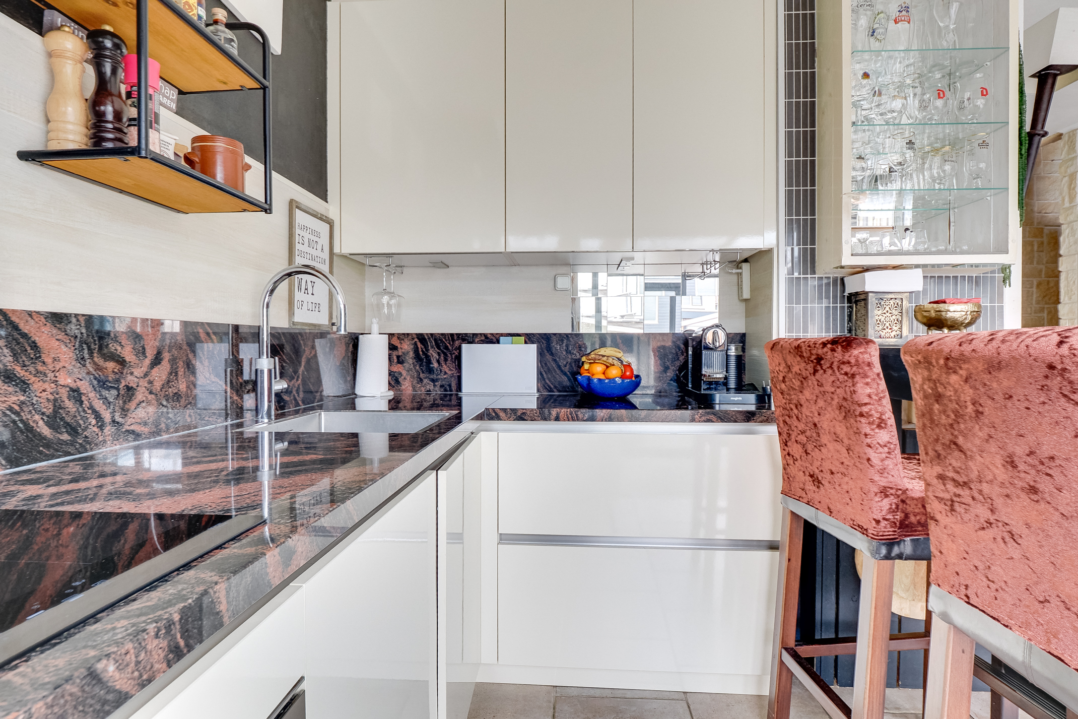 • Luxe keuken voorzien van inrichting in U-opstelling met diverse inbouwapparatuur.
