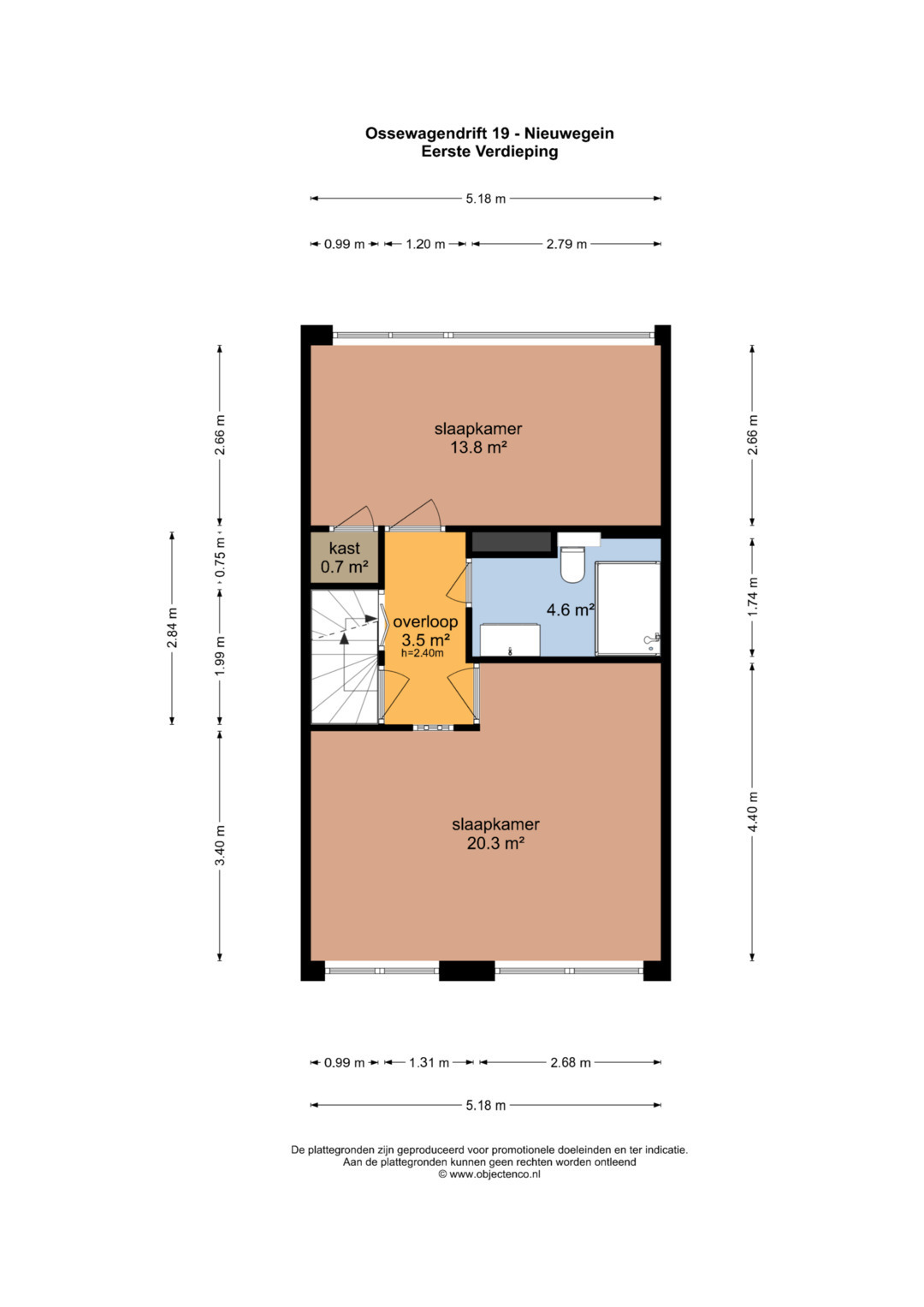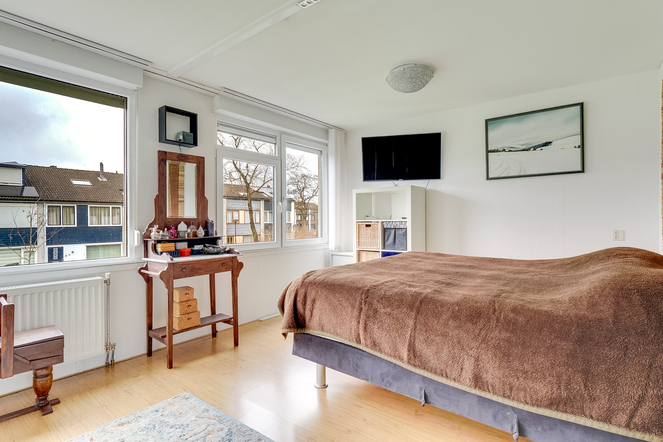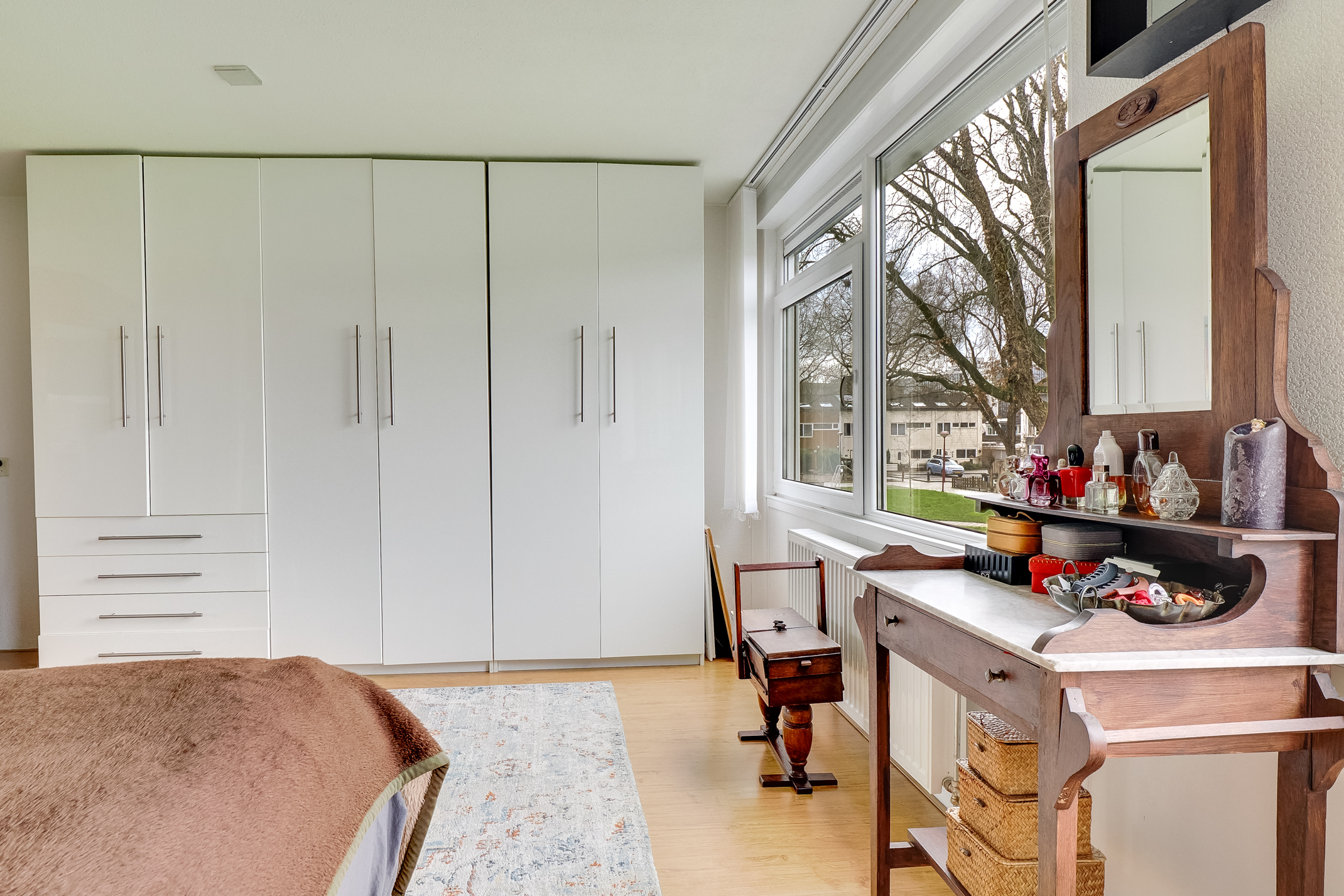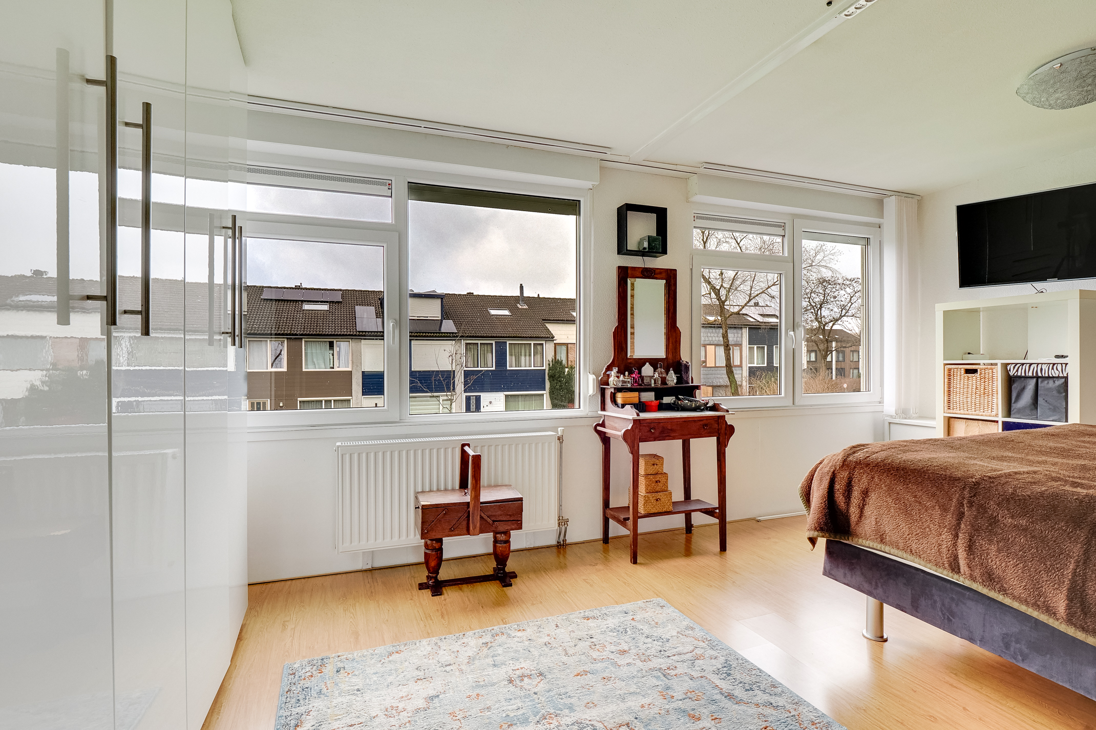 1e Verdieping: Overloop met toegang naar 2 ruime slaapkamers van respectievelijk ca. 20,3 m² en 13,8 m², de grote slaapkamer is voorzien van vaste kastenwand. Badkamer voorzien van inloopdouche, wastafelmeubel en 2e toilet.