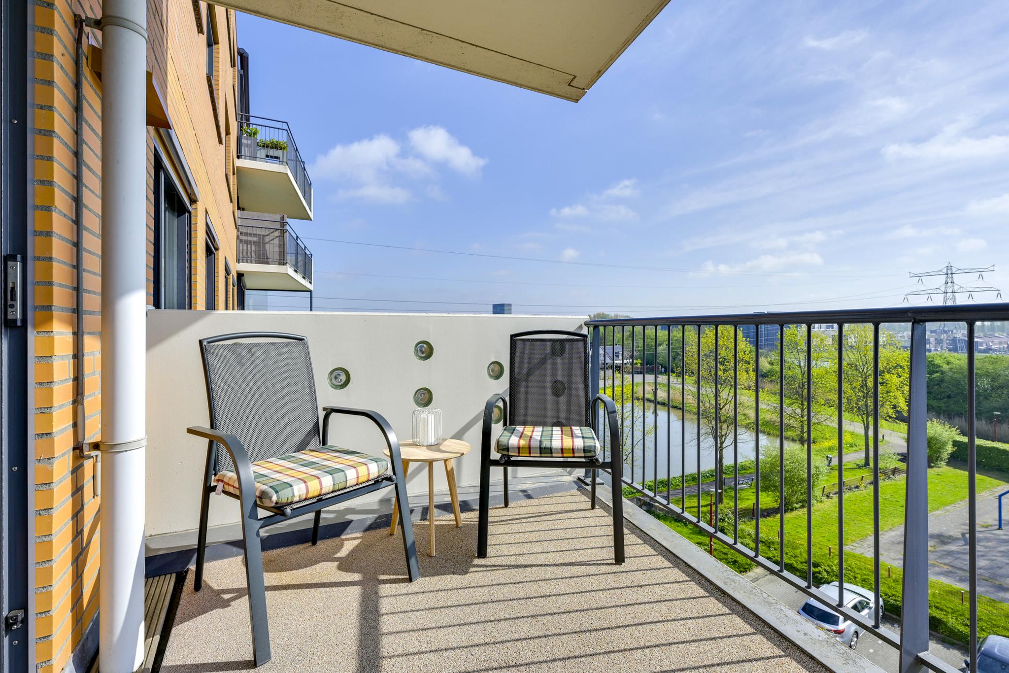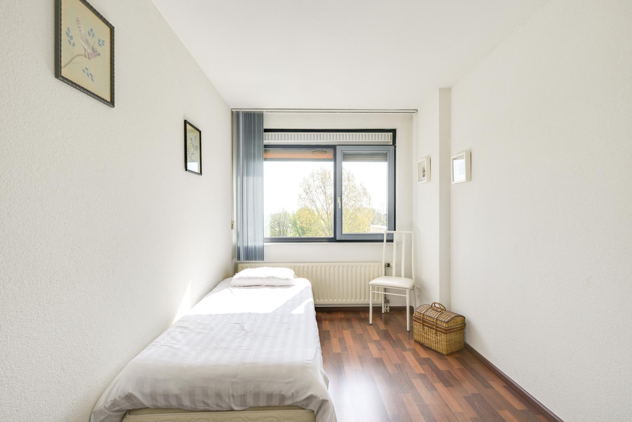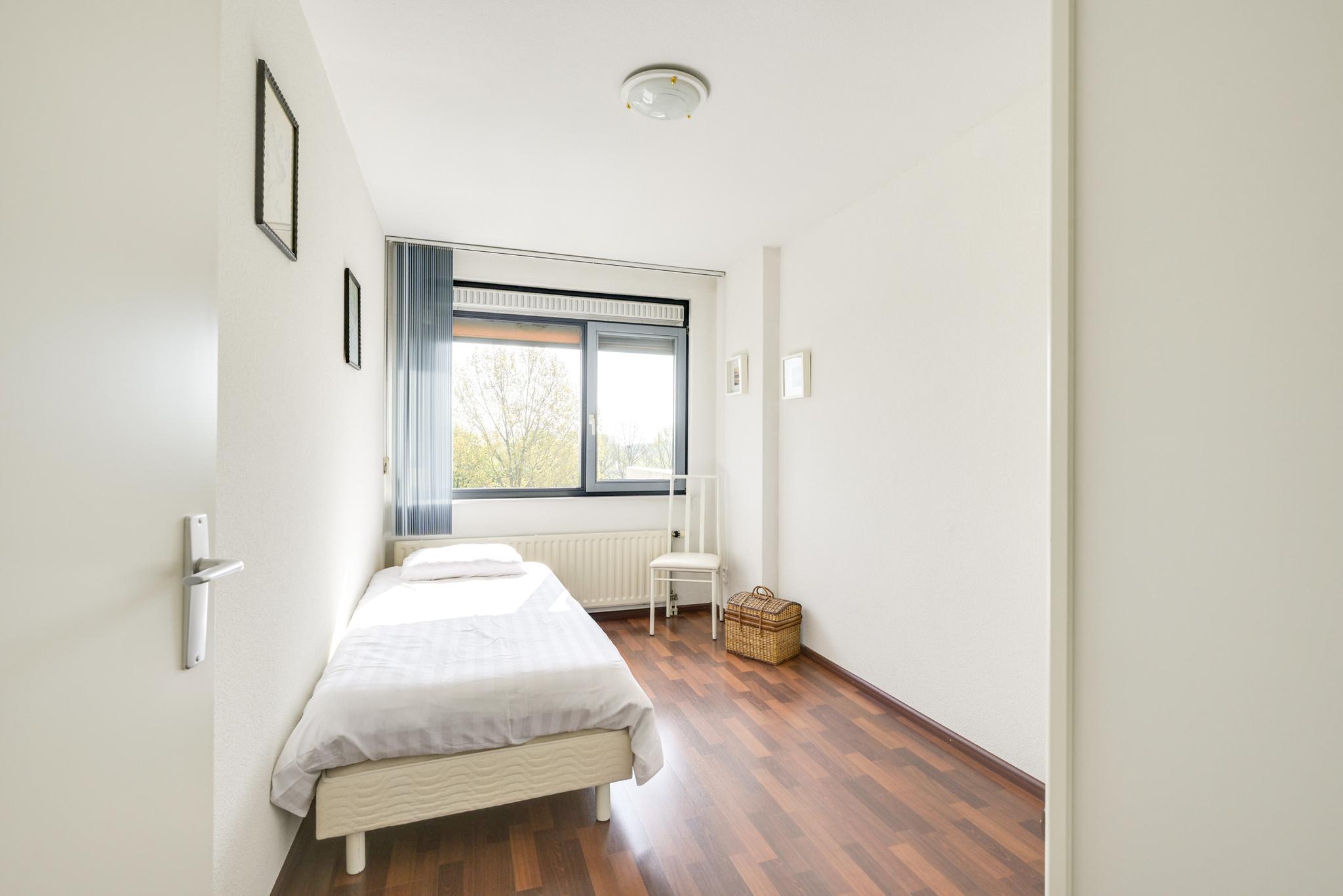 4E VERDIEPING: Entree met bergkast van circa 2 m2, welke toegang biedt tot de L-vormige lichte en ruime woonkamer. De woonkamer is eenvoudig indeelbaar en biedt genoeg ruimte voor een fijne zithoek en gezellige eetkamer. Vanuit de woonkamer heb je middels schuifpui toegang tot het balkon. Het balkon biedt prettig uitzicht, is gesitueerd op het oosten en is voorzien van een handmatig zonnescherm. Tussen de woonkamer en de bijkeuken is de nette keuken gesitueerd, het keukenblok is in een U-opstelling en beschikt over oven, elektrische kookplaat, afzuigkap en heeft veel werk en bergruimte. Vanuit de keuken is de bijkeuken bereikbaar. Deze praktische ruimte is circa 3,4 m2 en heeft veel bergruimte en de wasmachine-aansluiting. Verder bevinden zich twee slaapkamers van respectievelijk 13,7 en 9,5 m2 in het appartement. Ook is er een badkamer met ligbad, douche en wastafelmeubel. Er is een separaat toilet met fontein.
