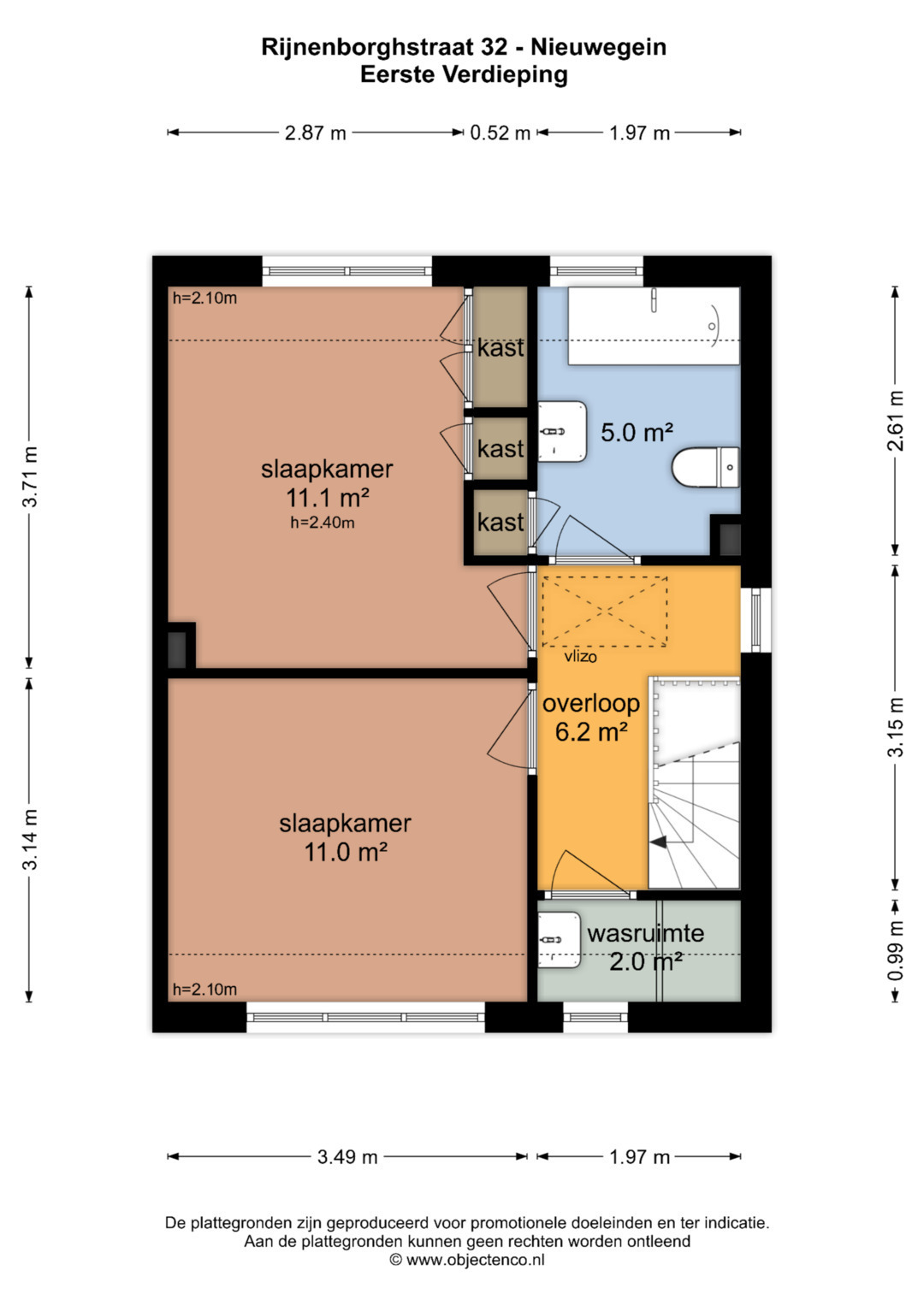 Eerste verdieping: Ruime overloop met toegang naar twee mooie slaapkamers van respectievelijk circa 11,0 m2 en 11,1 m2. De achterste slaapkamer is voorzien van vaste kasten. Aan de voorzijde van de woning tref je de voormalige badkamer aan die momenteel in gebruik is als waskamer. Aan de achterzijde is de derde slaapkamer opgeofferd voor een ruime badkamer die voorzien is van een tweede toilet, vaste wastafel en een ligbad.
