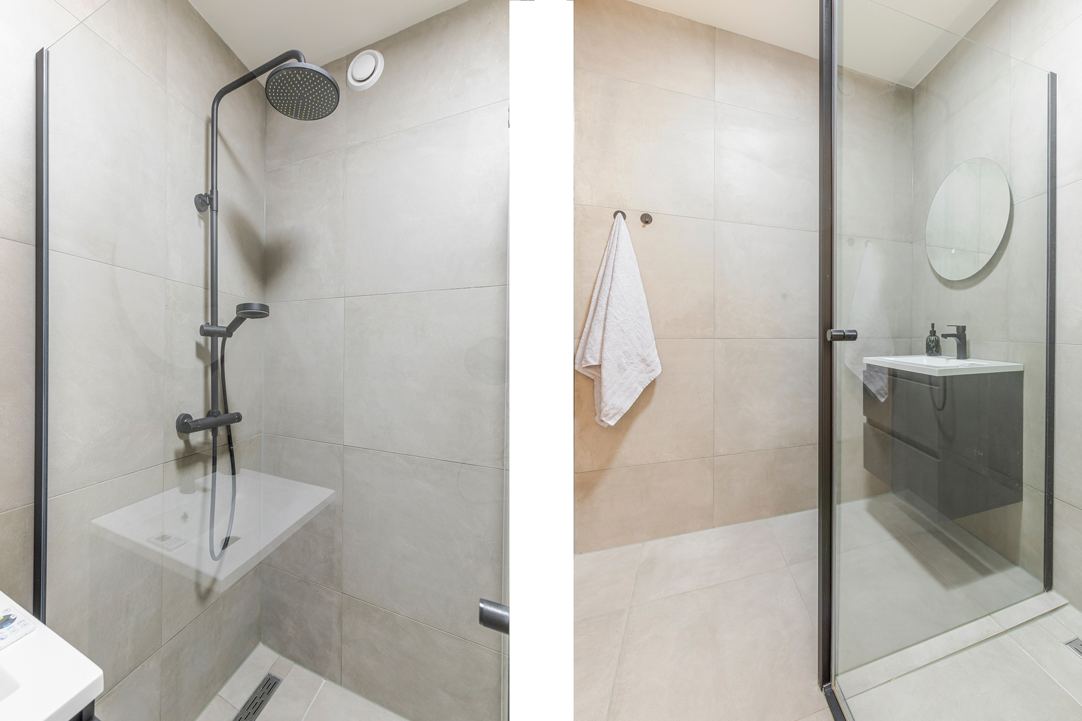 – Moderne badkamer met inloop douche en badkamermeubel.