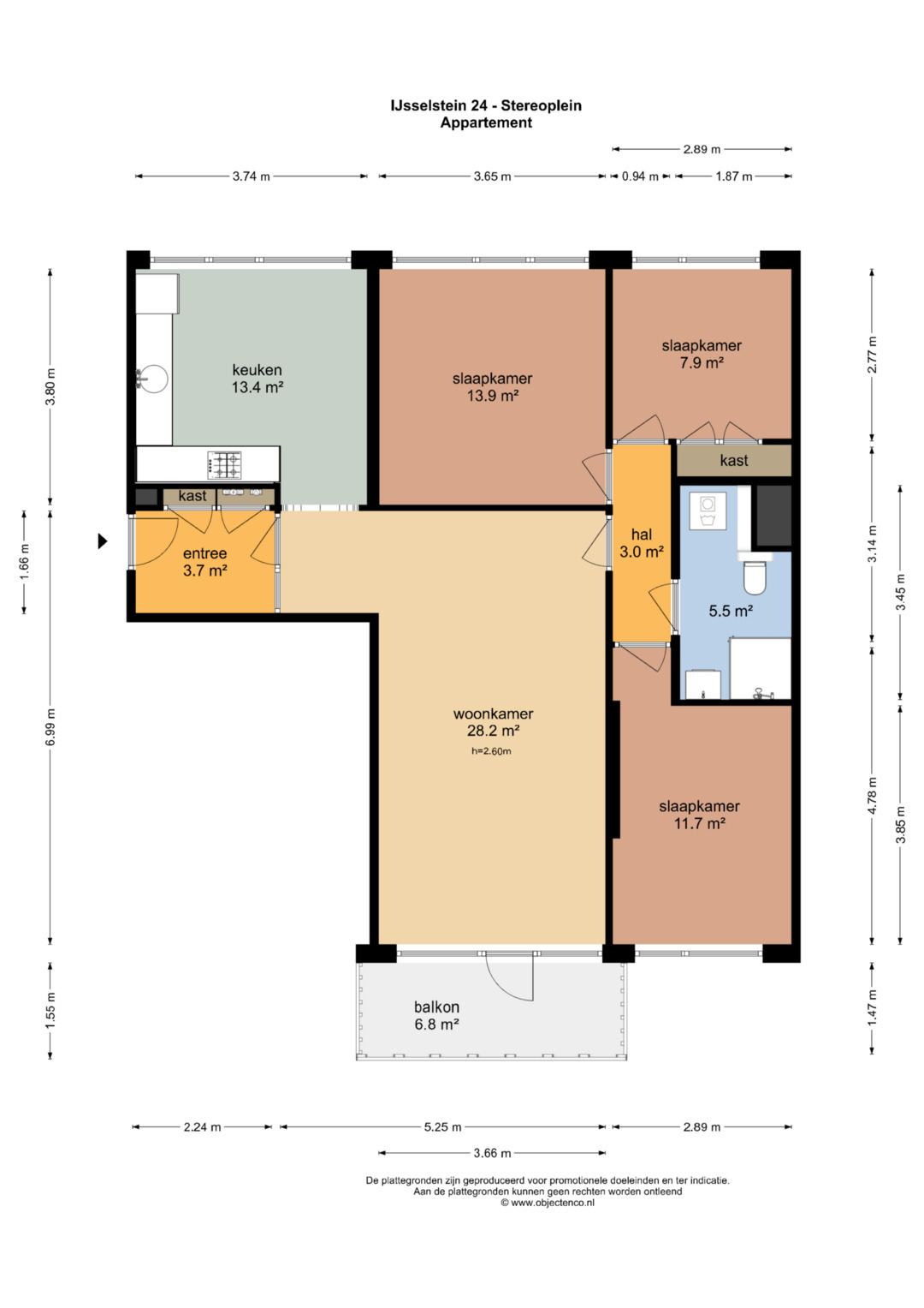 Eerste verdieping: Vanuit het ruime portiek heb je toegang naar de entree van het appartement en bereik je de ruime hal met meterkast en bergruimte. Van hieruit heb je toegang naar de zeer ruime lichte woonkamer van circa 28,2 m2 en tevens de halfopen keuken van circa 13,4 m2. De halfopen keuken is momenteel in gebruik als eetkamer met een keurige keukeninrichting in L opstelling welke voorzien is van diverse apparatuur. Vanuit de woonkamer heb je toegang naar de tussenhal om de 3 ruime slaapkamers te bereiken van respectievelijk circa 11,7 m2, 13,9 m2 en 7,9 m2. Tussen deze slaapkamers ligt de ruime badkamer die voorzien is van een inloopdouche, toiletruimte en wastafelmeubel. Tevens bevindt zich hier de opstelplaats voor de wasmachine. Het gezellige ruime balkon is bereikbaar vanaf de woonkamer en heeft fraai uitzicht over groenvoorziening.