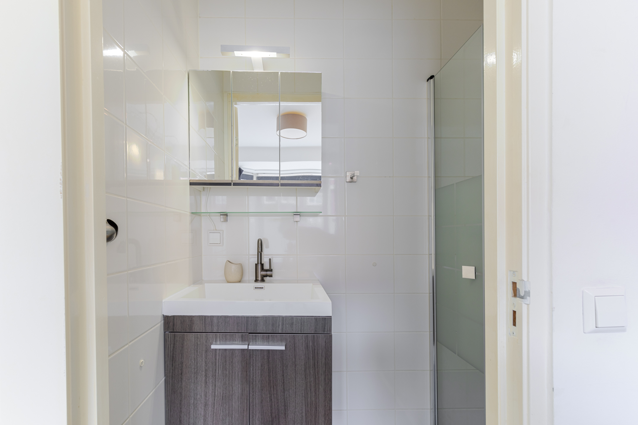 – Keurige badkamer met inloop douche en wastafelmeubel.