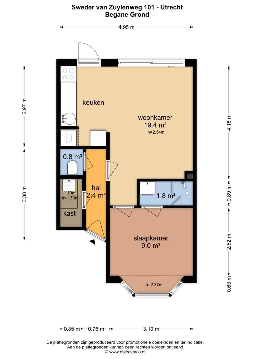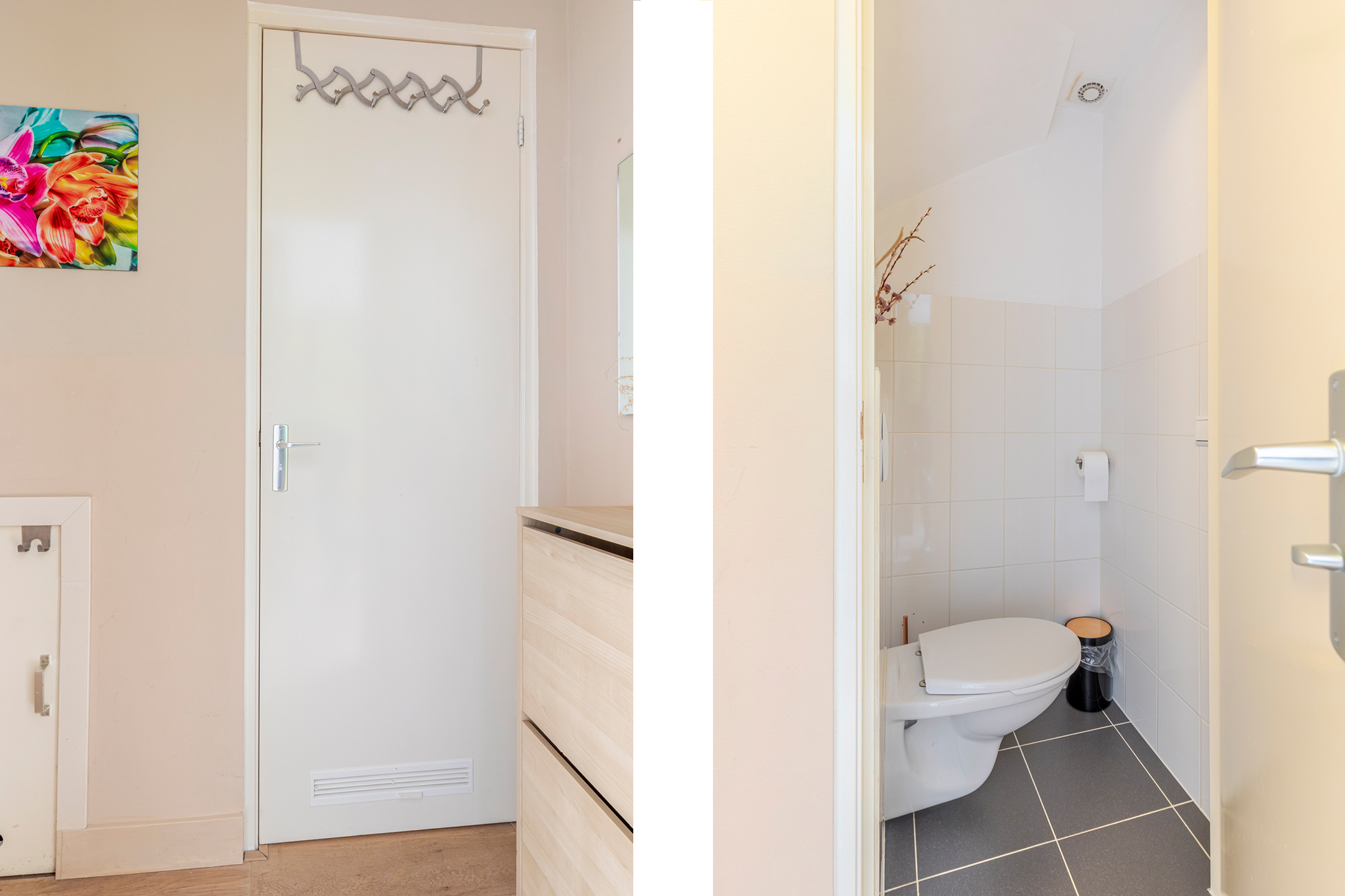 Begane grond: vanaf de straatzijde heb je toegang naar de royale hal van het complex. Vanuit deze hal heb je toegang naar je eigen appartement op de begane grond. In de hal bevindt zich een inpandige berging en een keurige moderne toiletruimte. Vanuit de hal bereik je de tuingerichte woonkamer die voorzien is van een mooie eikenvloer. Aan de achterzijde van de woonkamer bevindt zich de open keuken met keurige witte inrichting die voorzien is van inbouwapparatuur. Ook bevindt zich hier de was kast met opstelling cv. Vanuit de woonkamer heb je toegang naar de gezellige slaapkamer van ca. 9 m2 die voorzien is van een gezellige erker. Vanuit de slaapkamer heb je toegang naar de moderne badkamer die voorzien is van een inloopdouche en een wastafelmeubel.