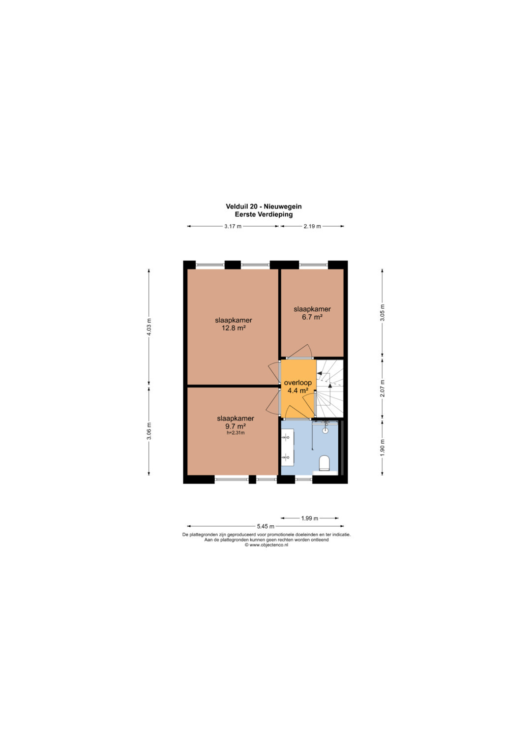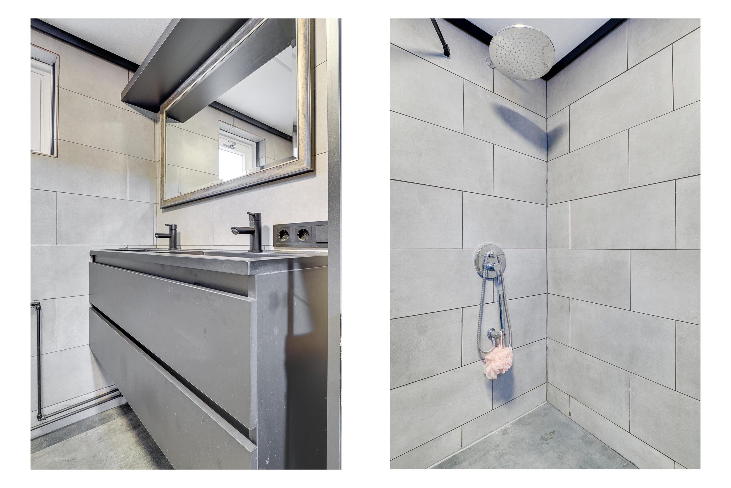 1e verdieping: Overloop, drie slaapkamers van respectievelijk ca. 13 m², 7 m² en 9 m². De badkamer heeft lichte tegels, een ligbad met (stort)douche, een wastafelmeubel met twee wasbakken en een tweede toilet.