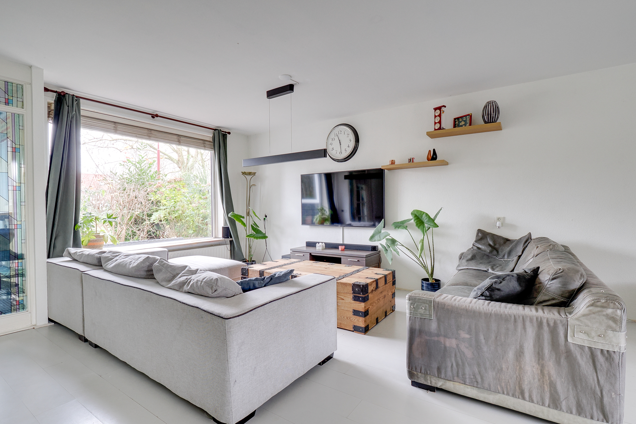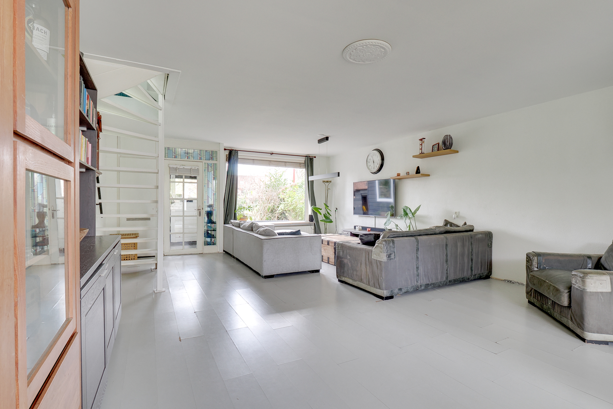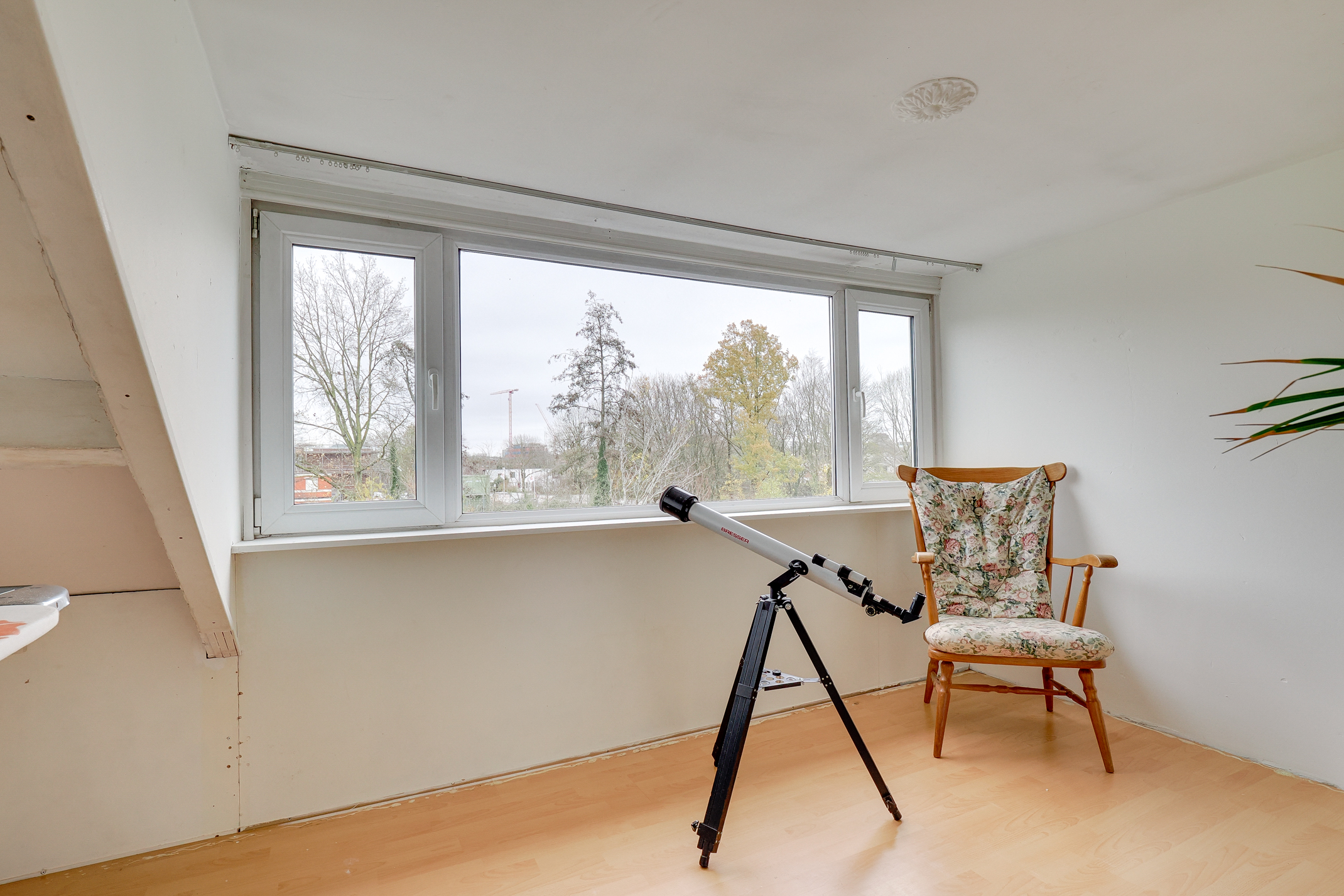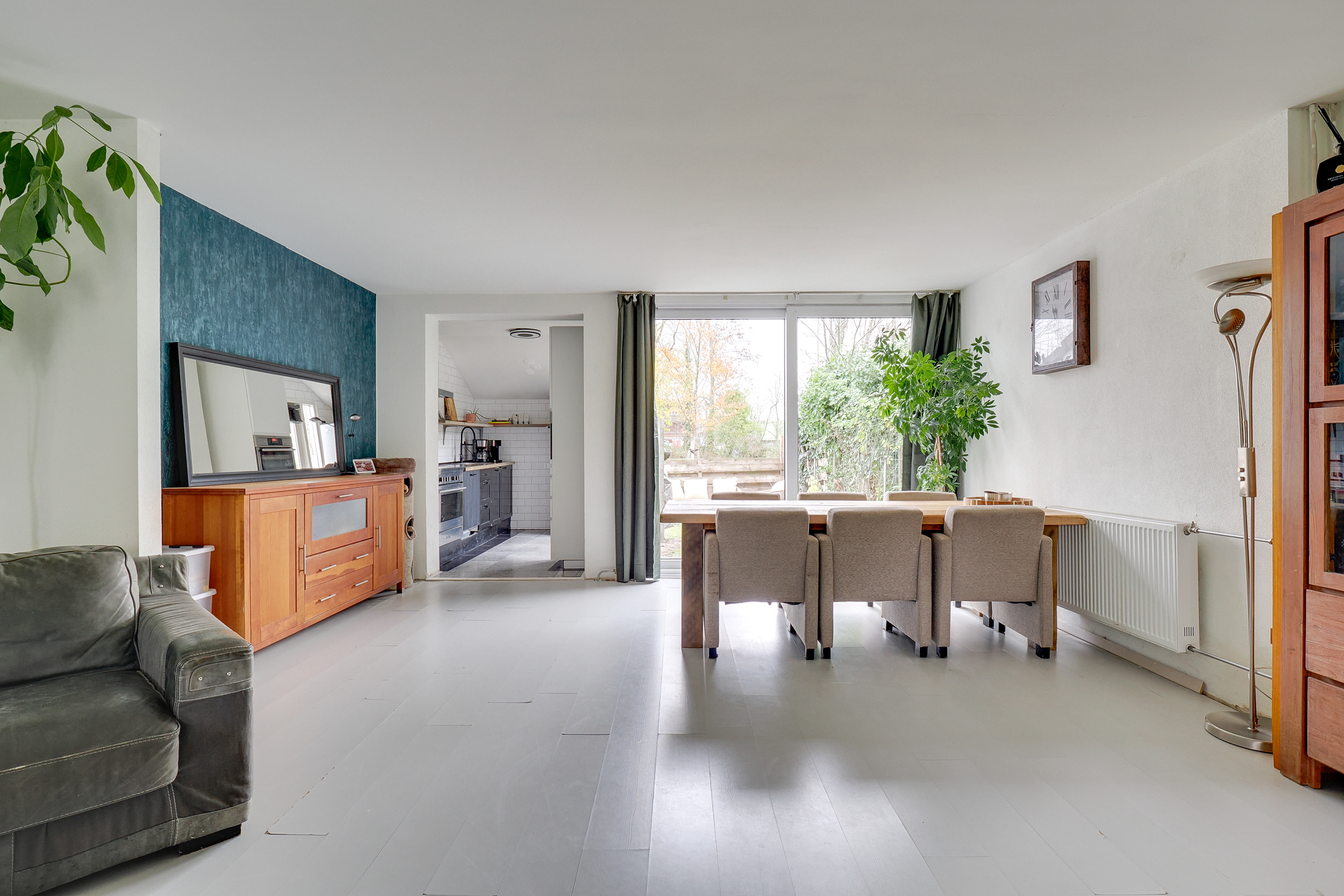 Begane grond: Entree, hal, toilet, toegang naar de woonkamer. De woonkamer is maar liefst 54,5 m² groot, met aan de voorzijde de plek van de eettafel waar je heerlijk zicht op de vijver hebt. Vanuit het zitgedeelte aan de achterzijde heb je mooi zicht op de bomen van het park en de knusse tuin. De keuken is in de voormalige berging geplaatst. Een open trap vanuit de woonkamer geeft toegang tot de verdieping.