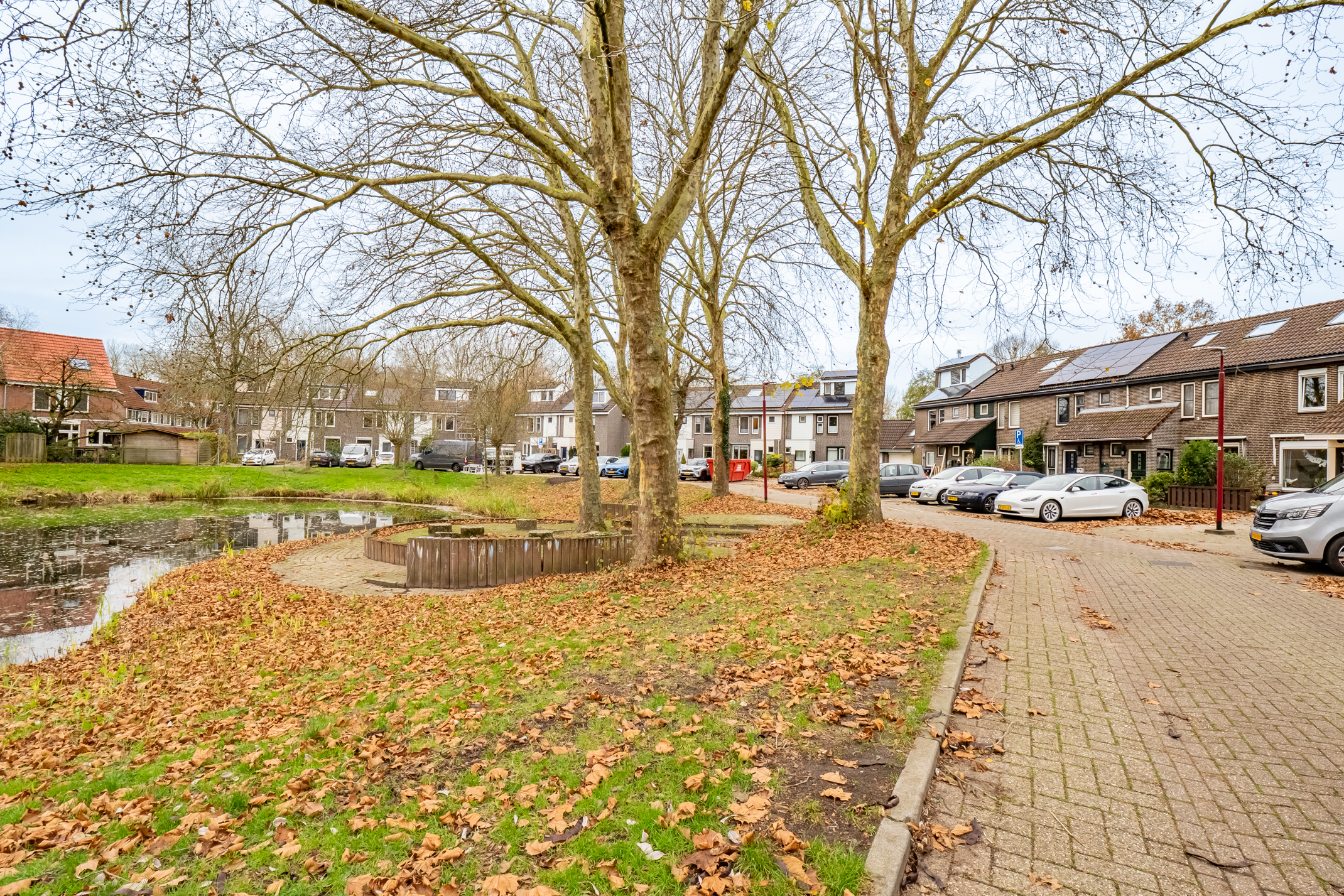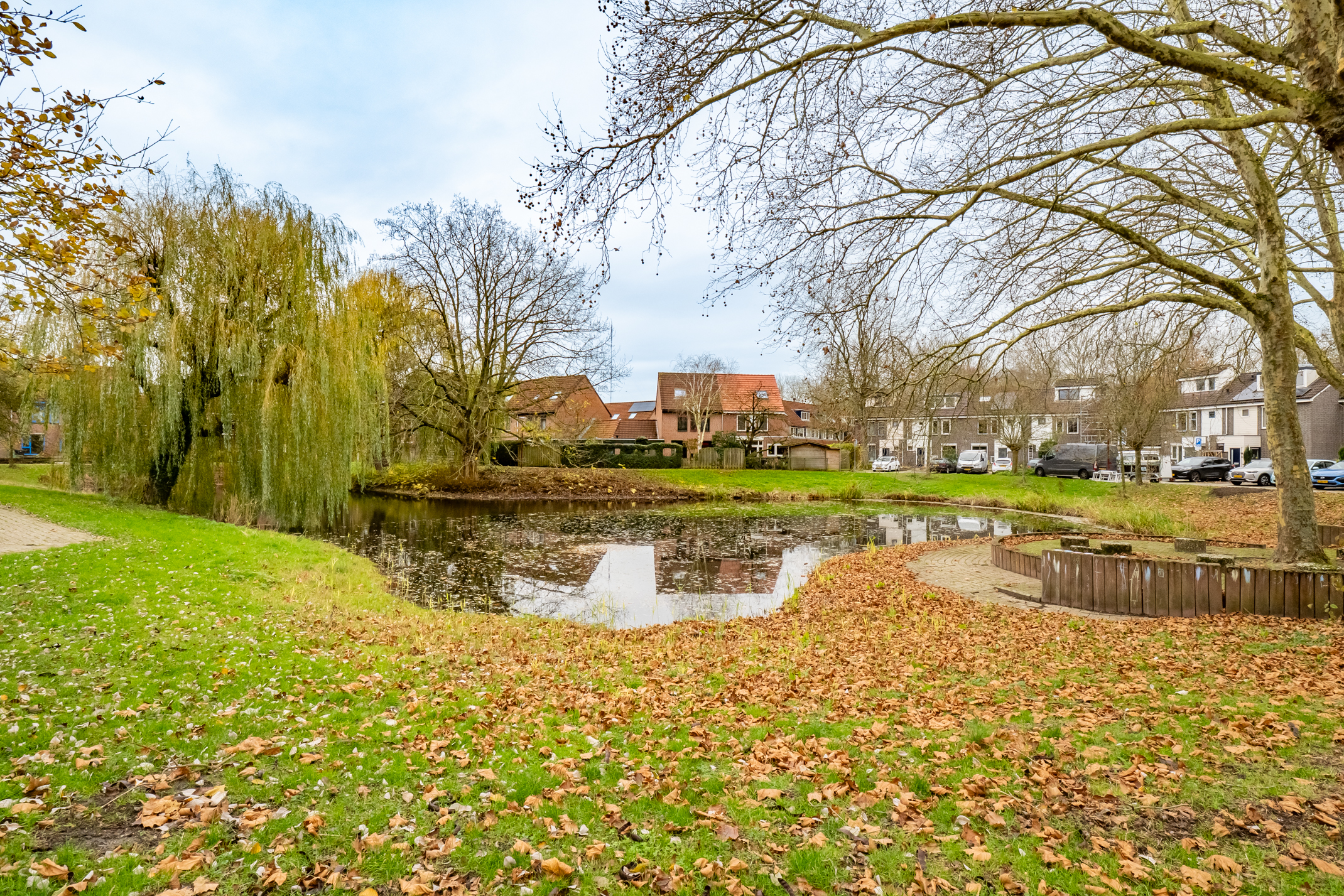 Sfeervolle, uitgebouwde eengezinswoning, gelegen op een heerlijk rustige en groene plek met aan de voor- en achterzijde veel ruimte en privacy. De woning is op de begane grond uitgebouwd en heeft daarmee een ruime woonkamer met een apart eetgedeelte. De keuken is in de voormalige berging ondergebracht. Aan de voorzijde is de woning gelegen aan een mooie vijverpartij; de straat is rustig: er komt alleen bestemmingsverkeer. De tuin grenst aan de achterzijde aan de Randijk en een park. Door de twee dakkapellen en de uitbouw is dit een zeer ruime woning geworden met een woonoppervlakte van maar liefst 129 m². Door de kunststof kozijnen is er nauwelijks onderhoud; alleen de voordeur en openslaande deuren in de keuken zijn nog van hout. De locatie is in één woord geweldig!