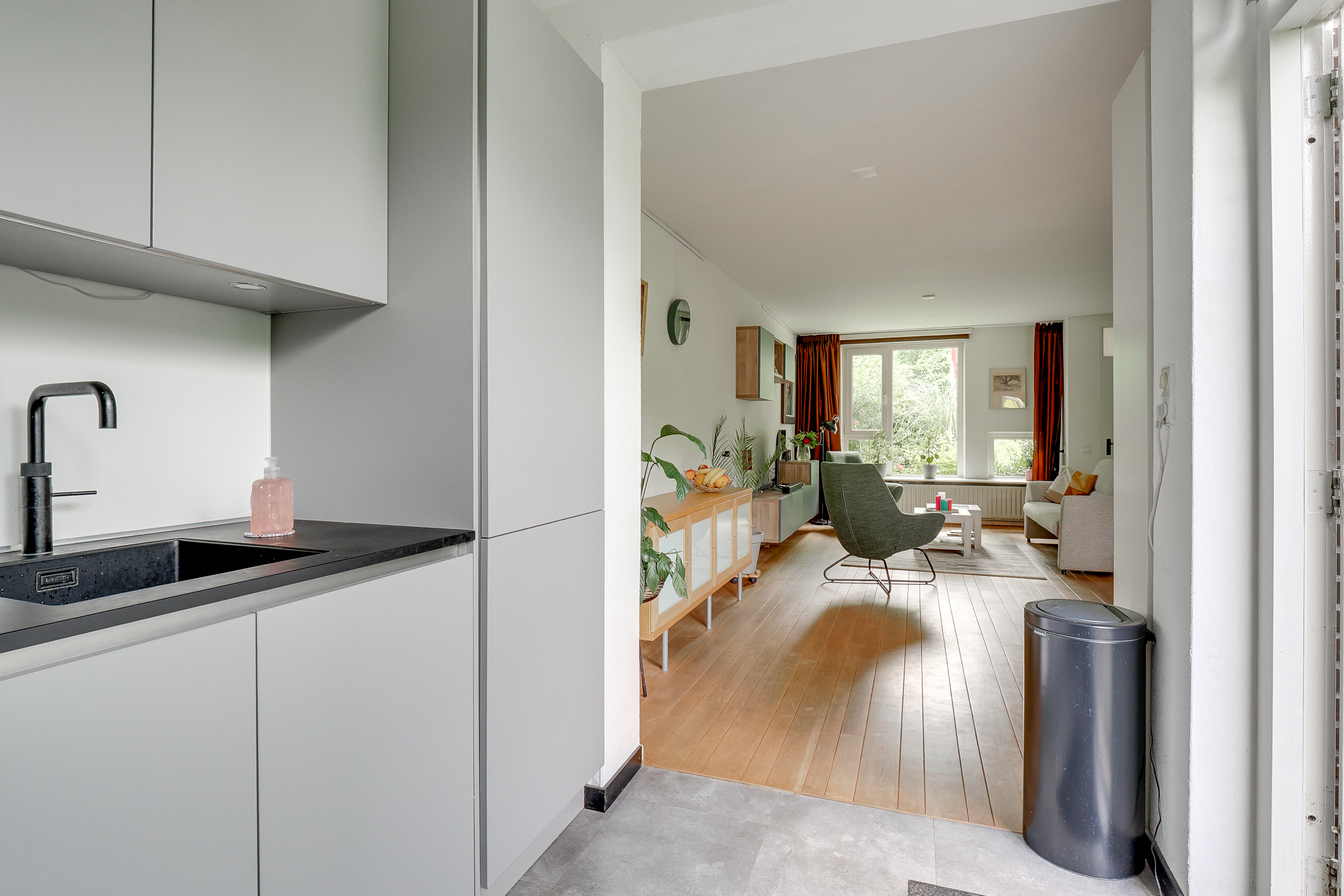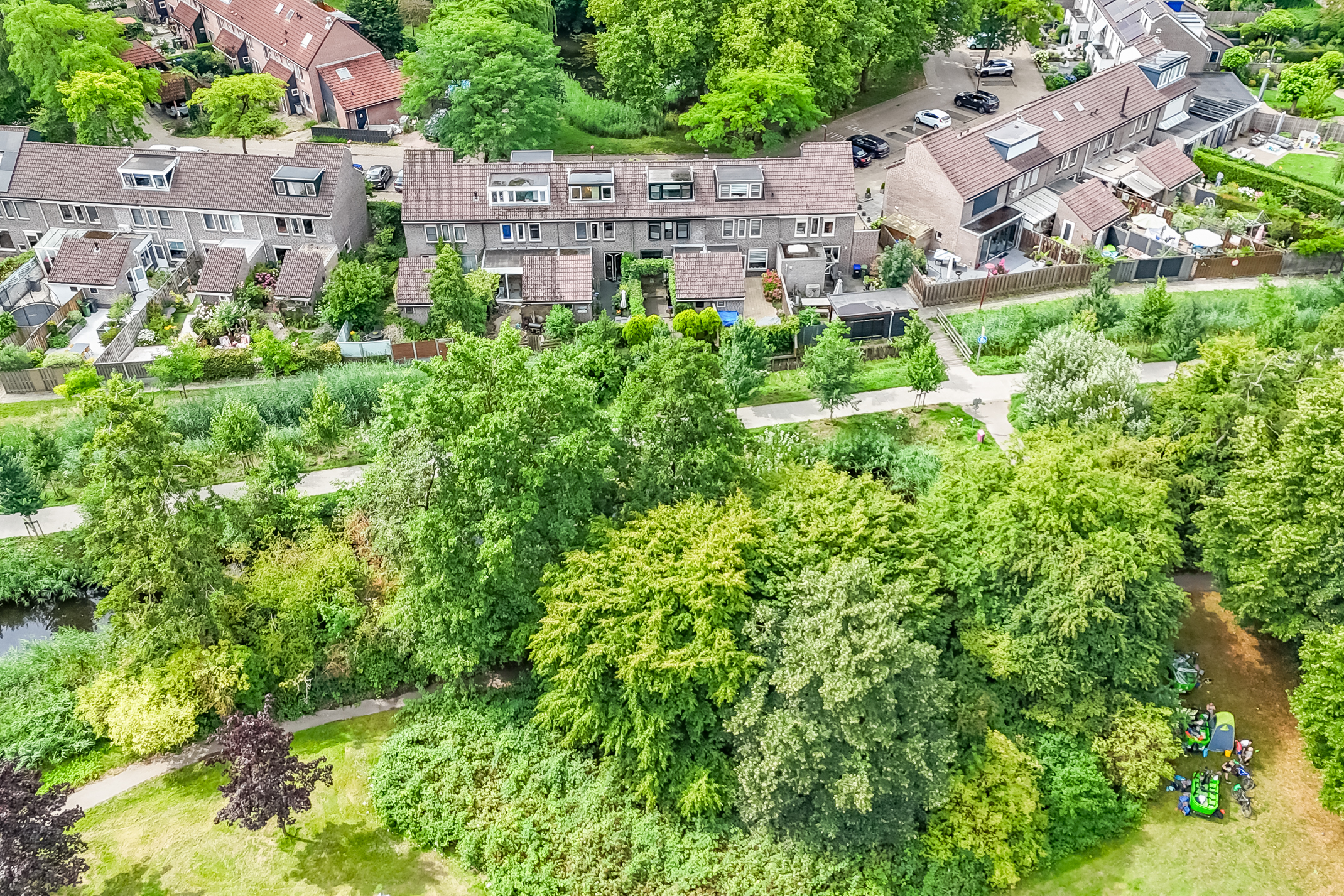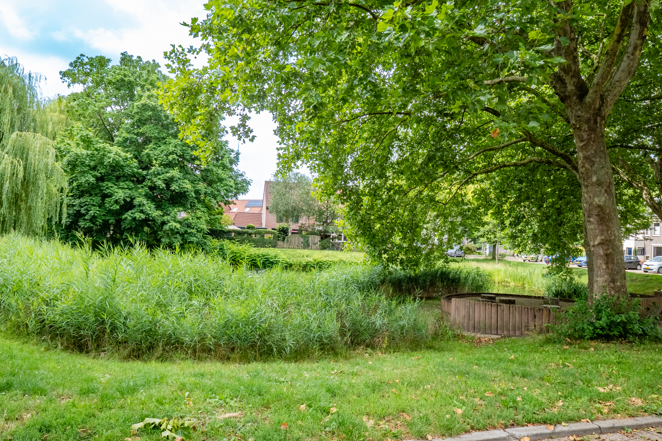 BEGANE GROND: Entree, hal, modern toilet en meterkast. Toegang tot de ruime woonkamer, welke prachtig uitzicht biedt over de vijverpartij. De woonkamer is goed indeelbaar, beschikt over openslaande deuren naar de tuin en is voorzien van een keurige parket vloer. De moderne keuken bevindt zich aan de achterzijde van de woning en is voorzien van een inductiekookplaat, vaatwassen, oven, koel-/vriescombinatie en Quooker kraan. Tevens biedt de keuken toegang tot de achtertuin. De keurig aangelegde, sfeervolle achtertuin van ca. 10 meter diep is een fijne besloten plek om te zitten. De tuin biedt zowel zon als schaduw, wat ideaal is met mooi weer. Tevens biedt de achtertuin toegang tot de berging van ca. 7,8 m2 en het direct aangrenzende park met speeltuin.