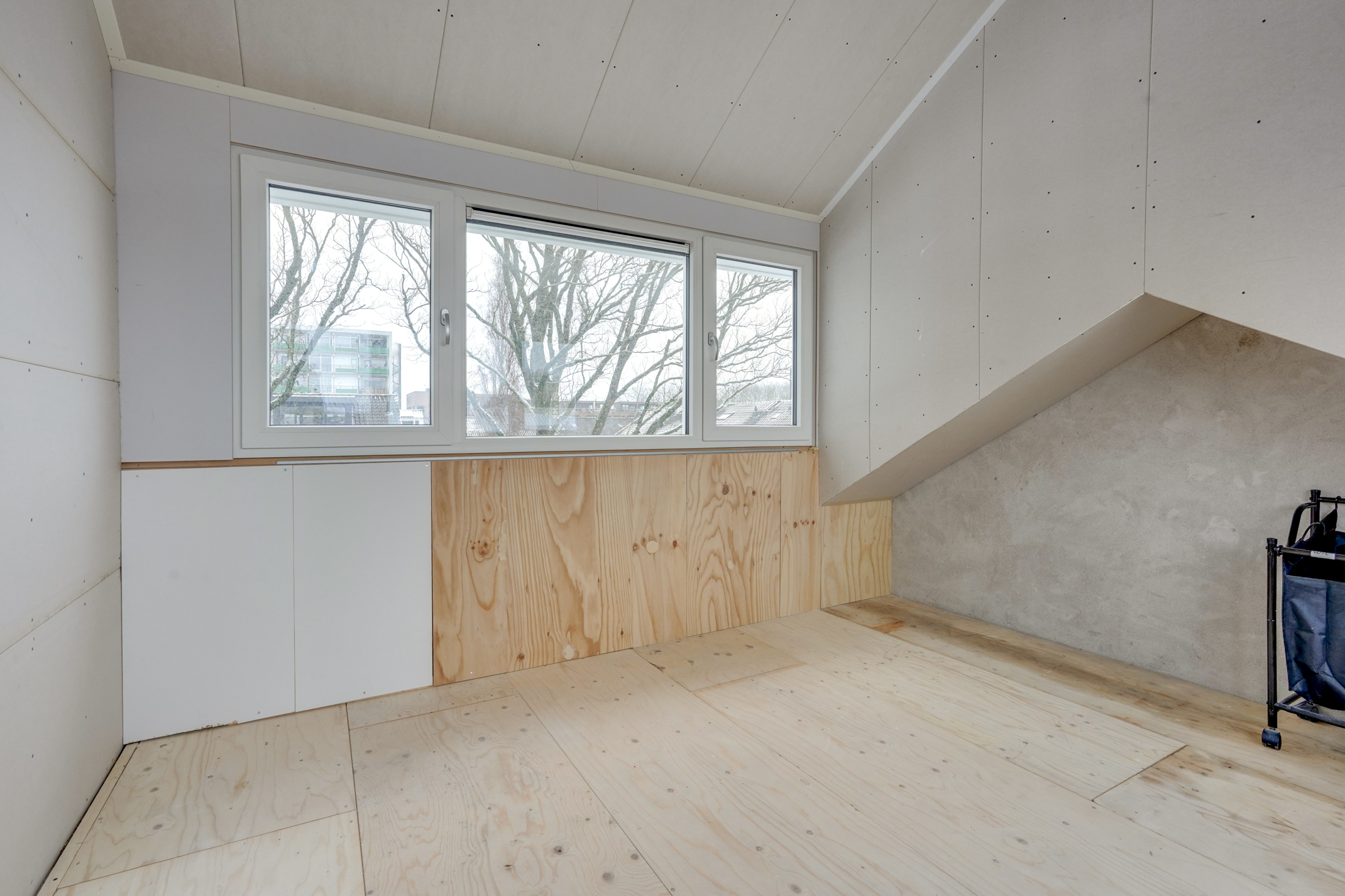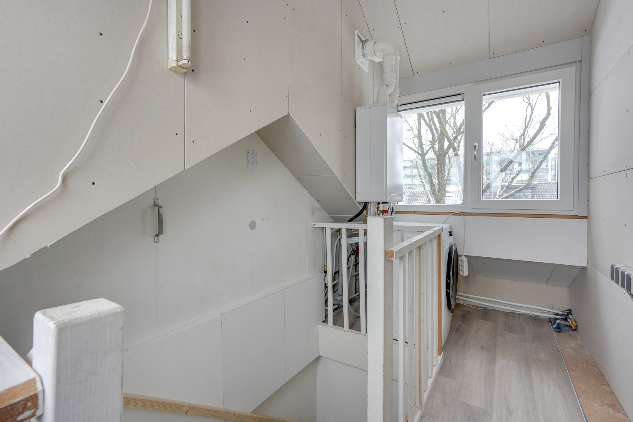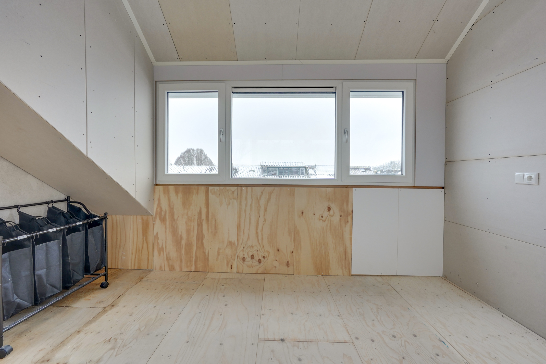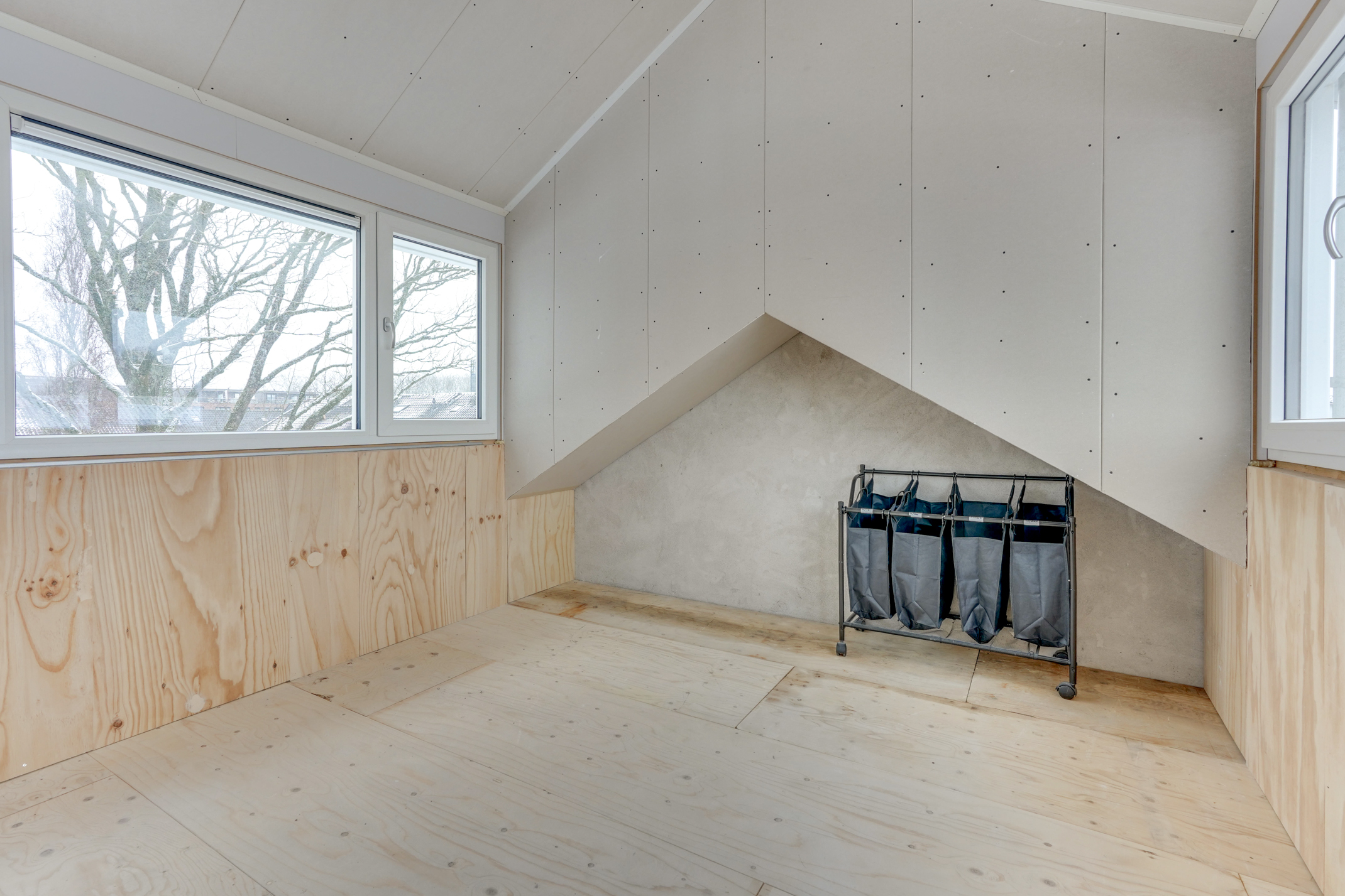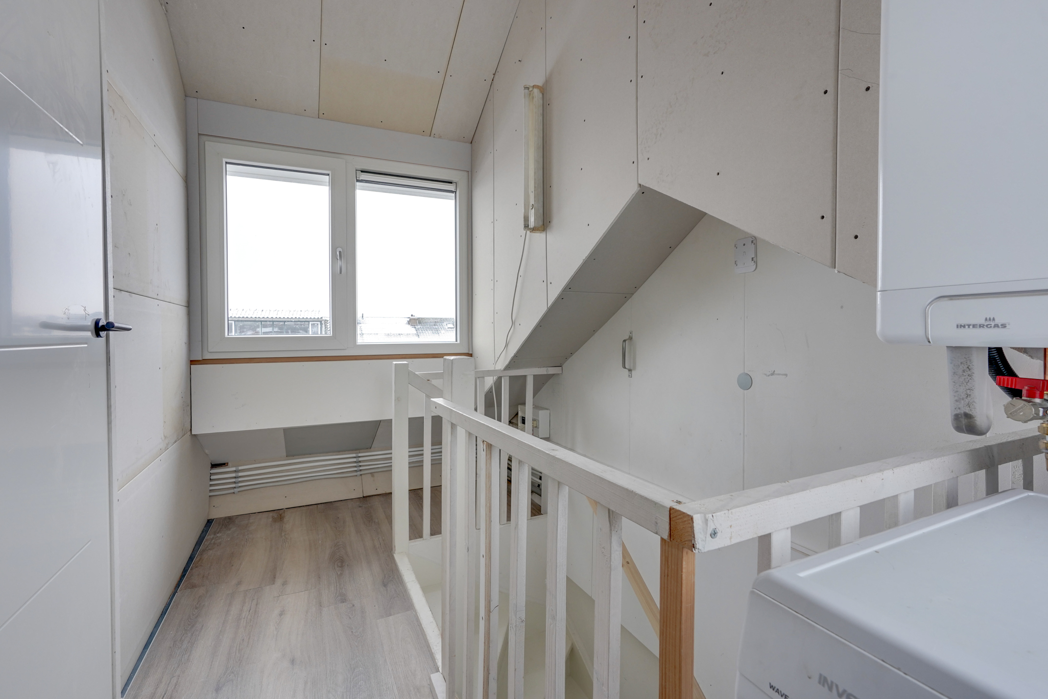 2e verdieping: Via een vaste trap bereiken we de ruime zolderverdieping waar recent een dakopbouw is geplaatst. Direct naast de trap is aansluiting voor wasmachine en droger. De zolderverdieping dient nog afgewerkt te worden.