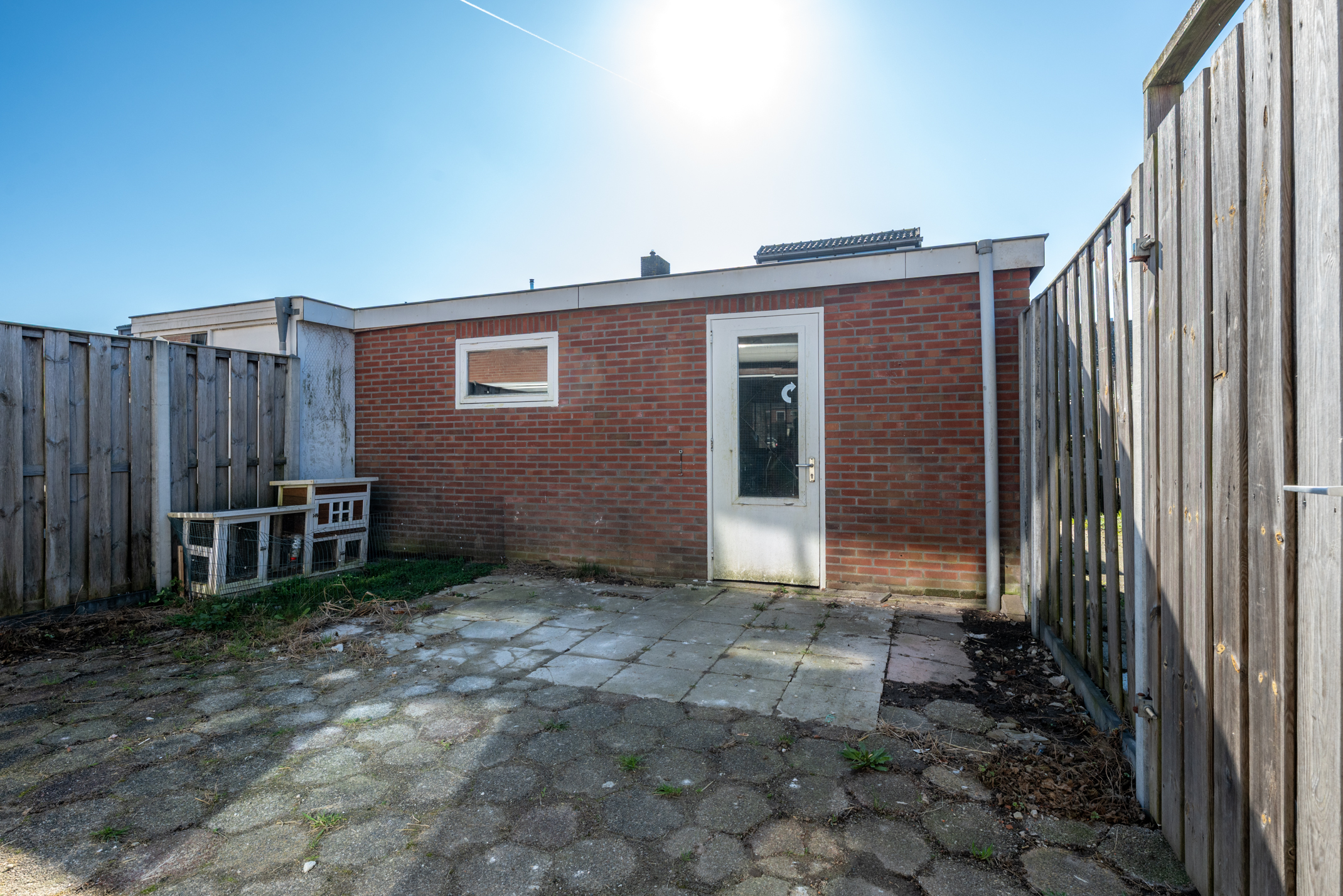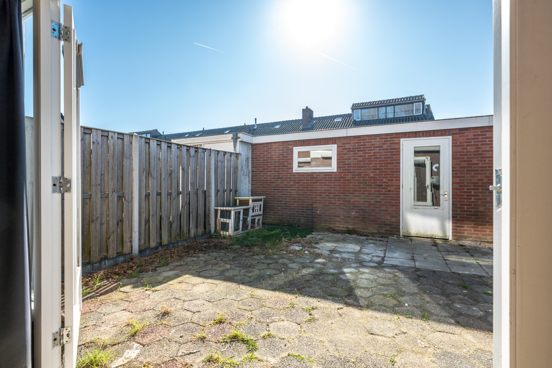 Achtertuin: De betegelde achtertuin met grote bergschuur, buitenkraan en achterom is gelegen op het zonnige zuiden. Een elektrisch zonnescherm biedt voldoende schaduw in de tuin en in huis.