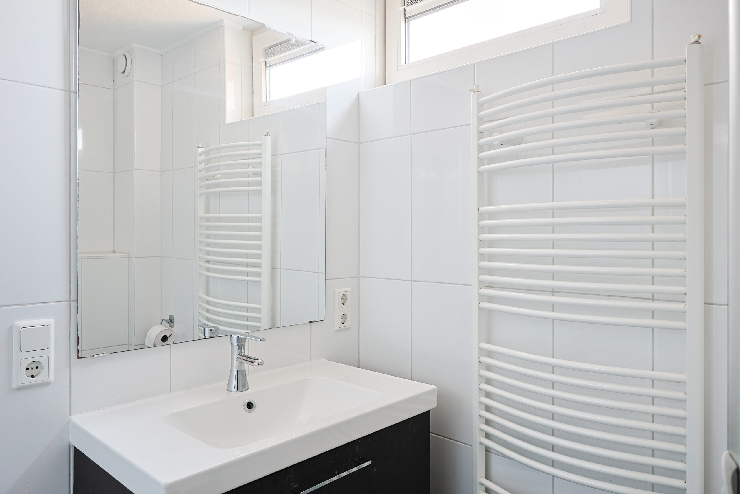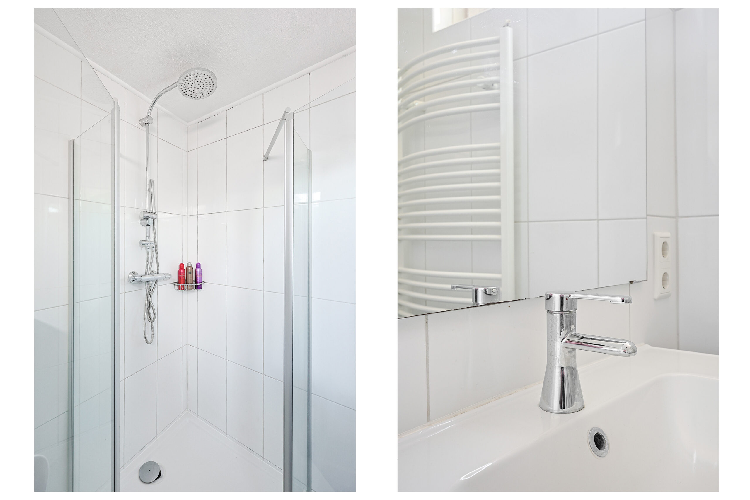 1STE VERDIEPING: overloop met toegang naar 3 mooie slaapkamers van respectievelijk circa 12,1 m2, 9,0 m2 en 14 m2. De moderne badkamer is voorzien van een douchecabine, designradiator, wastafelmeubel en 2de toilet. Ook deze gehele verdieping is voorzien van een mooie pvc visgraatvloer afwerking.
