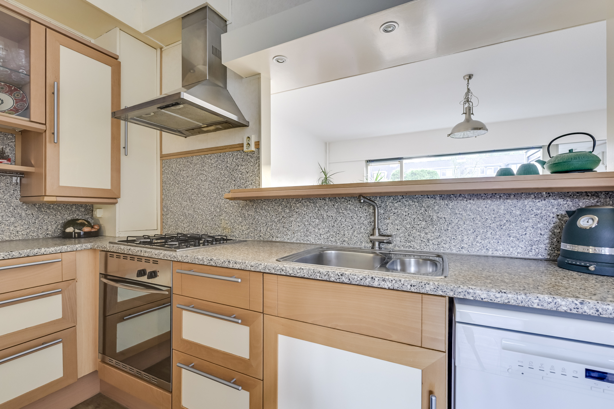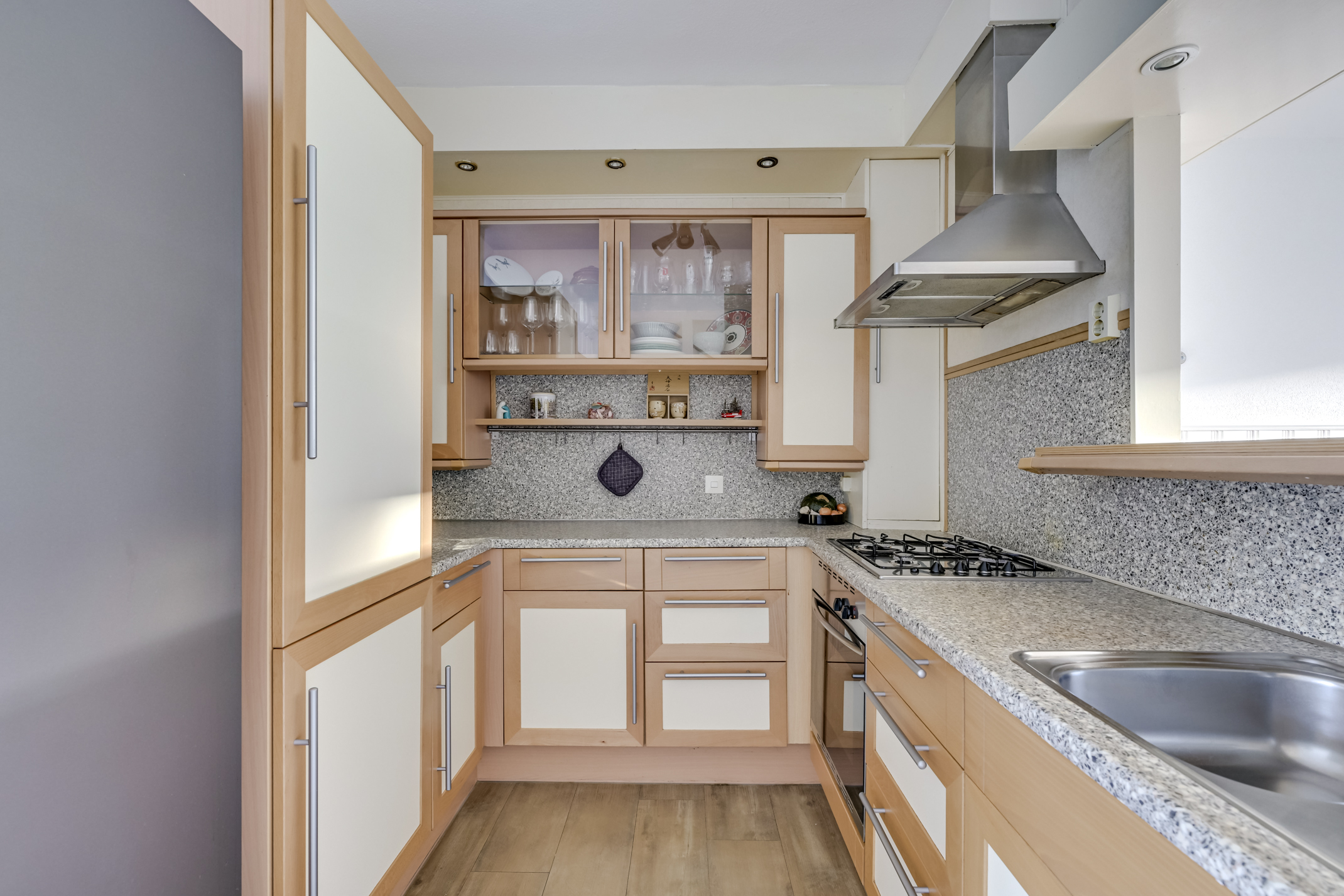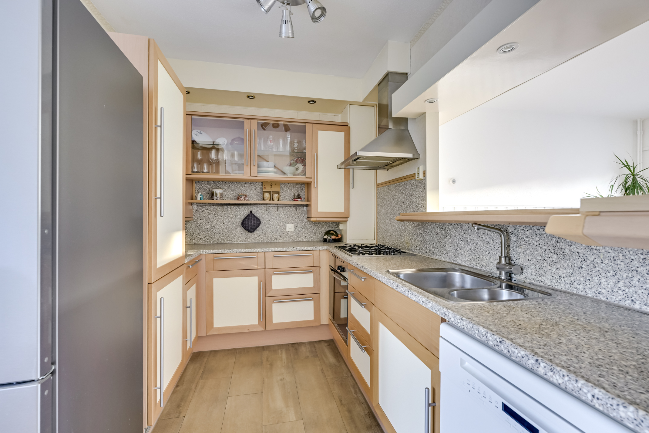 – U-vormige keuken voorzien van o.a. vaatwasser, koel-/vriescombinatie, gaskookplaat en oven.