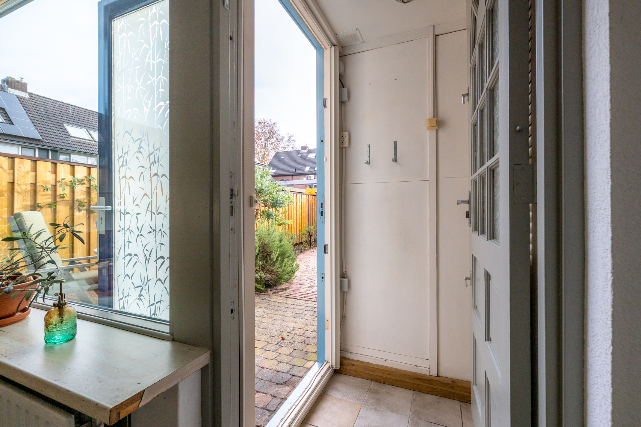 Entree met hal, meterkast en toiletruimte. De ruime doorzonwoonkamer is licht en prettig ingedeeld. In het midden van de woonkamer bevindt zich de keuken, waardoor aan de voorzijde een eetgedeelte is gecreëerd en aan de achterzijde een tuingerichte zithoek. Vanuit de woonkamer bereik je de diepe, zonnige achtertuin welke veel privacy biedt. De gehele begane grond is voorzien van een fraaie pvc-vloer.