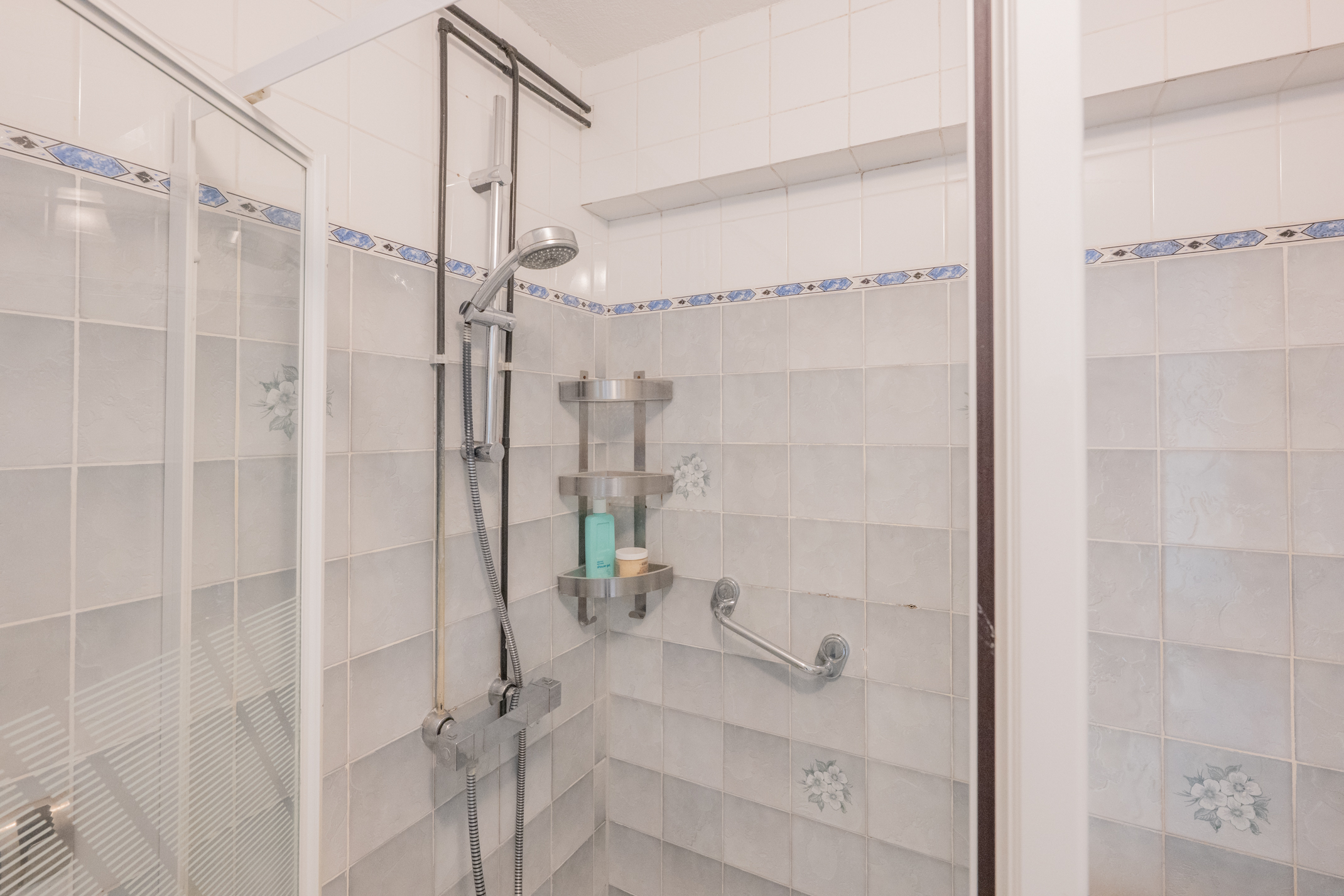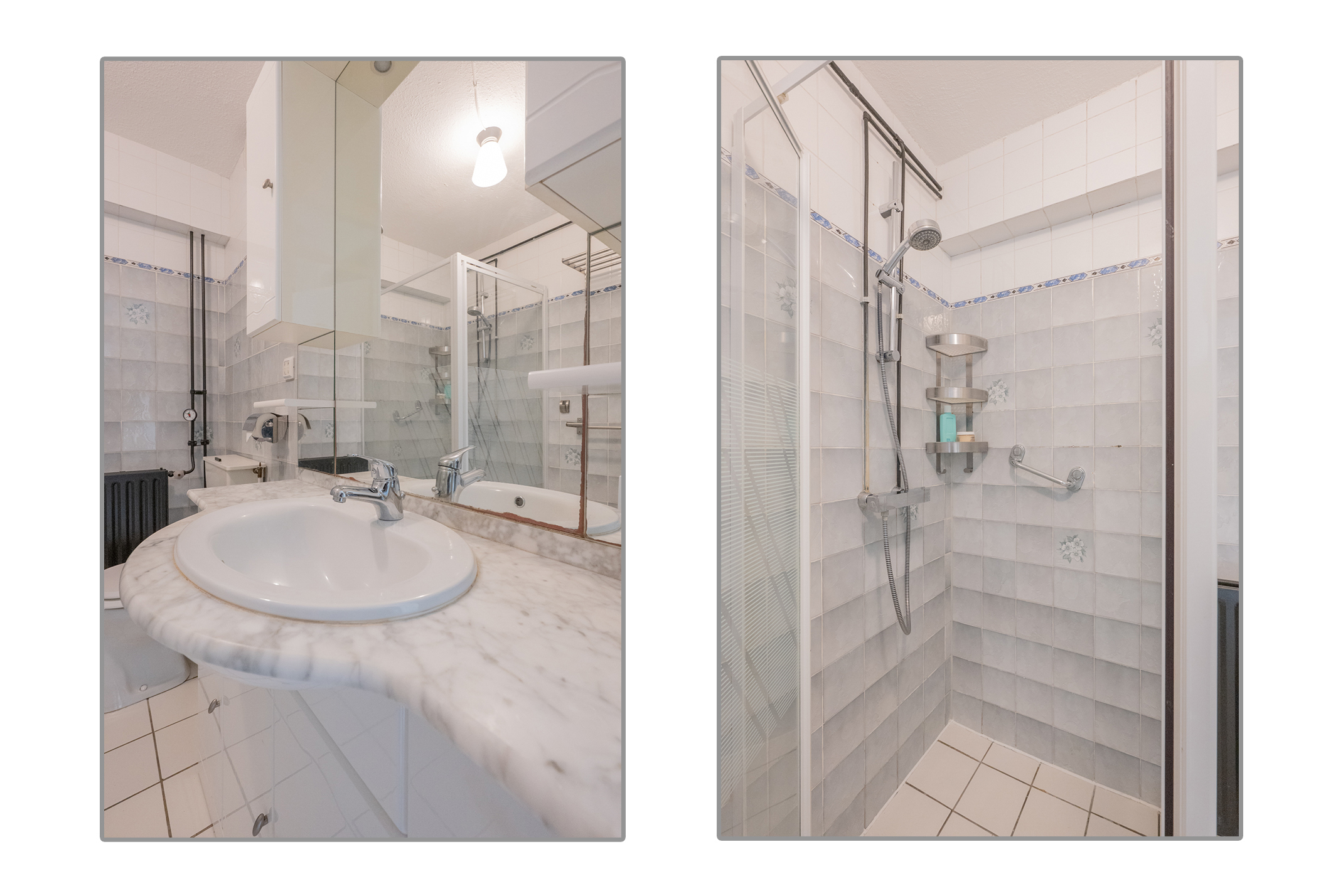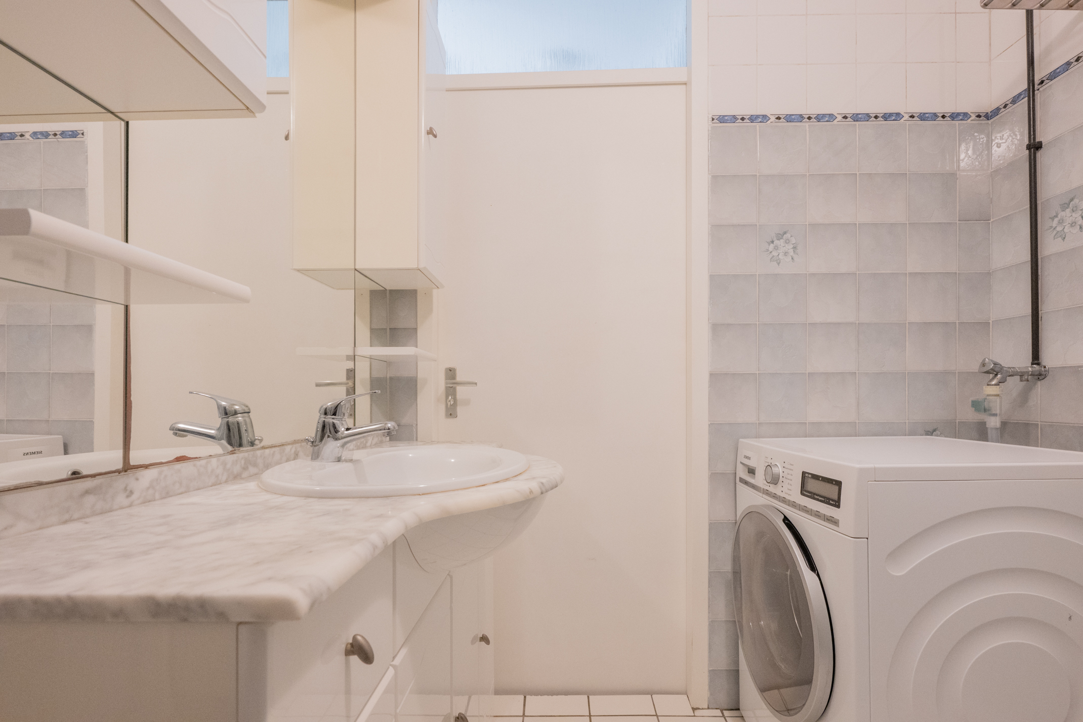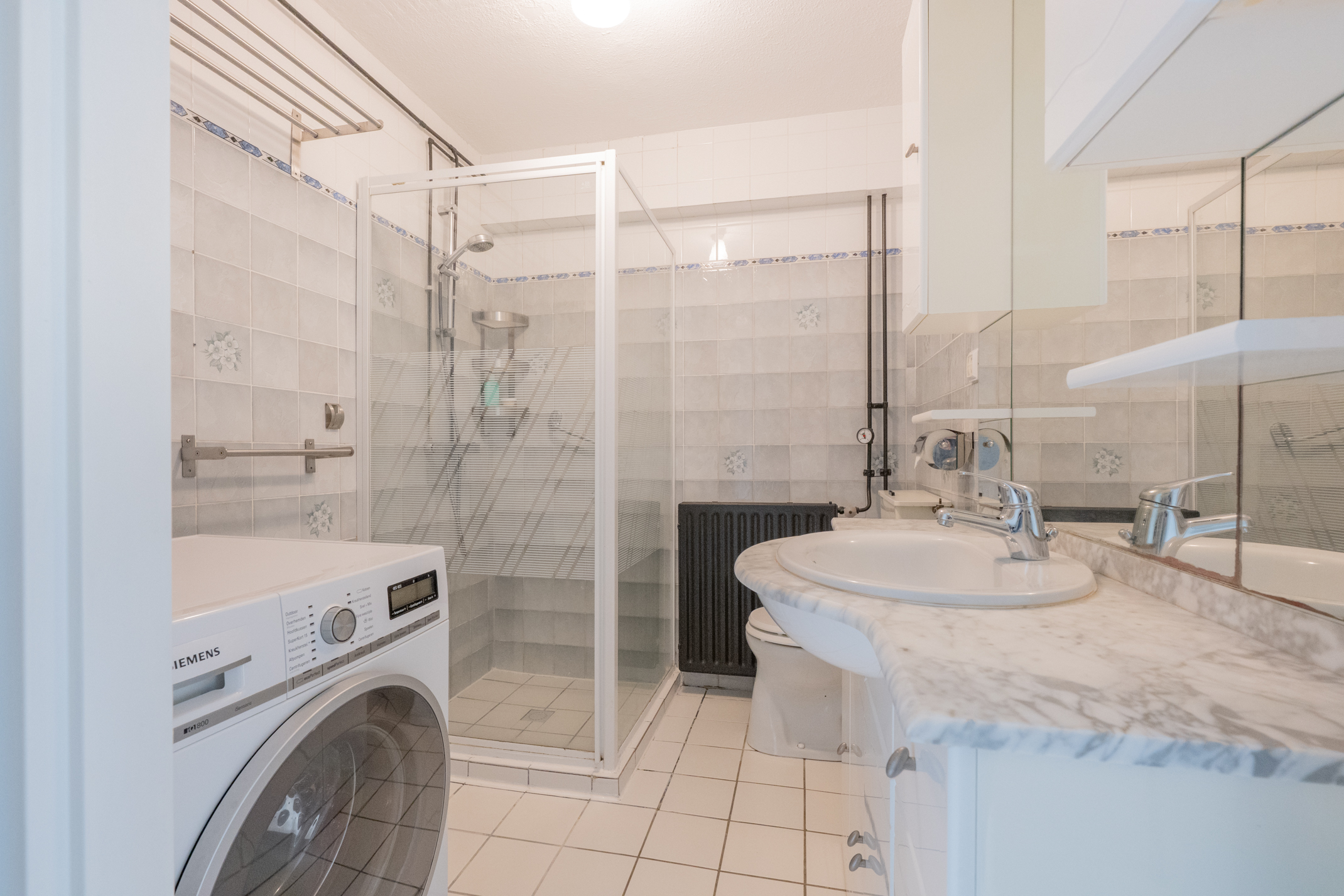 – Moderne badkamer met tweede toilet, douchecabine en ruim wastafelmeubel.