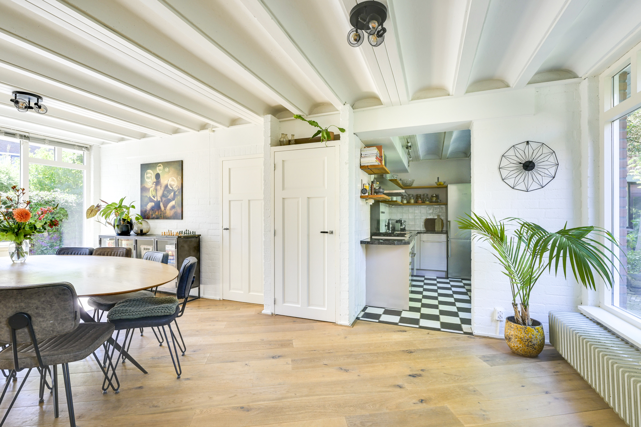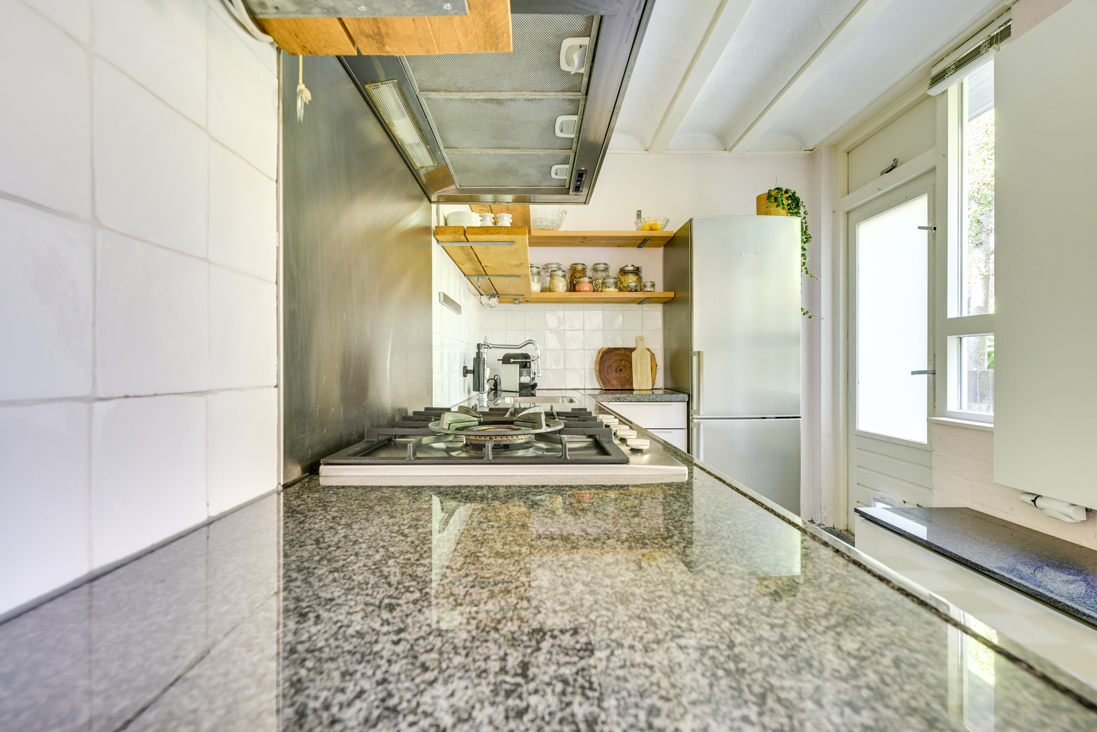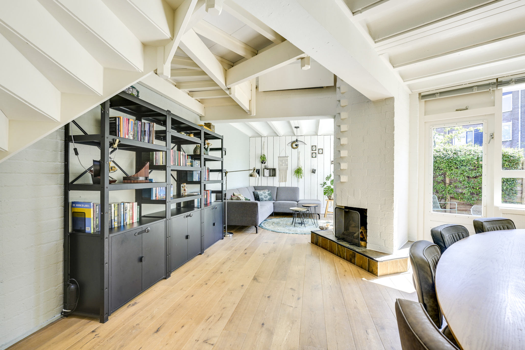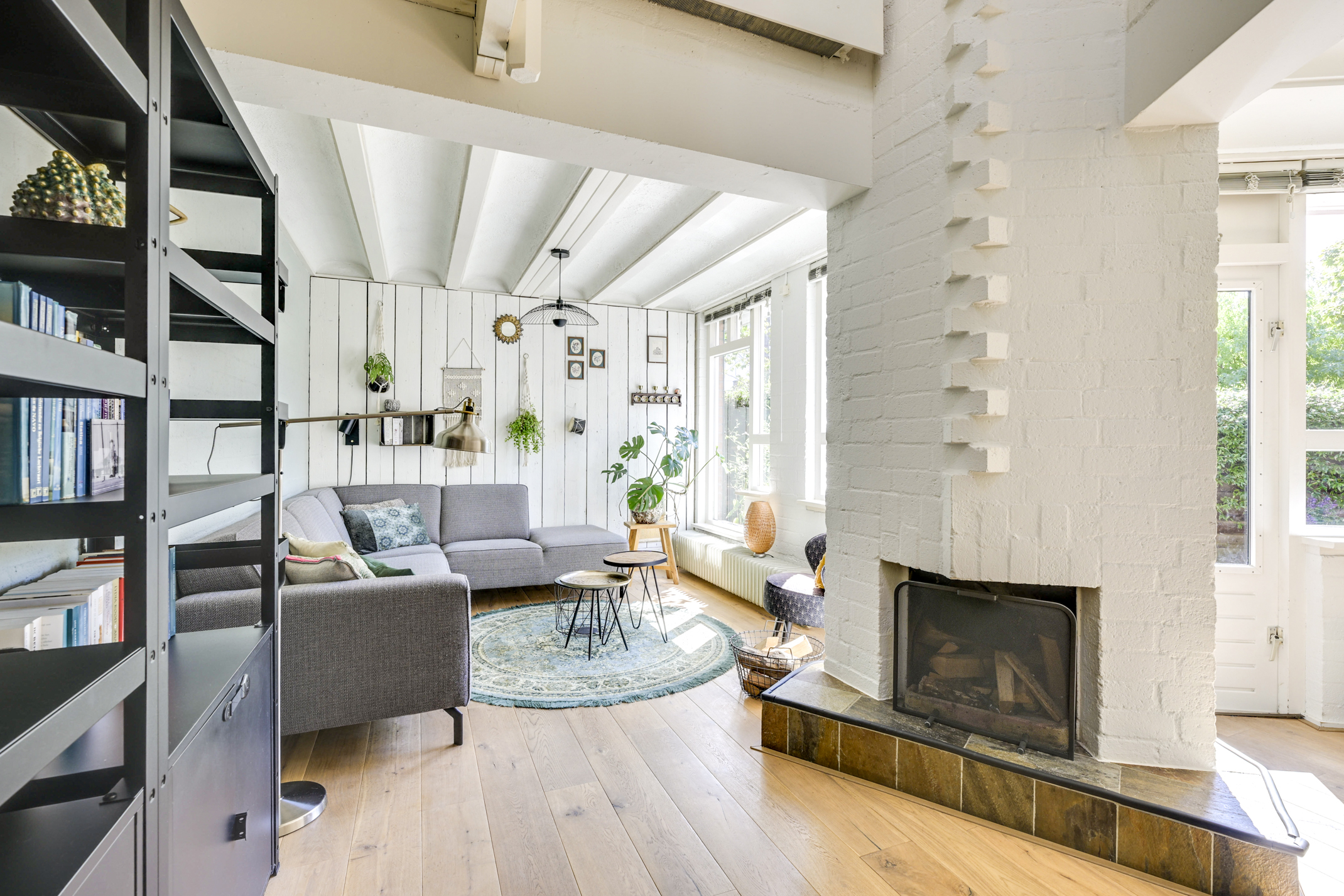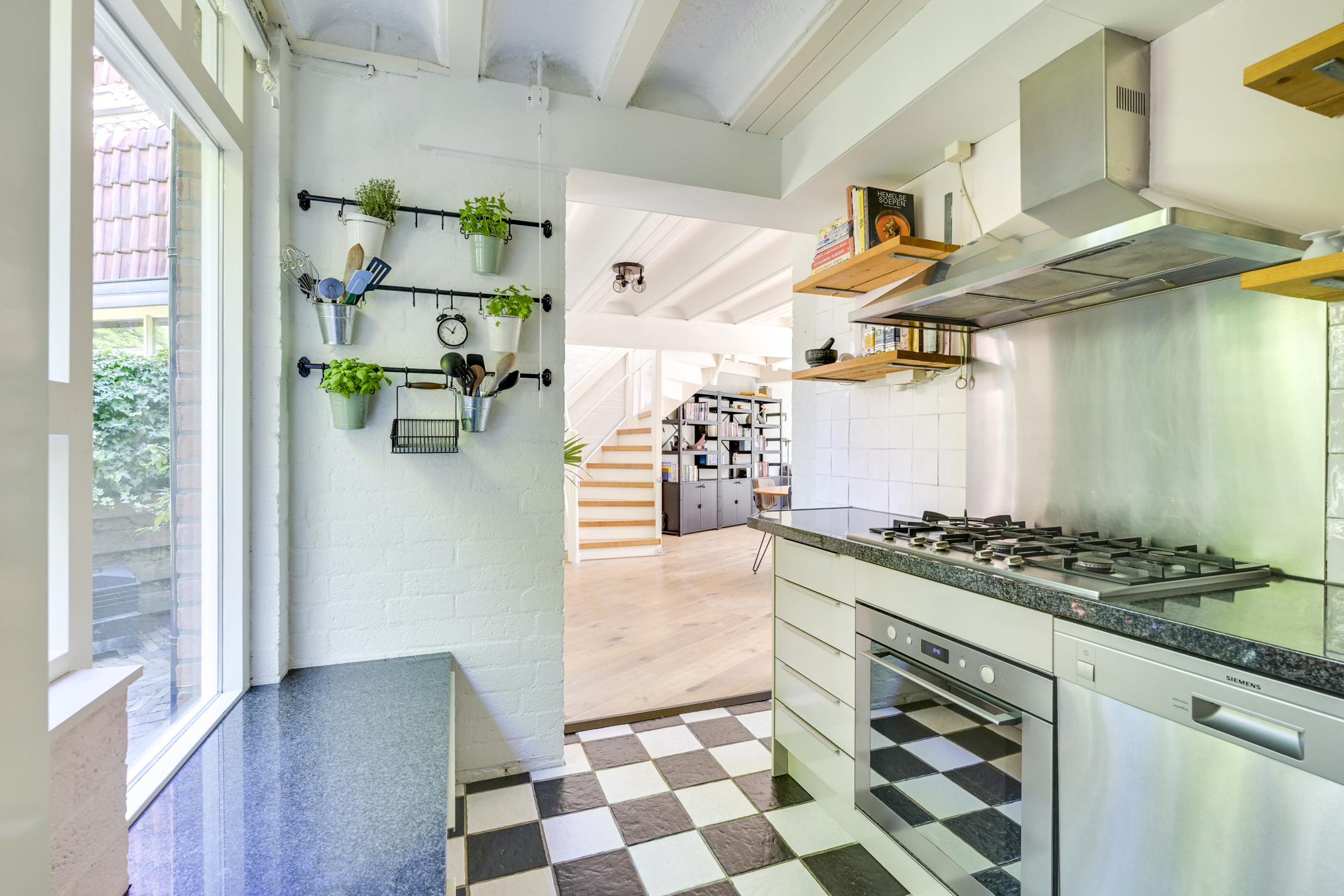 Vernieuwde hal met meterkast, moderne toiletruimte met hangend toilet, toegang naar de inpandige berging en woonkamer. Via mooie paneeldeur toegang naar de ruime en speelse woonkamer. Door de vele raampartijen is er een lichte en prettige woonkamer ontstaan. De woonkamer is circa 48m2 en biedt u de mogelijkheid om verschillende indelingen te maken. De woonkamer is voorzien van een vergrijsde eikenvloer, openhaard en vide partij. Tevens heeft de woonkamer op 2 verschillende plaatsen een deur voor gemakkelijke toegang naar de voortuin. Aansluitend is de halfopen keuken gesitueerd welke is voorzien van een moderne, L-vormige inbouwkeuken met de diverse inbouwapparatuur. Vanuit de keuken heeft u toegang tot de tuin.
